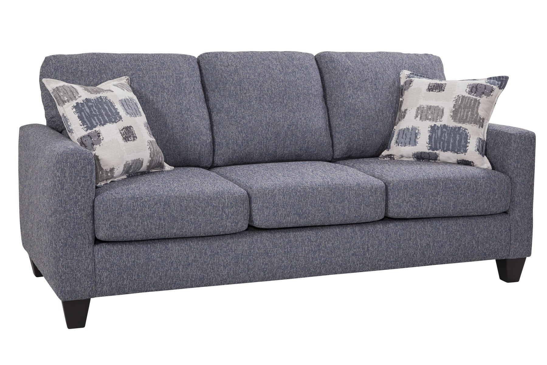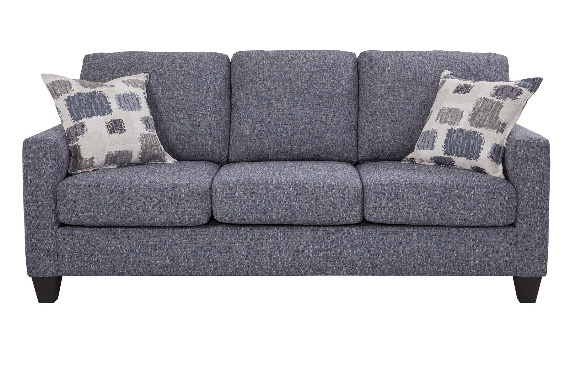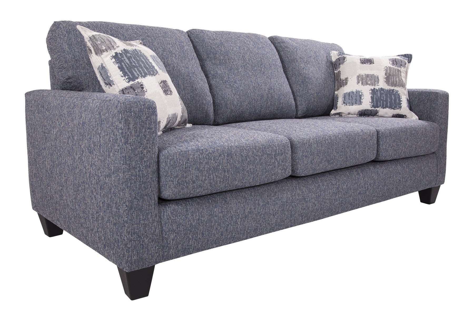 Looking for a smaller scale sofa with lots of style? This is it. A modern track arm profile with three over three cushion seating. The fabric is a grey/blue that is very versatile. Two accent pillows in an abstract jacquard add a statement of grey blue and brown on an ivory background. This sofa seats three comfortably and can fit into any floorplan. The seat cushions are reversible for extra wear and tear.