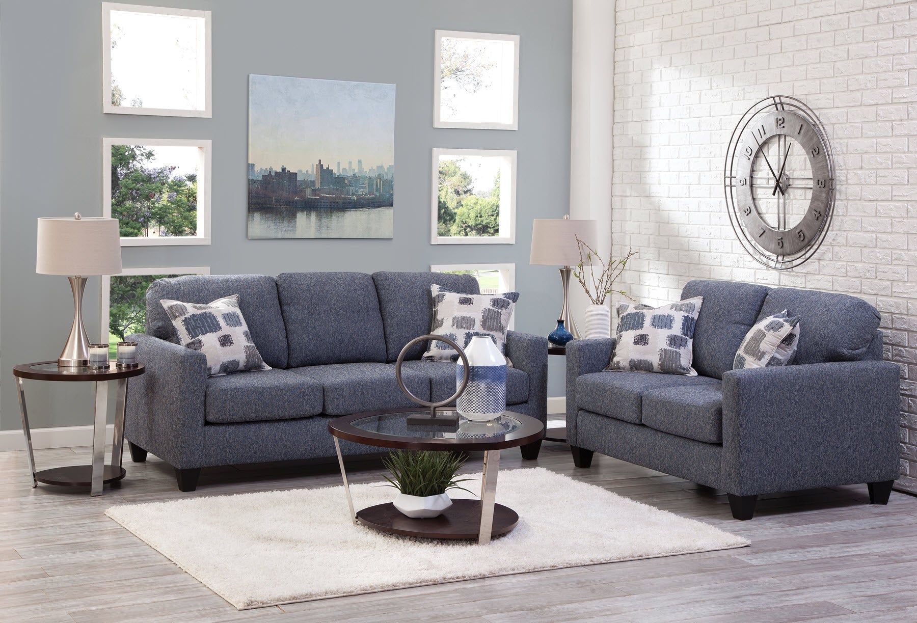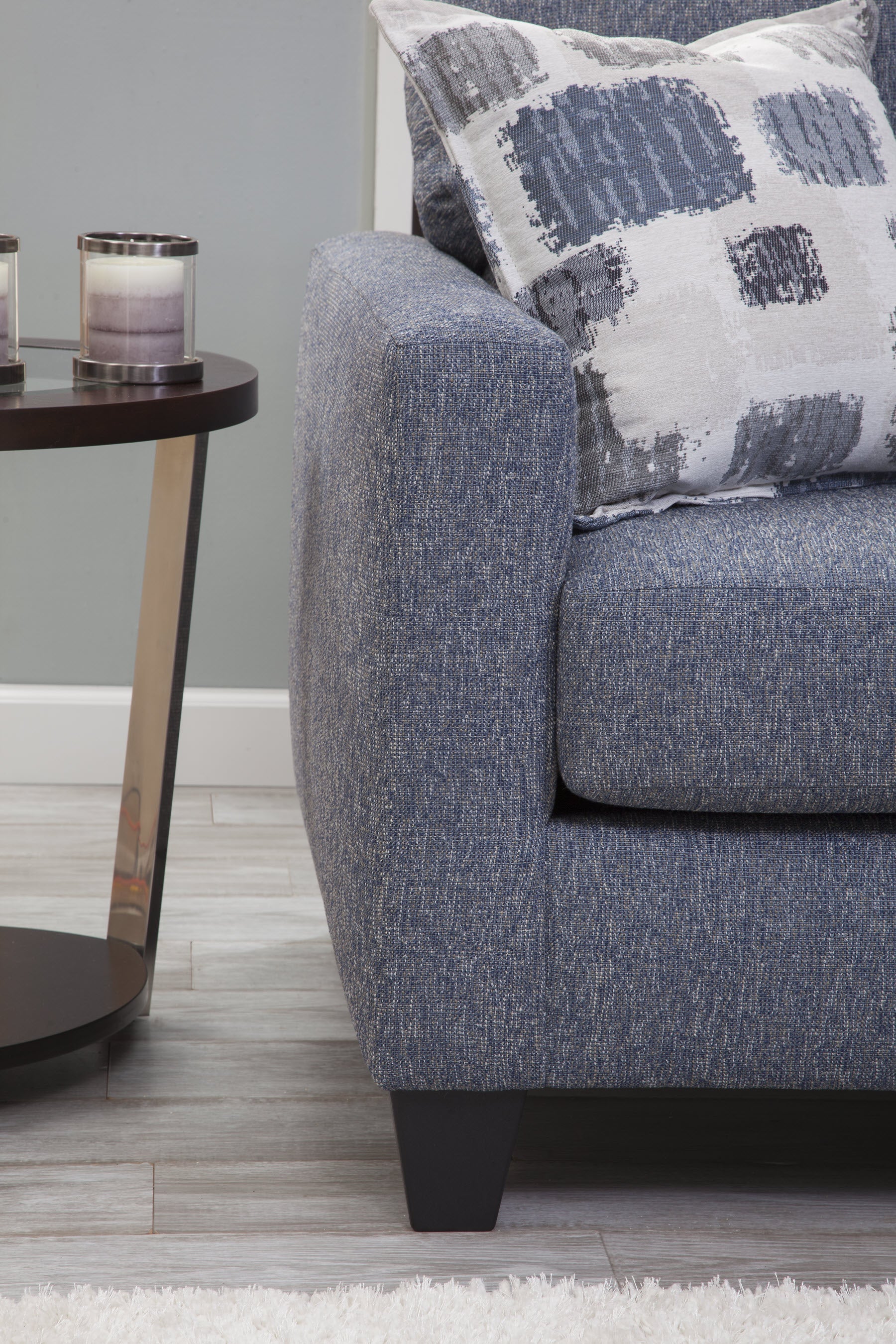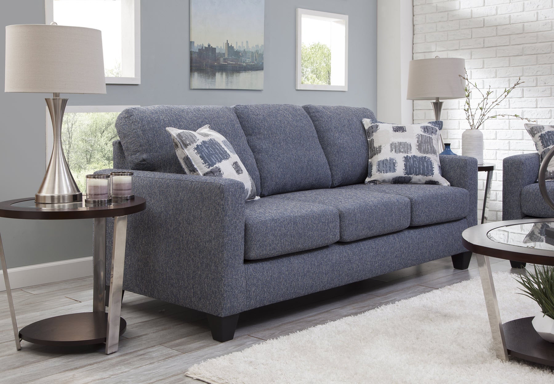 Looking for a smaller scale sofa with lots of style? This is it. A modern track arm profile with three over three cushion seating. The fabric is a grey/blue that is very versatile. Two accent pillows in an abstract jacquard add a statement of grey blue and brown on an ivory background. This sofa seats three comfortably and can fit into any floorplan. The seat cushions are reversible for extra wear and tear.