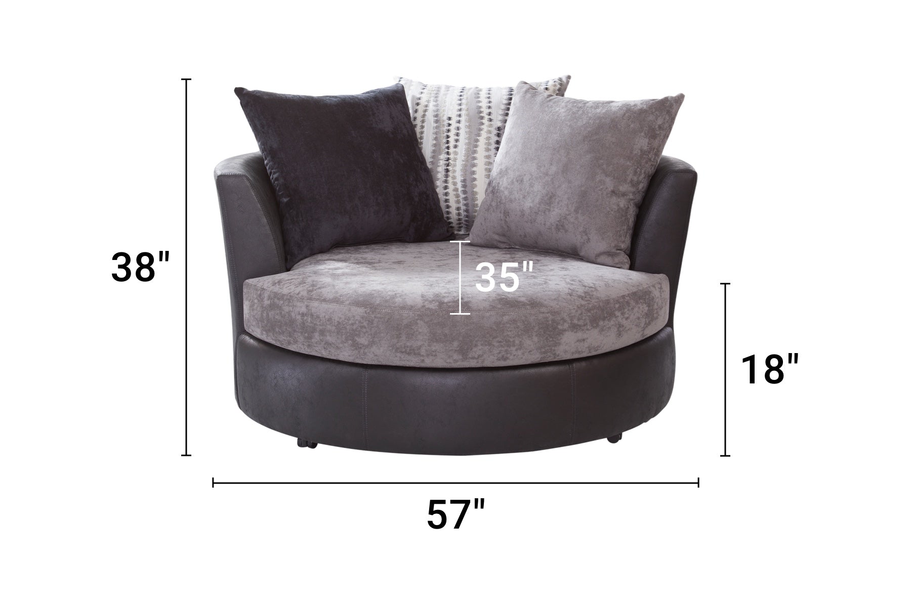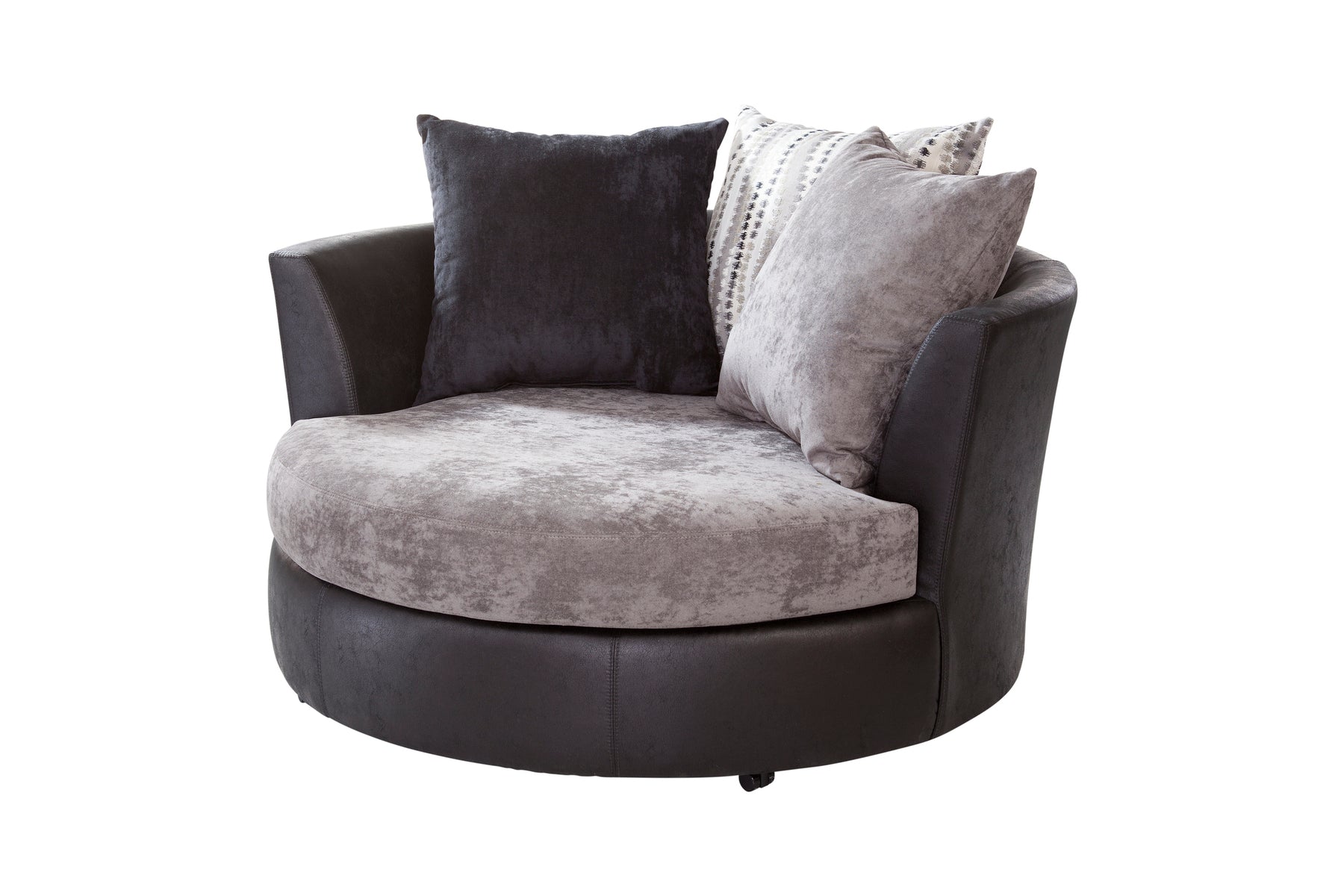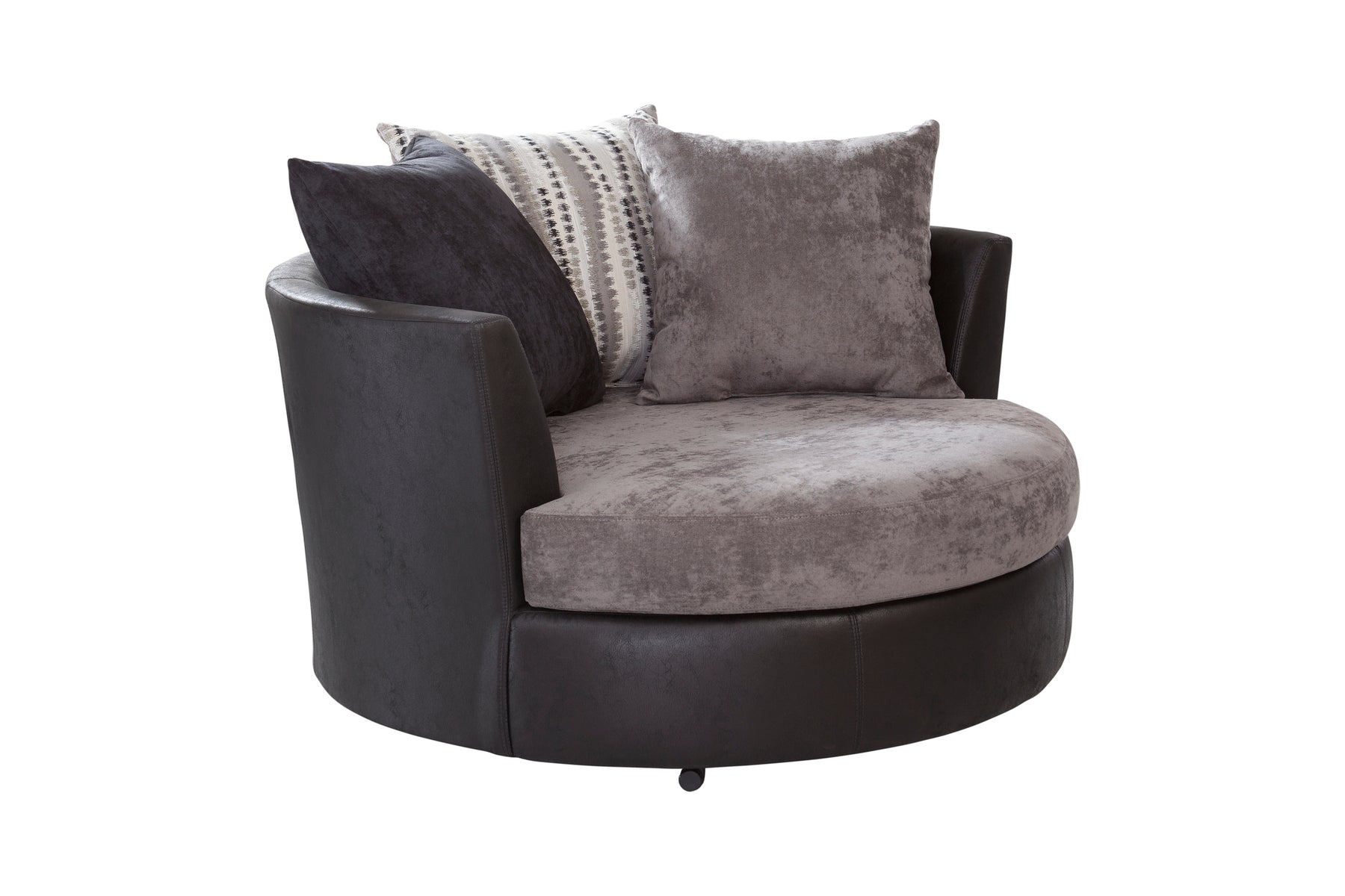 This oversized barrel swivel chair is a two-tone combination of black vegan leather and charcoal gray chenille. Back accent pillows in charcoal grey and black chenille along with a broken line pillow with metallic sparkle accents. Non-reversible seat cushion with loose back pillows. This combination gives you a chair with style and comfort. This barrel chair can seat two people.