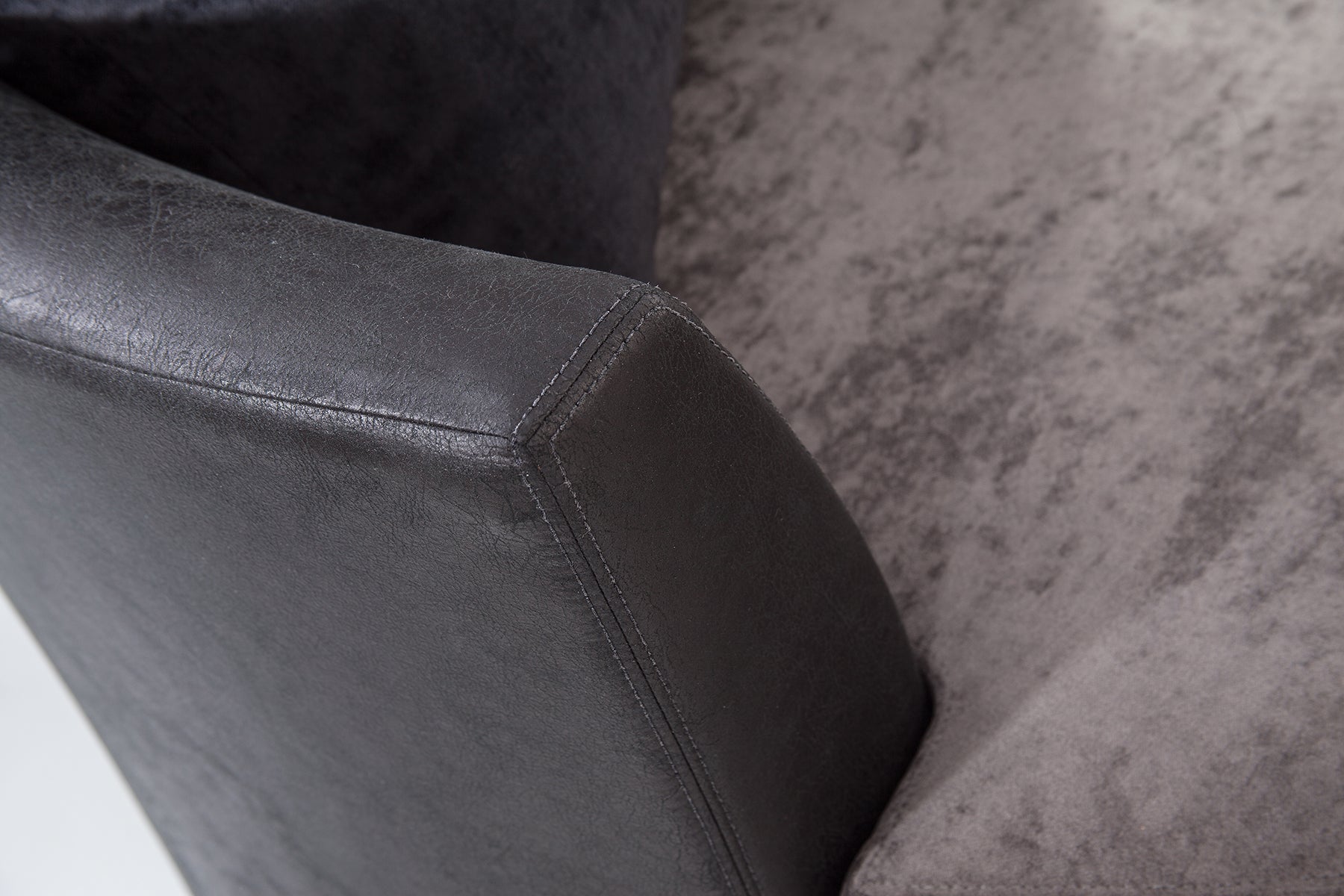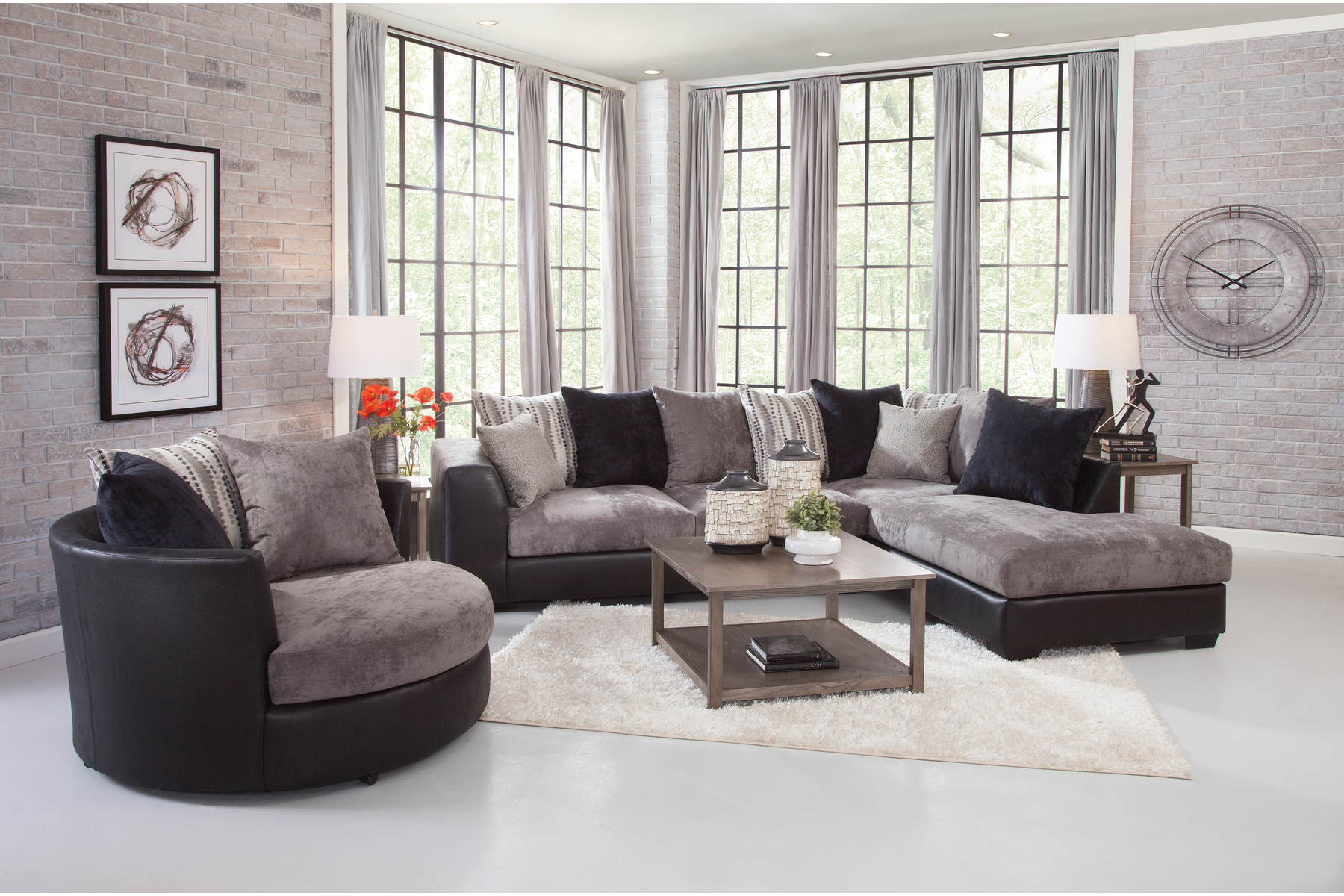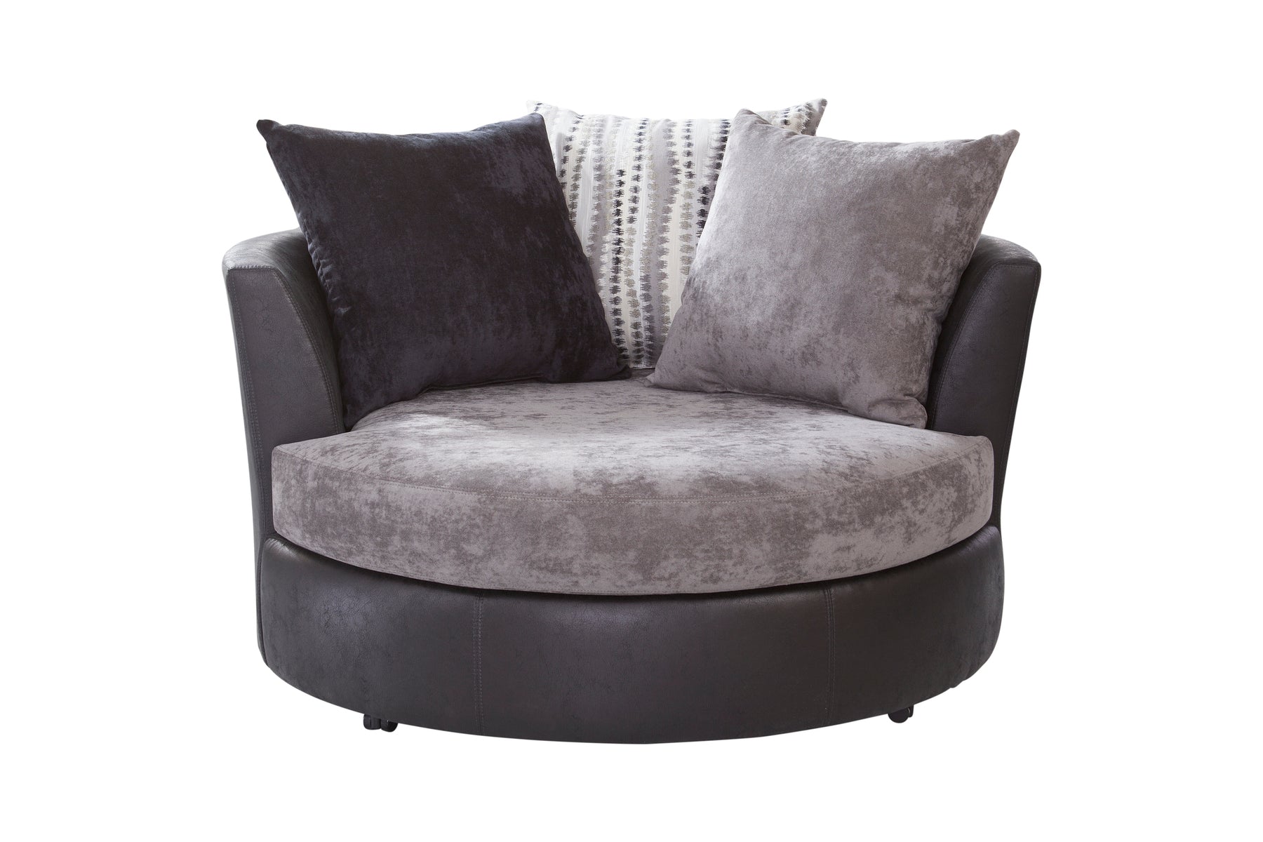 This oversized barrel swivel chair is a two-tone combination of black vegan leather and charcoal gray chenille. Back accent pillows in charcoal grey and black chenille along with a broken line pillow with metallic sparkle accents. Non-reversible seat cushion with loose back pillows. This combination gives you a chair with style and comfort. This barrel chair can seat two people.