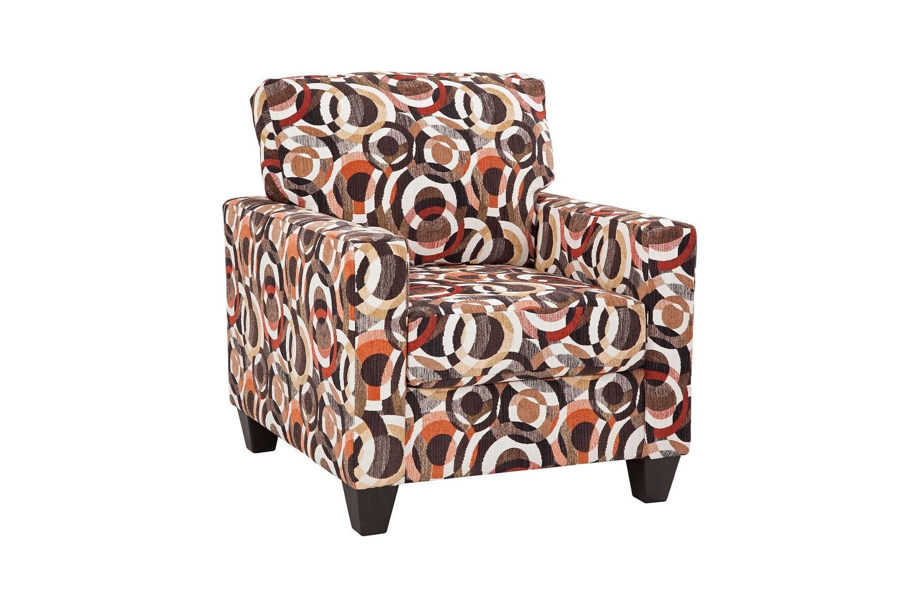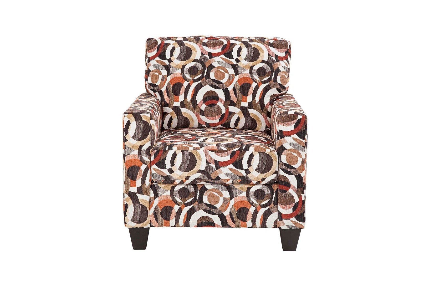This square arm accent chair is an urban loft style in a fabric of circles in vibrant colors, red, orange gold and black on a white background. Provides clean crisp lines for a modern appeal and just the right amount of color to your home. Paired with our neutral charcoal sofa and loveseat this chair is sure to stand out!
