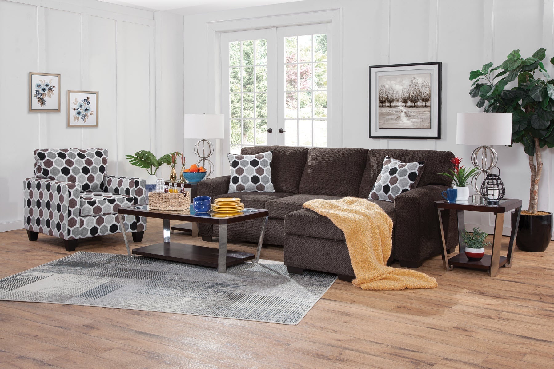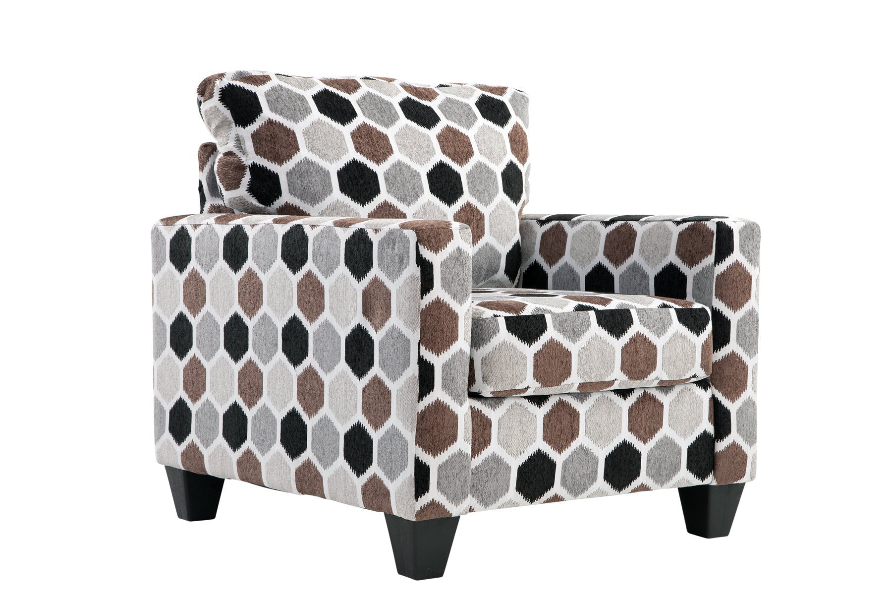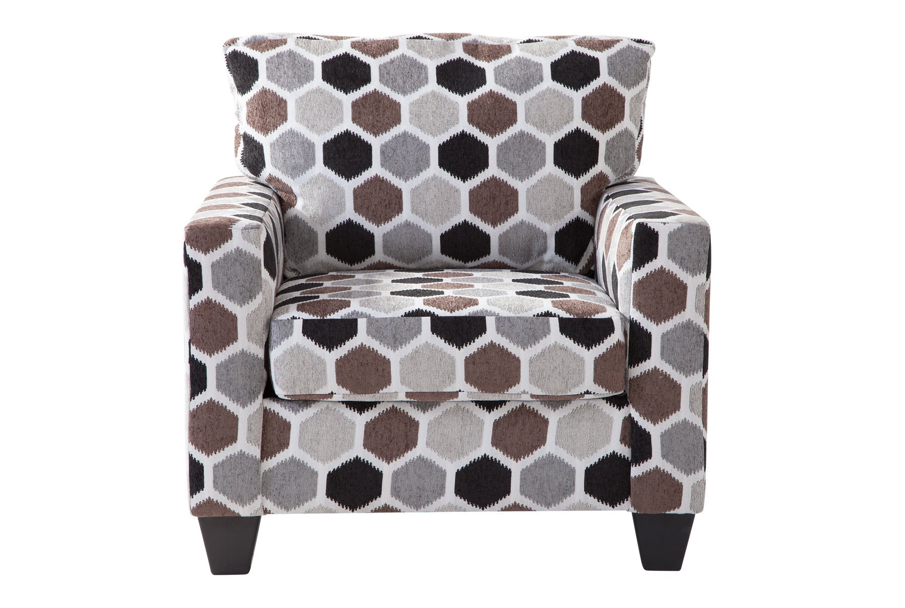This chair is a modern track arm style that can be incorporated into many lifestyles. This chair is covered in an eye-catching honey comb pattern. The back is attached and the seat cushion is non-reversible.