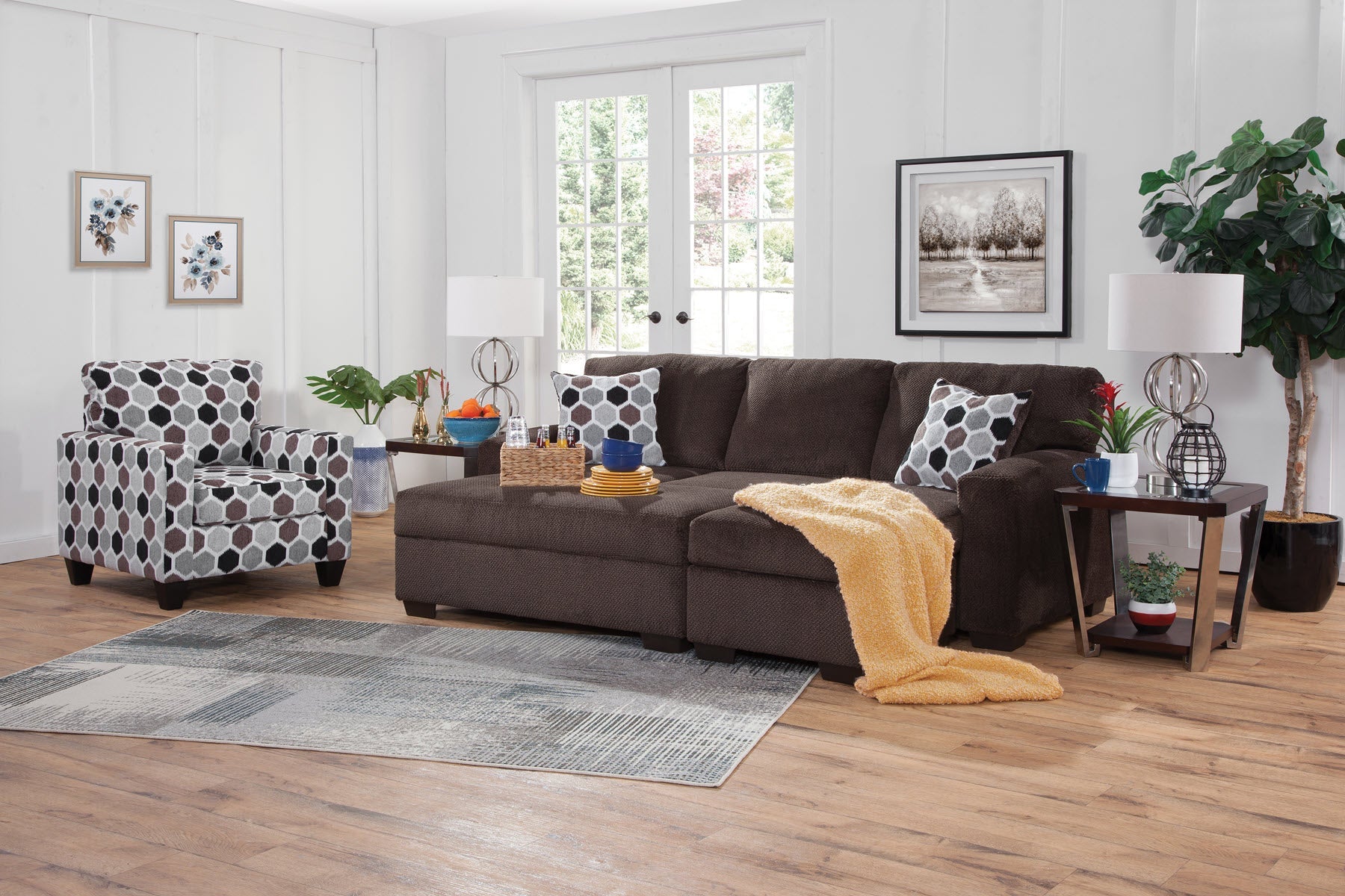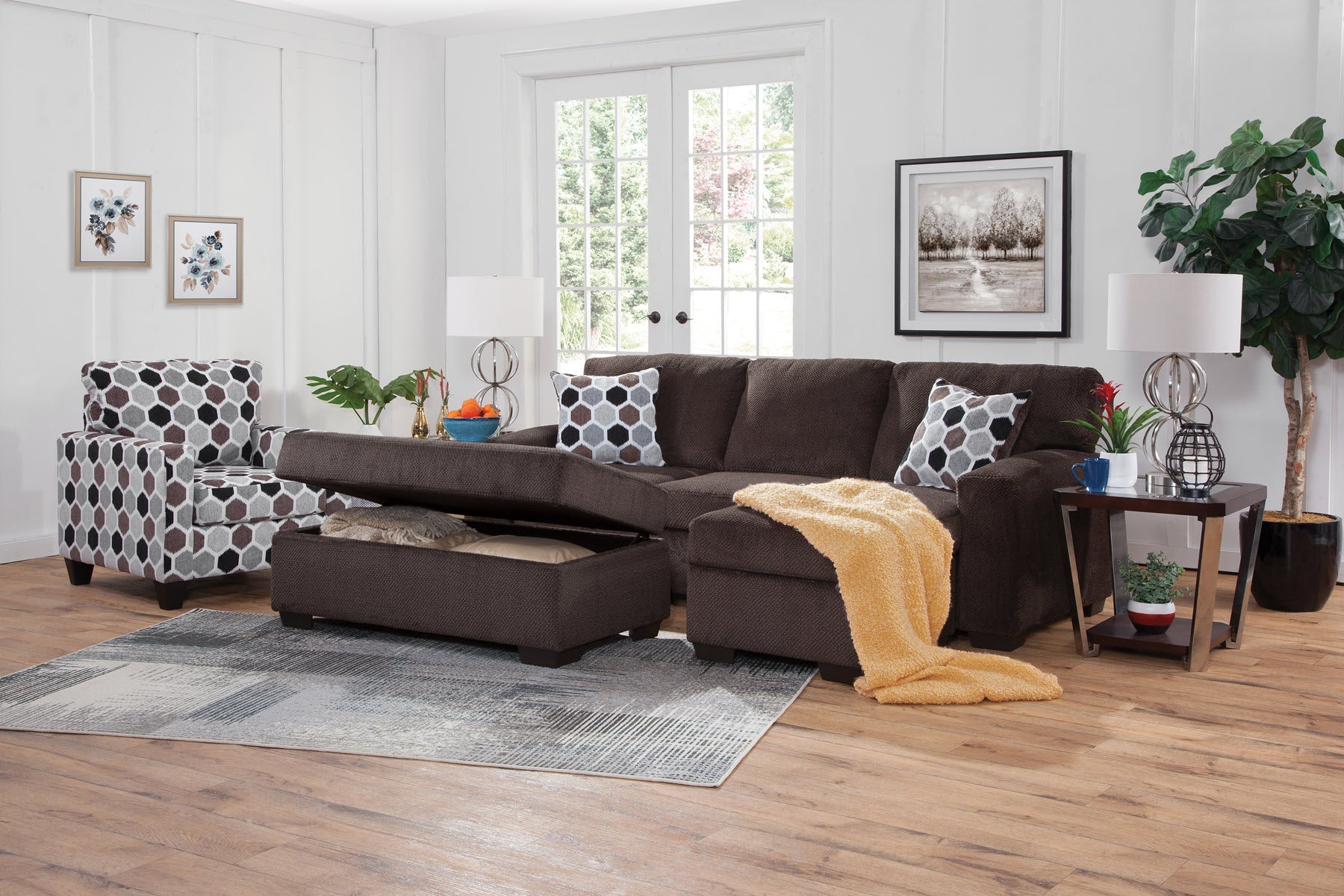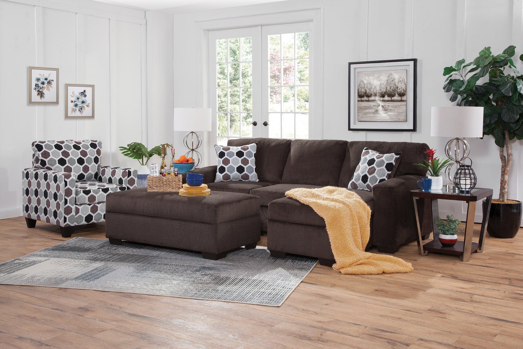 This chair is a modern track arm style that can be incorporated into many lifestyles. This chair is covered in an eye-catching honey comb pattern. The back is attached and the seat cushion is non-reversible.