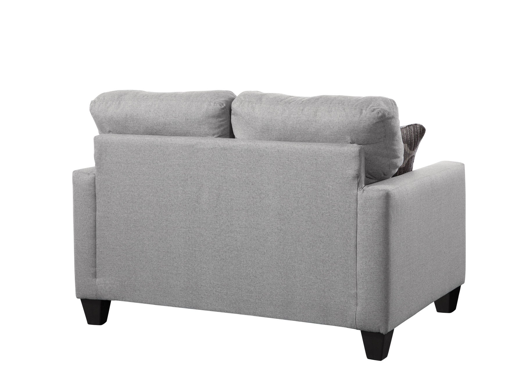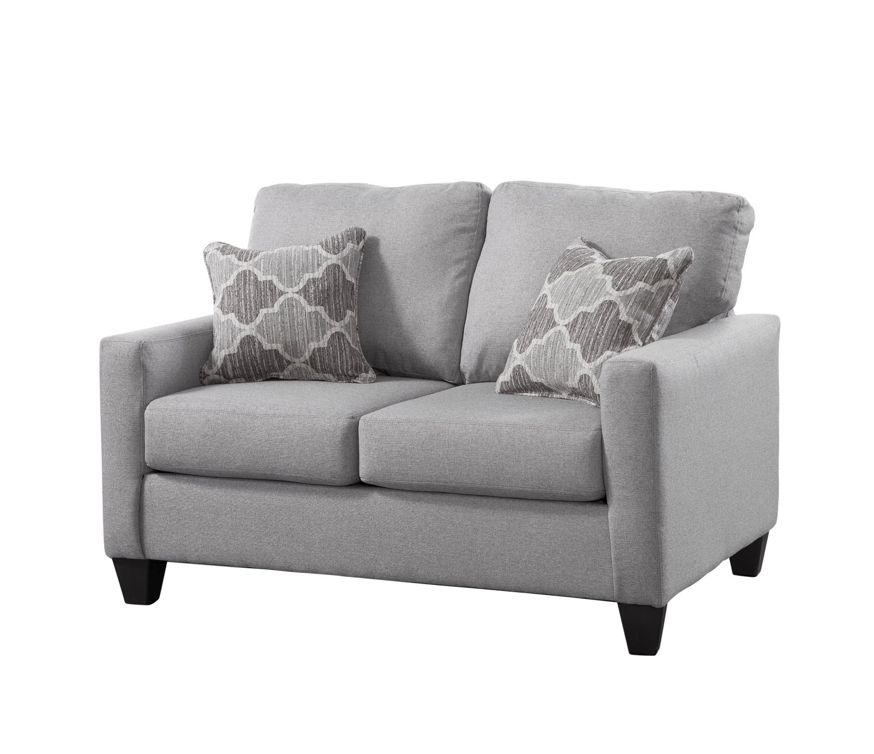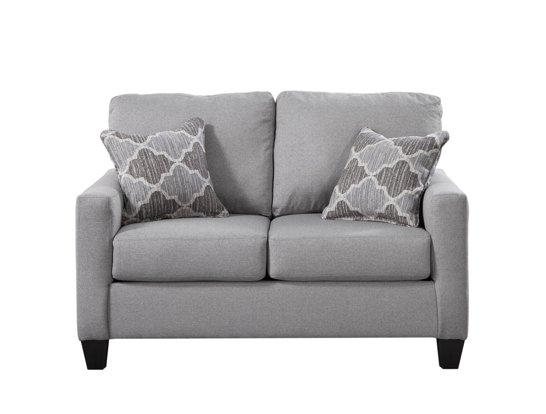 This is an urban loft track arm sofa that is sized well for small rooms or apartments. Its smaller foot print will fit into any floor plan. This small loveseat is in a great neutral and natural linen color woven fabric with two Moroccan tile motif pillows, which have shades of grey and brown. This square arm loveseat utilizes Revolution Performance fabrics. The back pillows are attached and the seat cushions are non-reversible. It has clean crisp lines for a modern appeal. This loveseat can seat two comfortably.