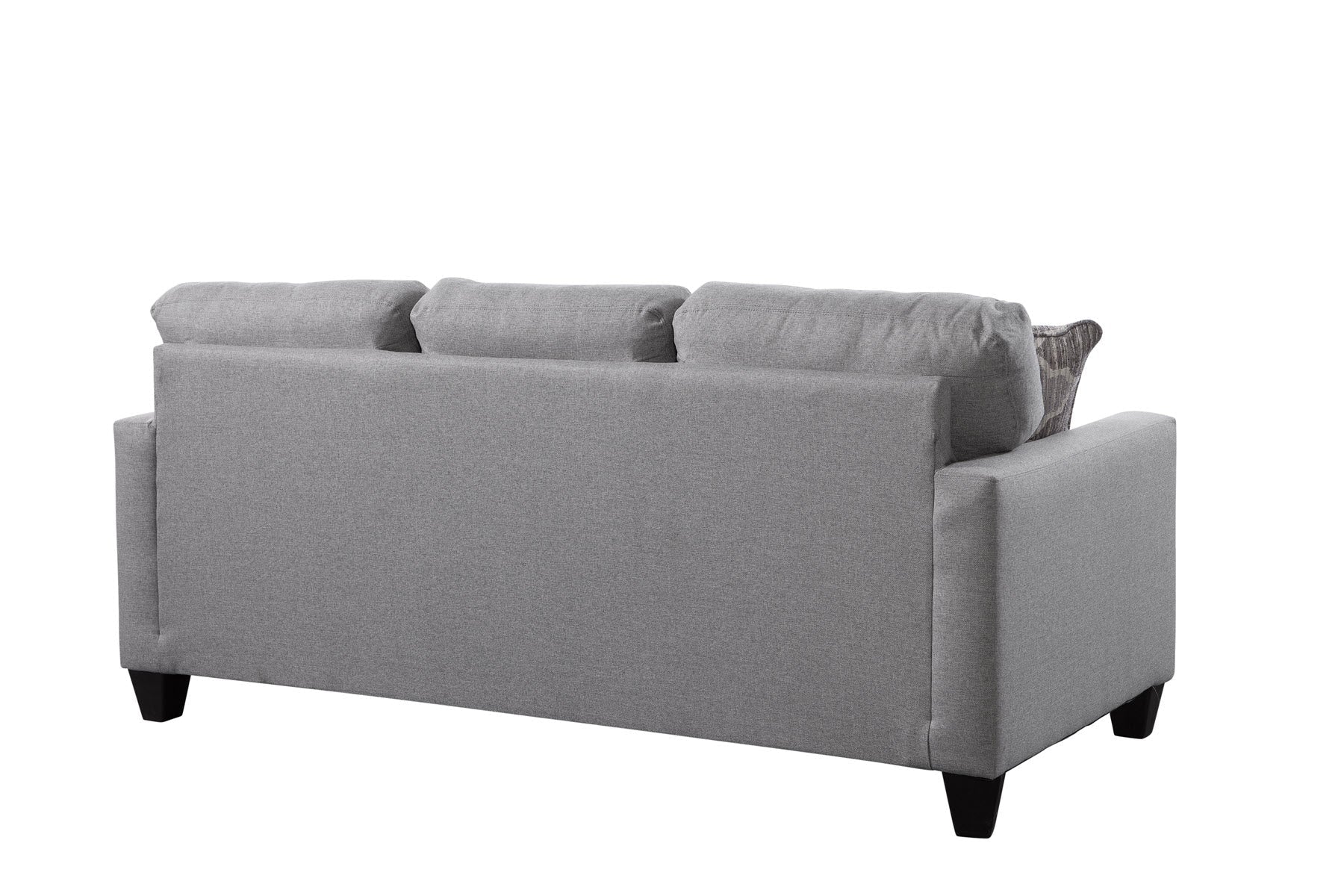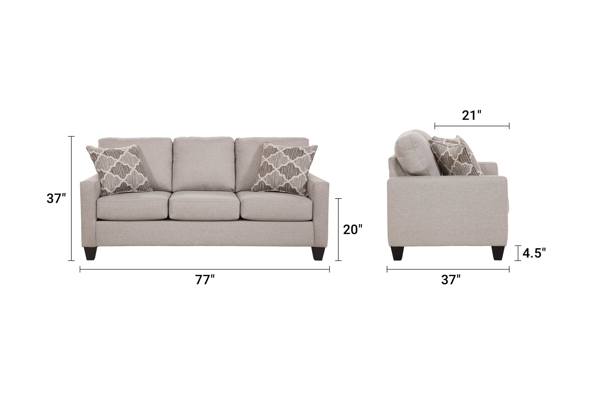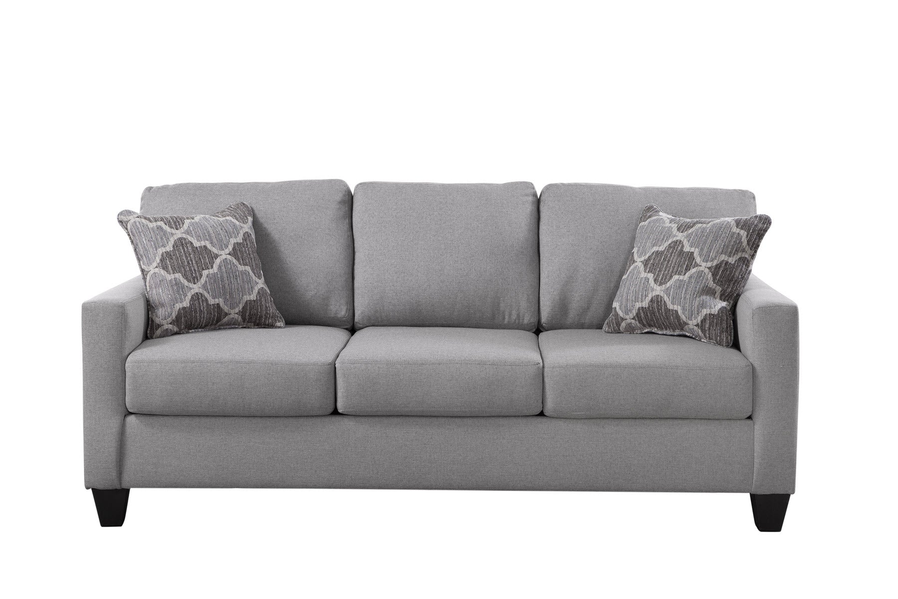 This is an urban loft track arm sofa that is sized well for small rooms or apartments. Its smaller foot print will fit into any floor plan. This sofa bed is in a great neutral and natural linen color woven fabric with two Moroccan tile motif pillows, which has shades of gray and brown. This sleeper sofa utilizes Revolution Performance fabrics. The back pillows are attached and the seat cushions are non-reversible. The sleeper has clean crisp lines for a modern appeal. This sofa can seat three comfortably.