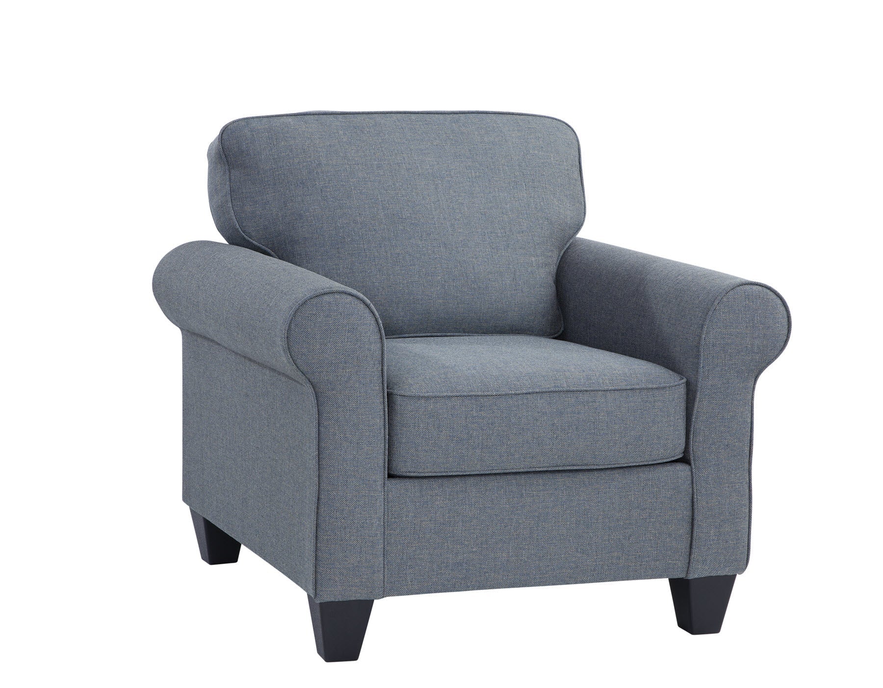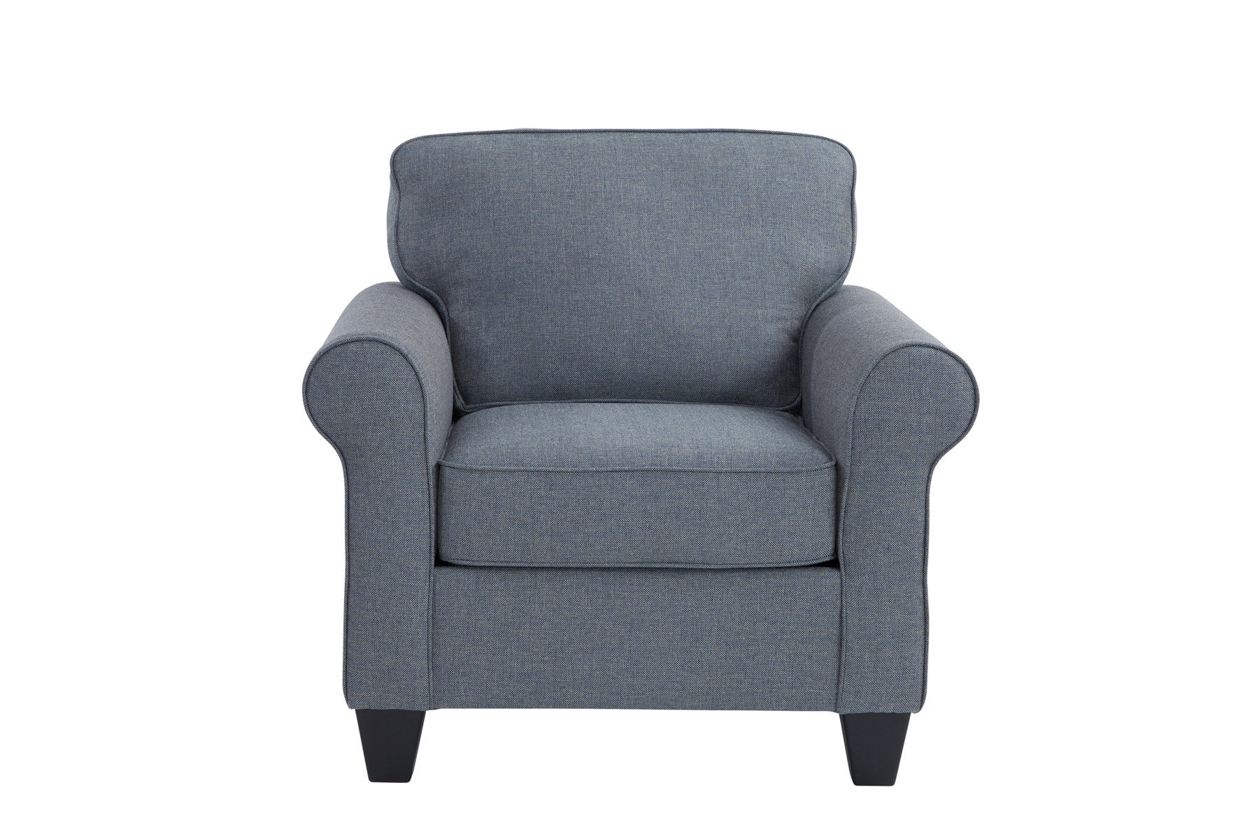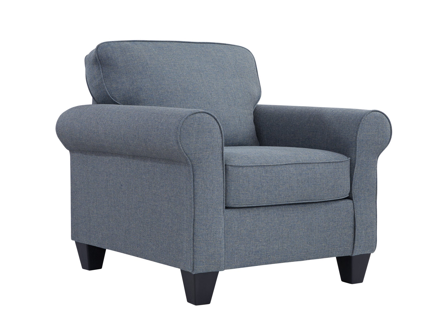 This is a classic cottage style round armchair. The body fabric is woven with a linen like texture in a medium blue with a slight touch of green mixed in. The seat cushion is loose non-reversible, and the back cushions are attached. The fabrics on this chair is performance that is both durable and easy to clean. This chair will fit into any size floor plan.