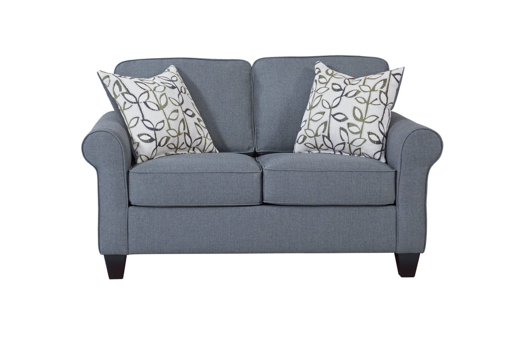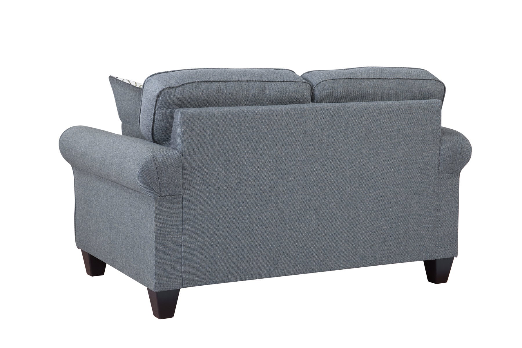 This is a classic cottage style round arm loveseat with a very soothing color palette of blue, green, and ivory. The body fabric is woven with a linen like texture in a medium blue with a slight touch of green mixed in. The square accent pillows are a beautiful floral and leaf outline pattern in green and ink blue on an ivory background. The kidney pillow is a broken stripe in the same colors. The seat cushions are loose non-reversible, and the back cushions are attached. The fabrics on this group are performance that is both durable and easy to clean. This loveseat will fit into any size floor plan. Seats two people comfortably.