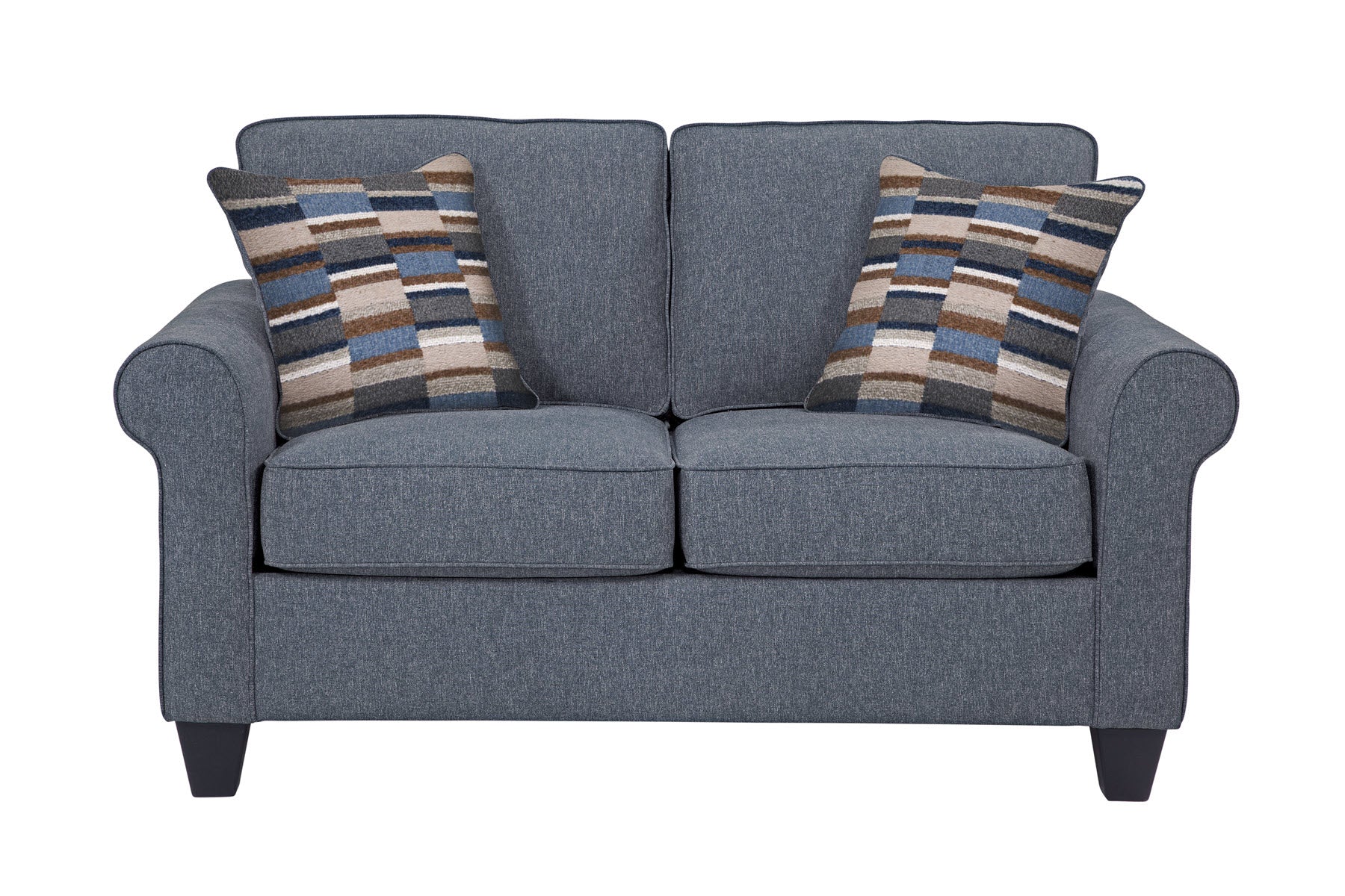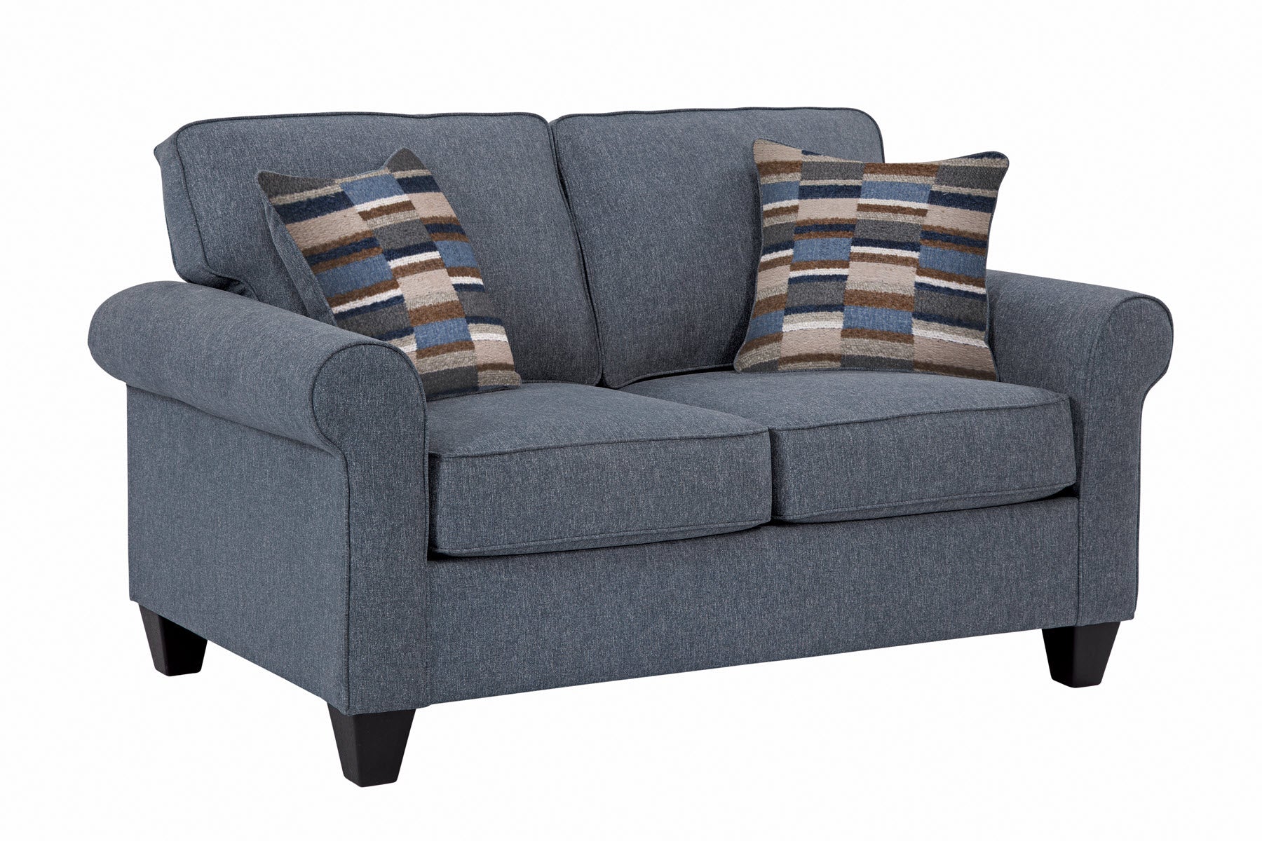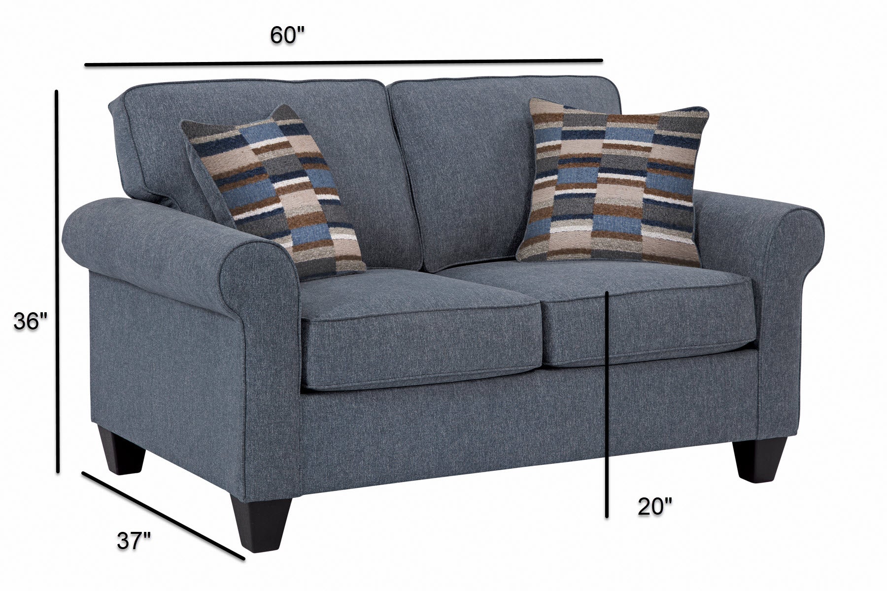 A transitional round-arm loveseat that has two attached back cushions and two reversable seat cushions. The base fabric is Revolution Performance Fabric in a flat woven fabric that gives the appearance of linen. The color scheme is a mid-tone marine blue with two accent pillows. The pillows have vibrant earth tones of rust, blue, sand and ivory. Love seat will seat two comfortably. This love seat is great for small space living.