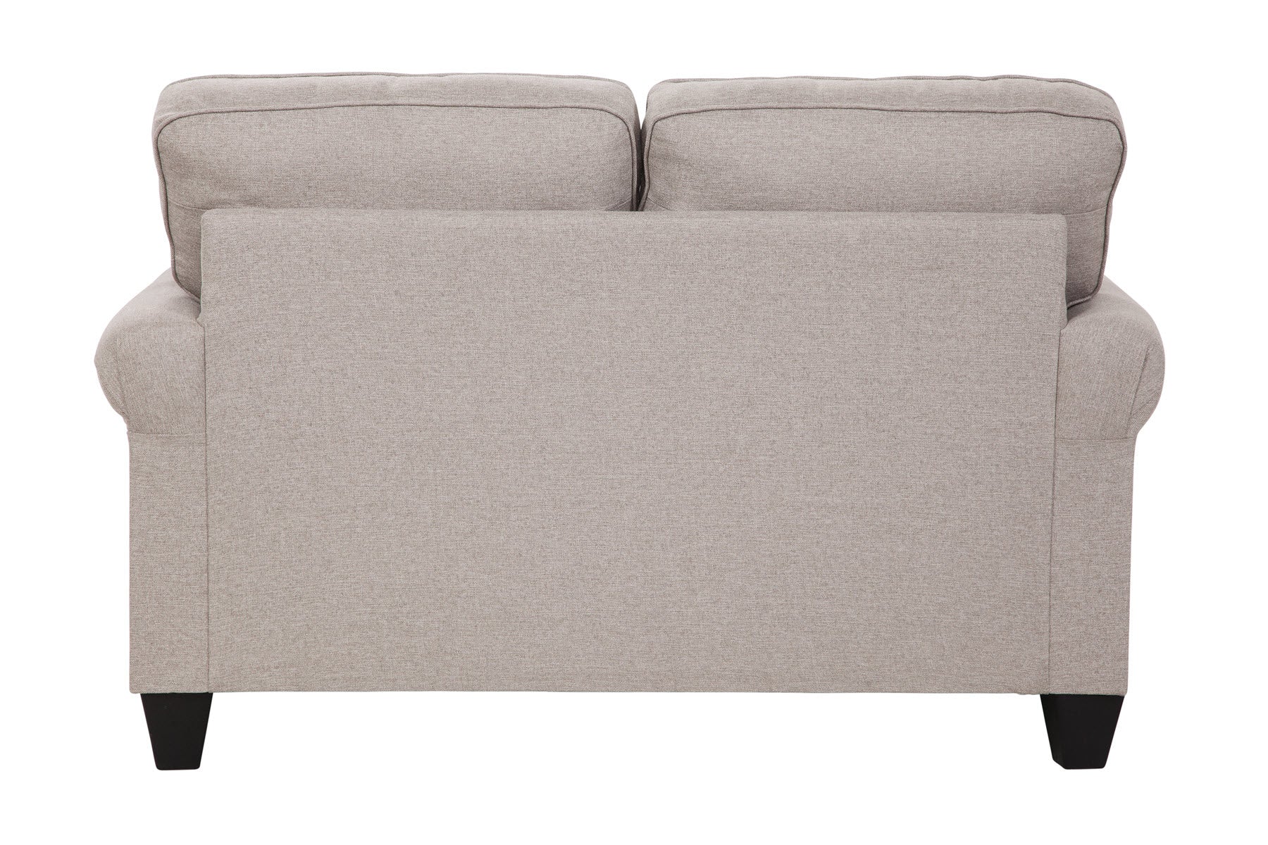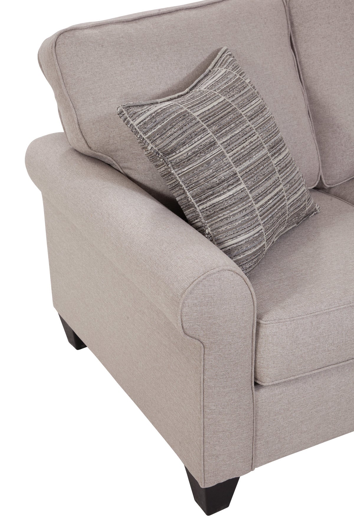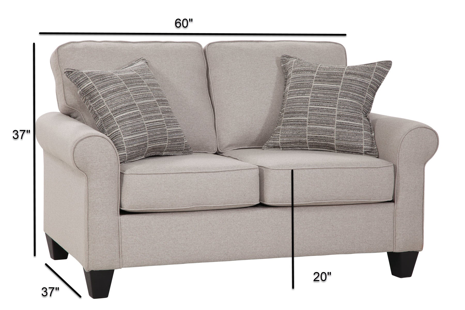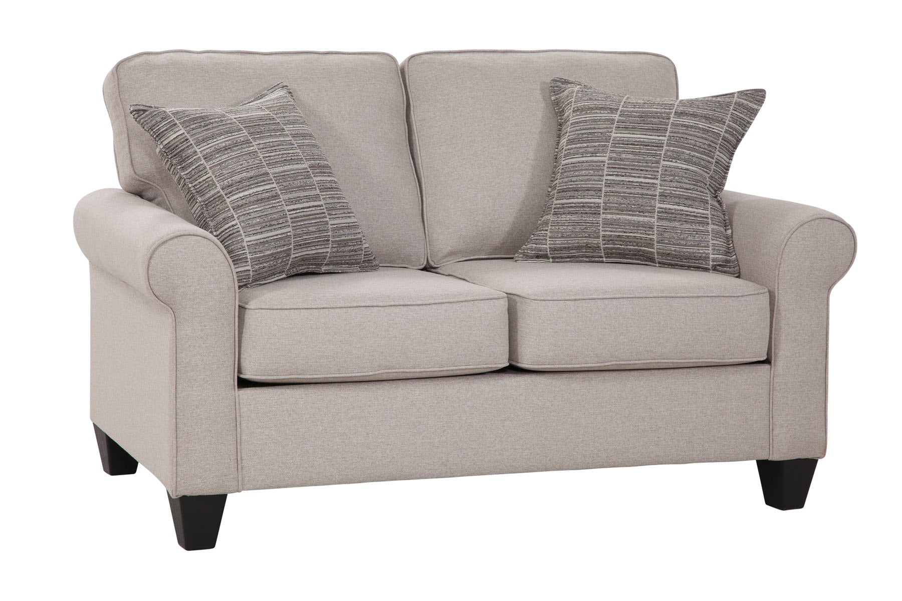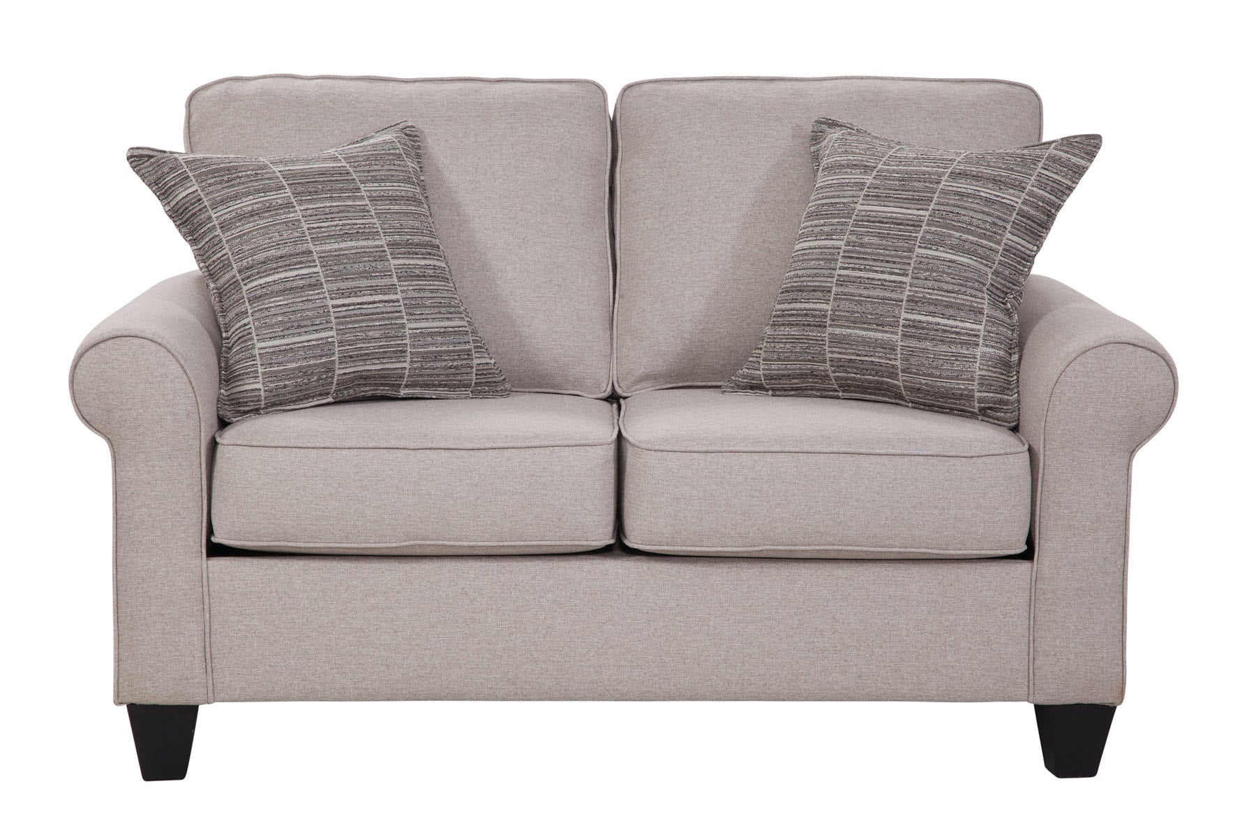 This loveseat provides a clean tailored look that is perfect for any living area. The neutral fabric with matching print pillows will compliment any décor. Fine, tailored details add classic appeal to this set. This loveseat has a small footprint that is perfect for a variety of living spaces while providing plenty of seating for the family. Clean edges, comfortable seating and a charming design make for a winning loveseat!ng sofa!