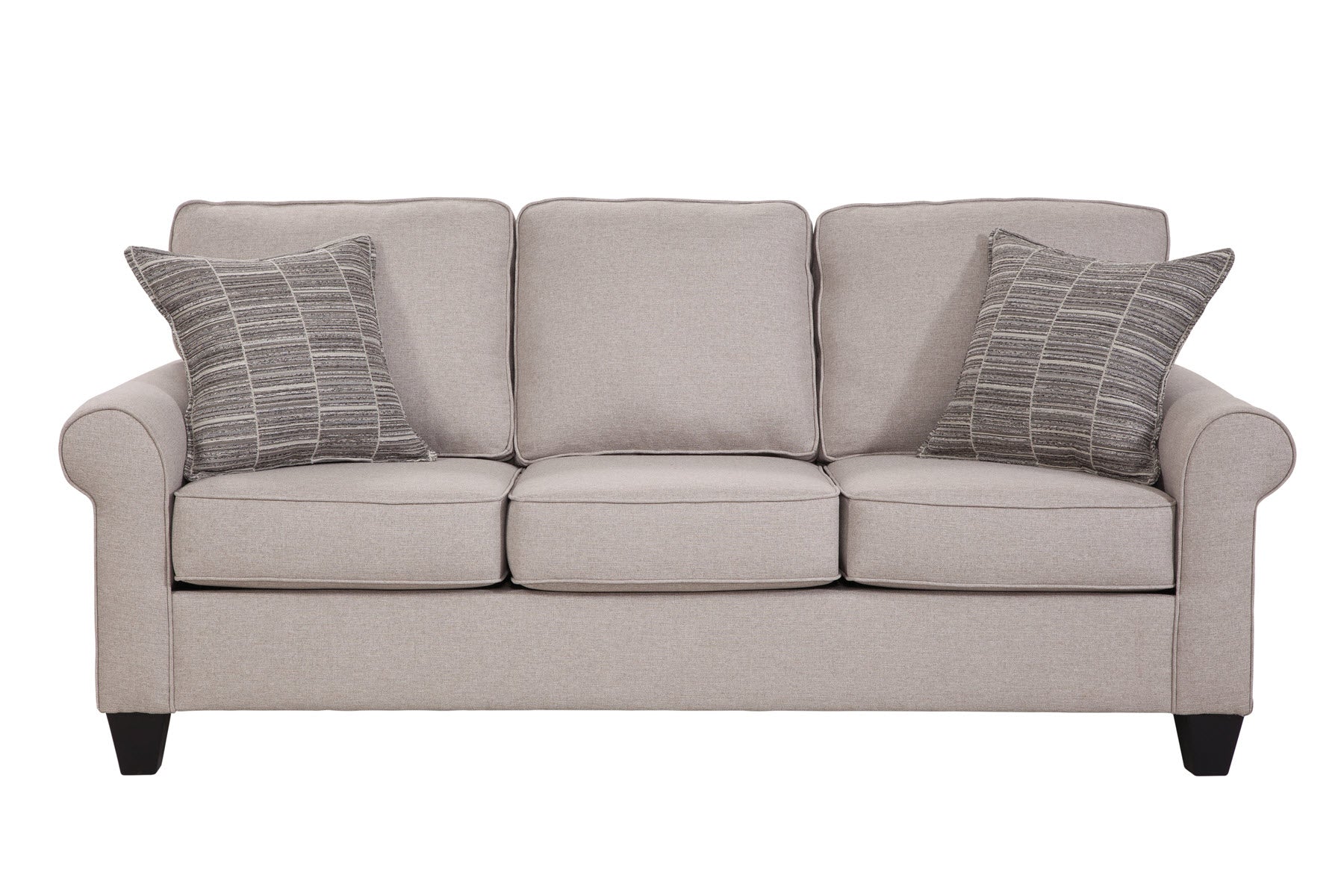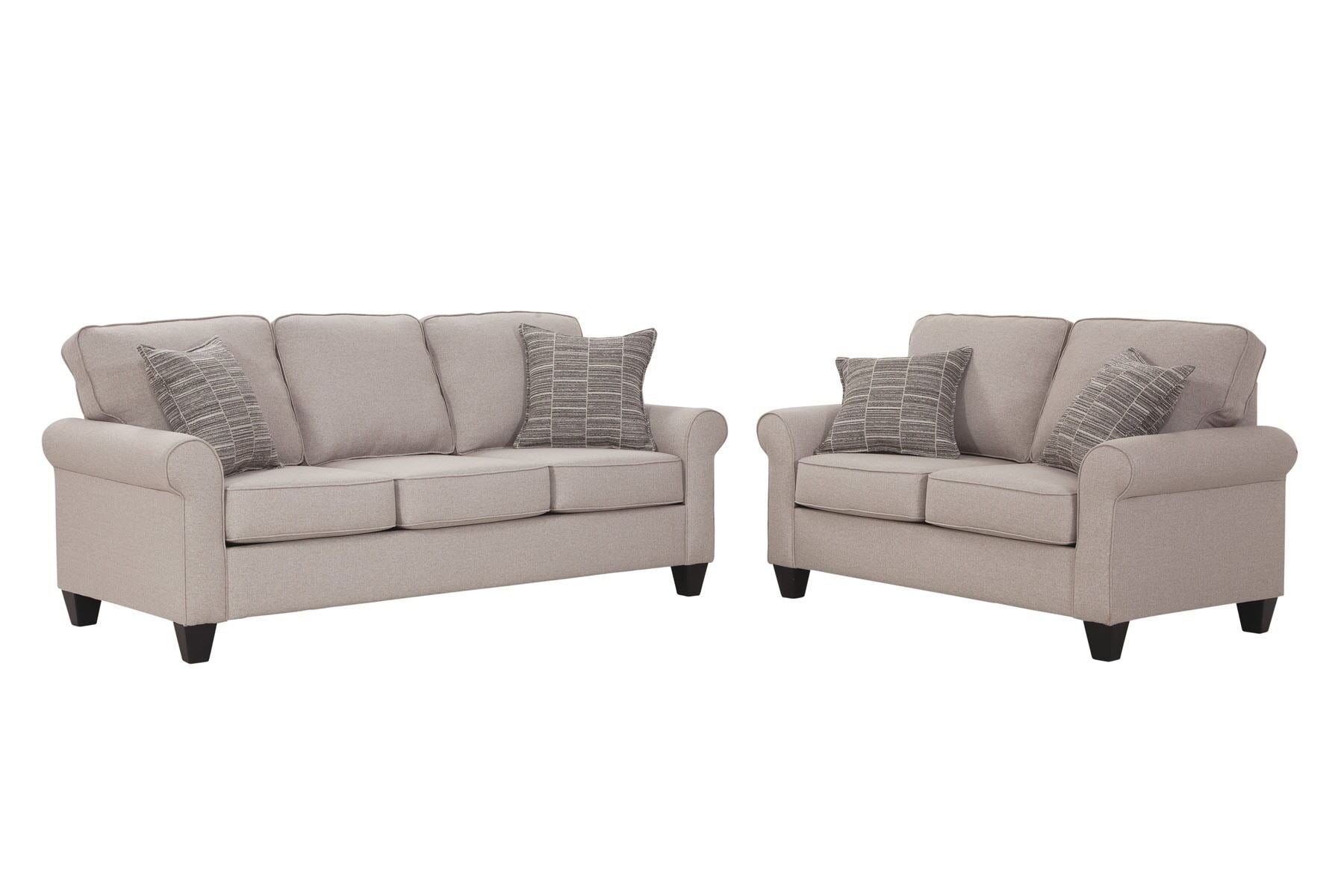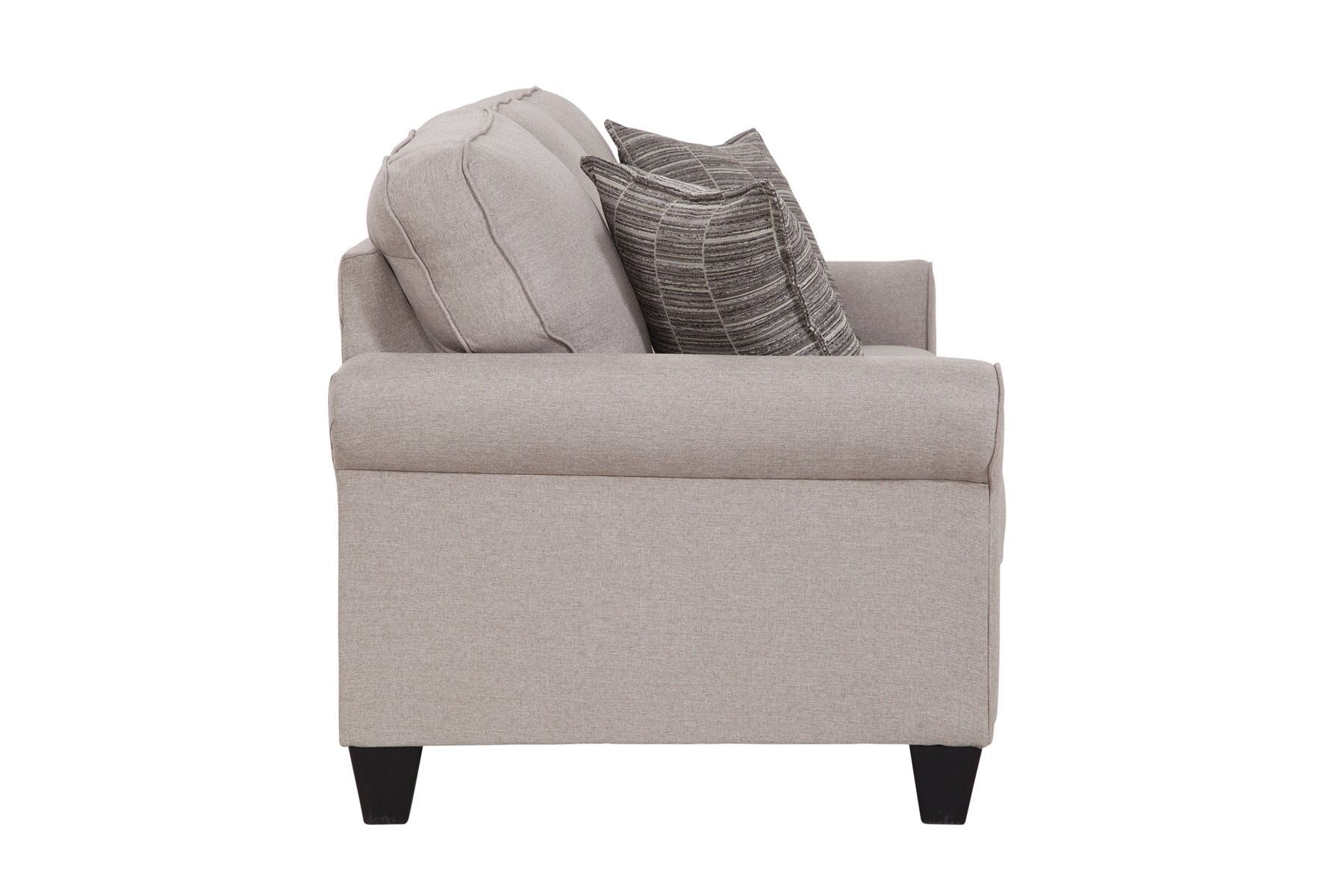 This sofa provides a clean tailored look that is perfect for any living area. The neutral fabric with matching print pillows will compliment any décor. Fine, tailored details add classic appeal to this set. This sofa has a small footprint that is perfect for a variety of living spaces while providing plenty of seating for the family. Clean edges, comfortable seating and a charming design make for a winning sofa!