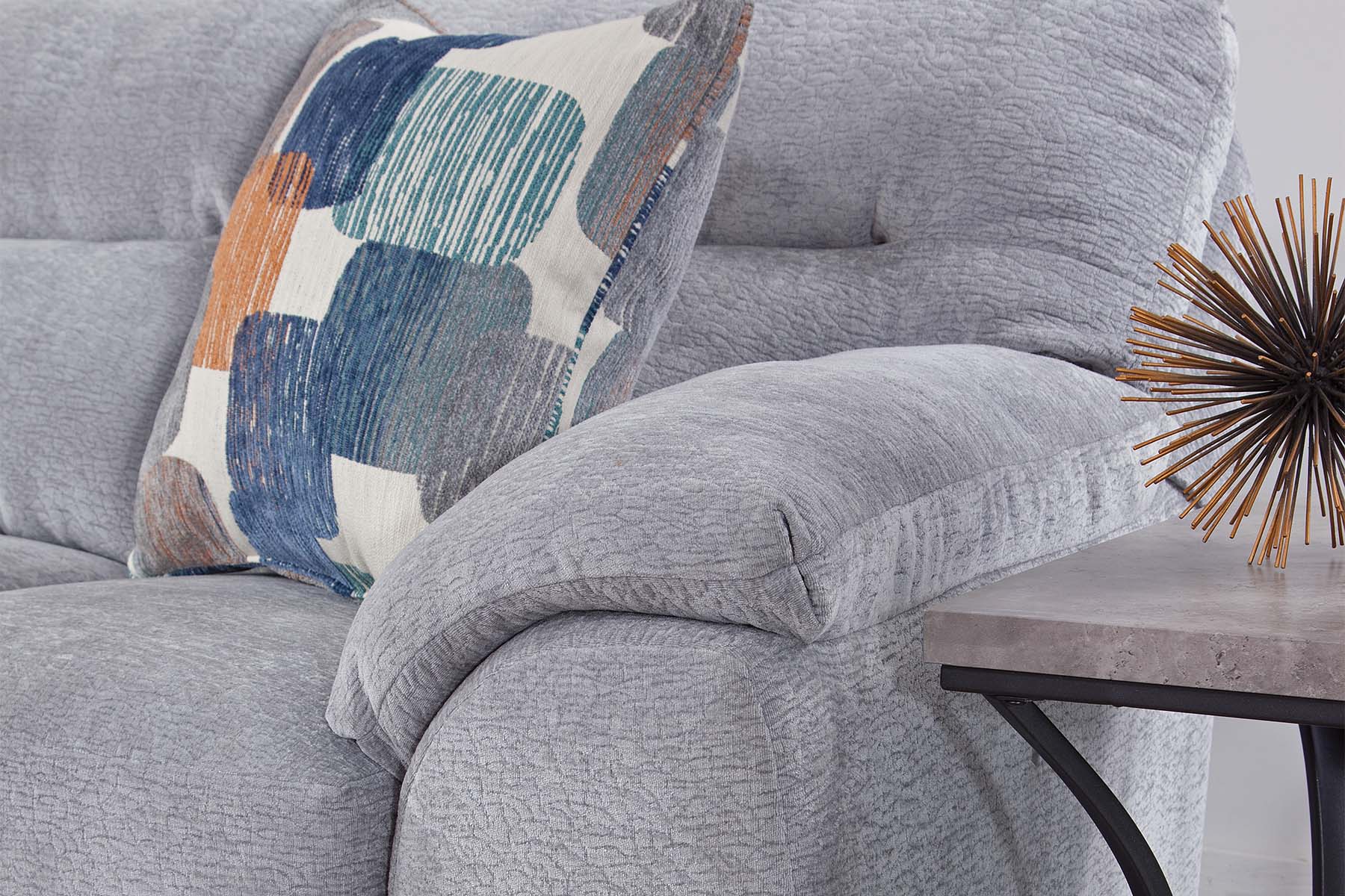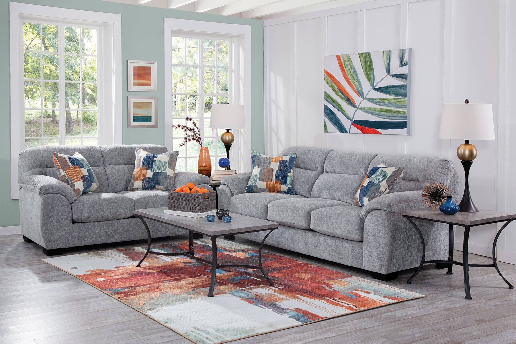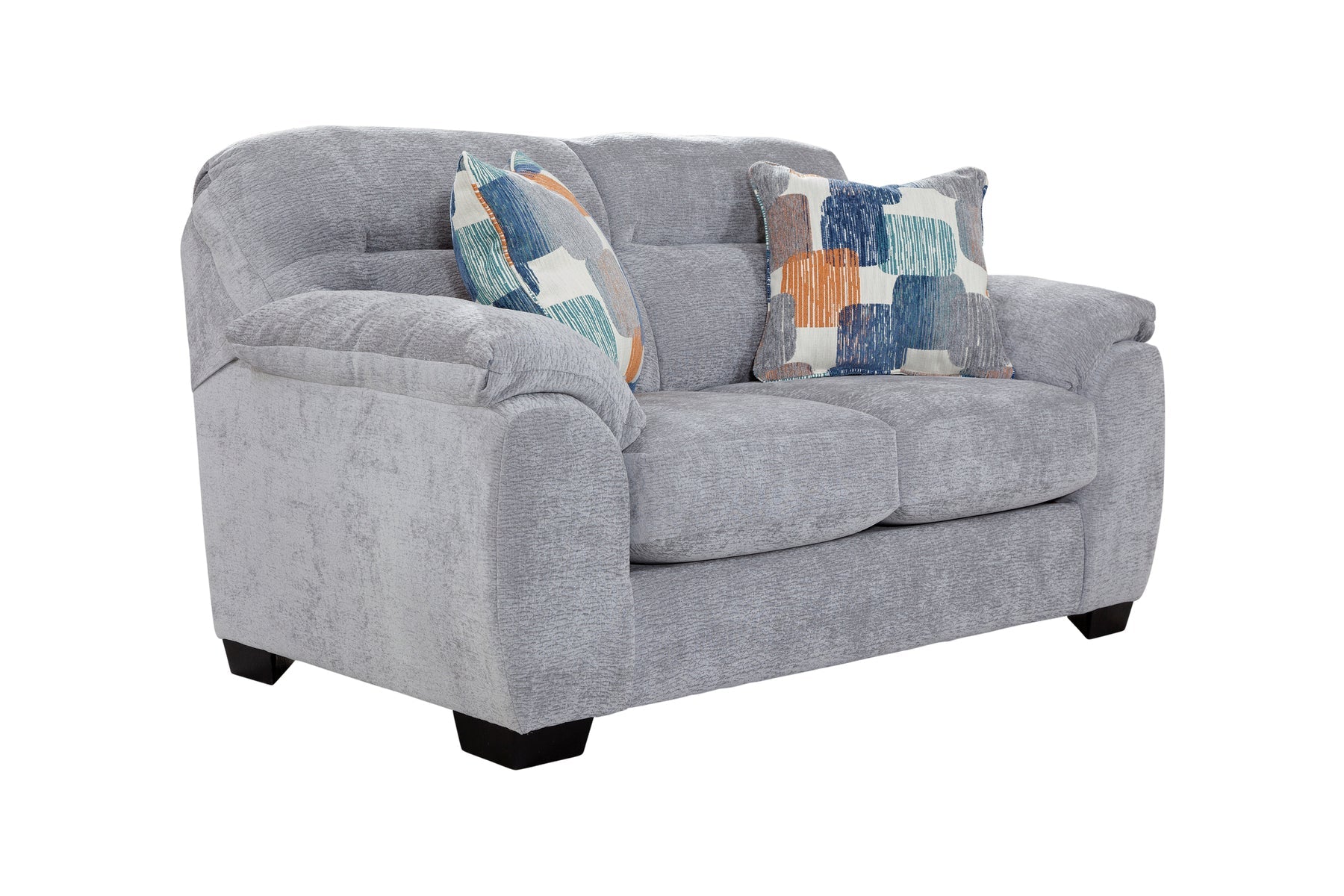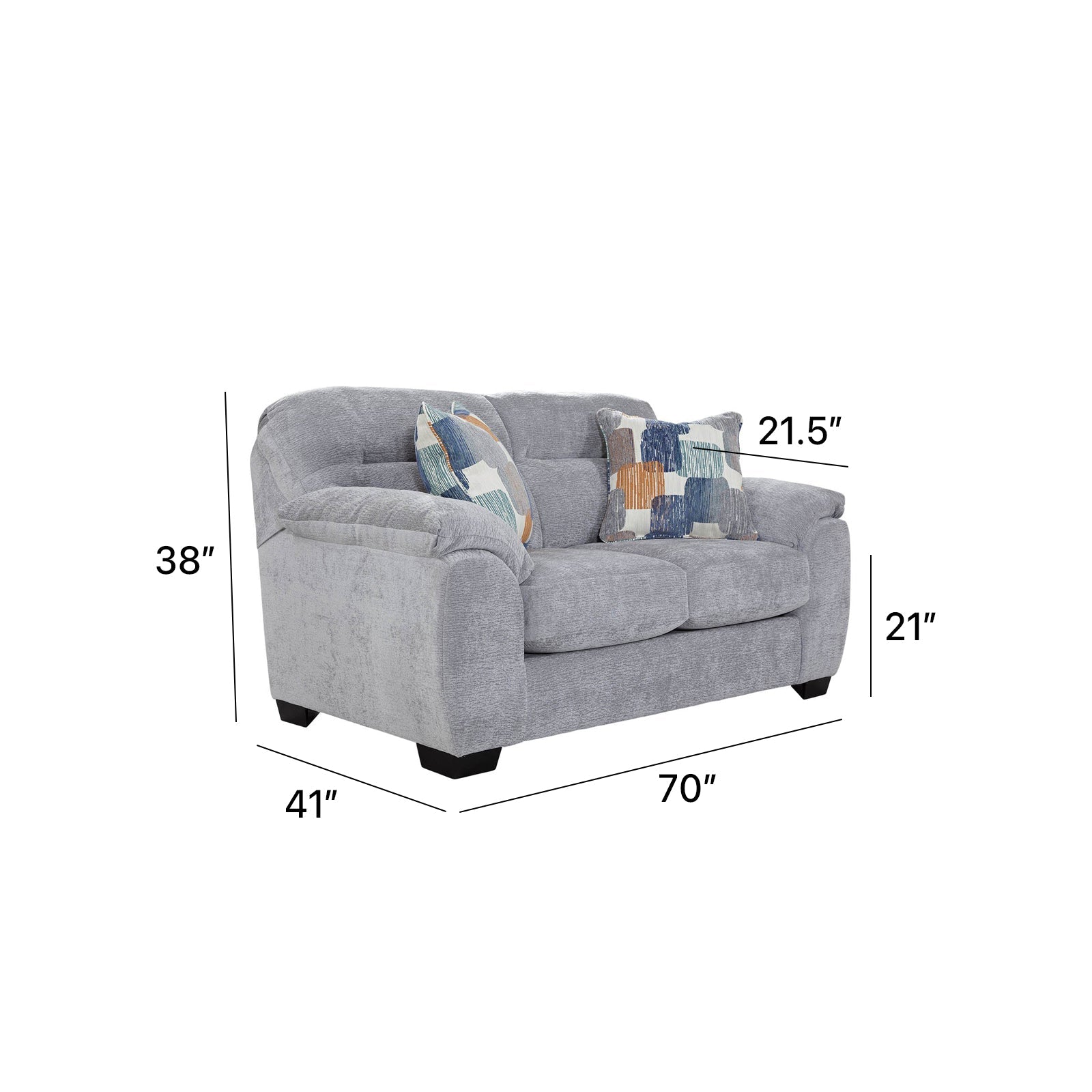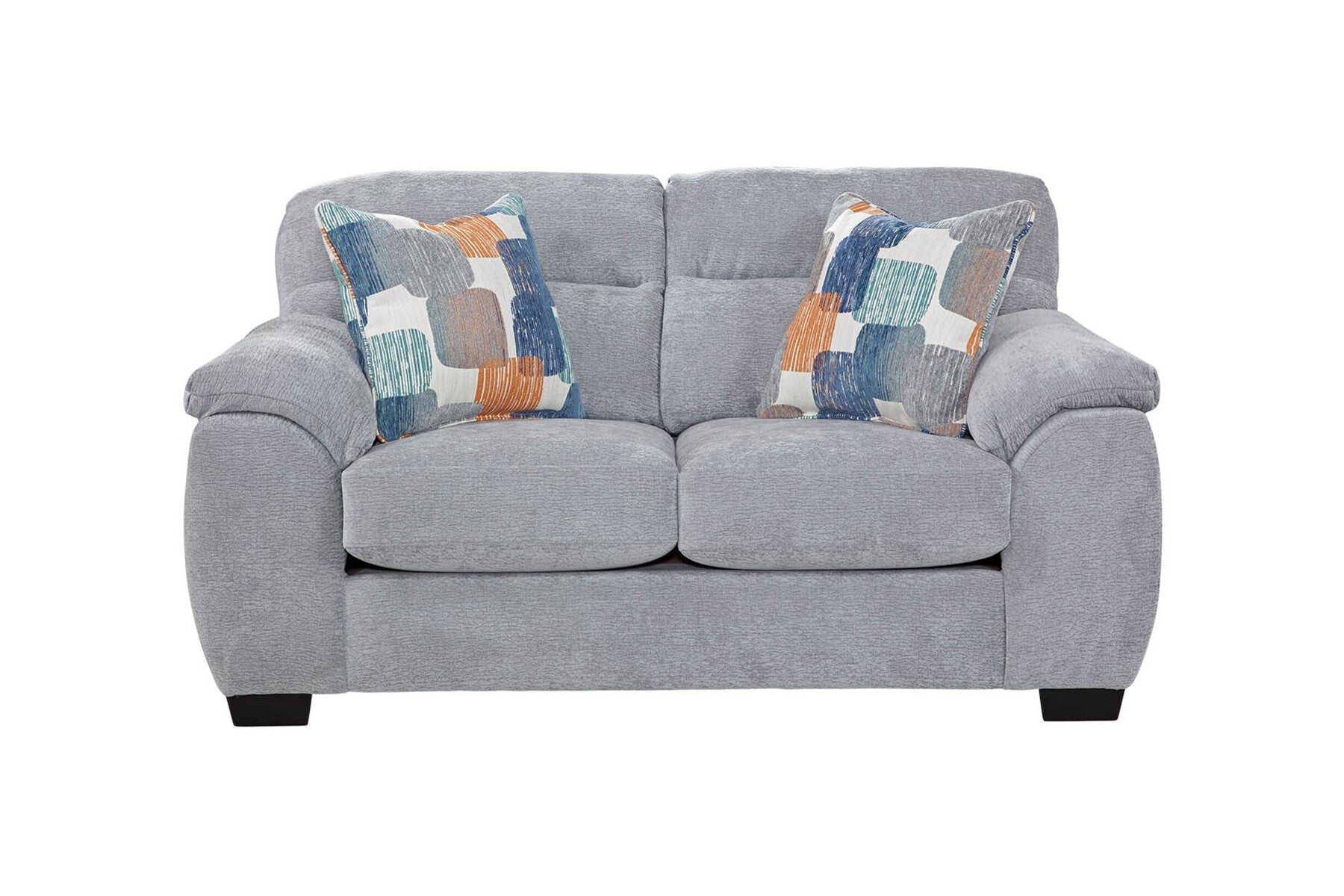 This flared arm loveseat is part of our casual comfort collection. It provides cozy and comfortable seating as well as makes a statement. The fabric is a soft plush padded polyester with texture in a soft dove gray. The accent pillows are a bold geometric pattern with pops of orange and blue. This small loveseat seats two people.