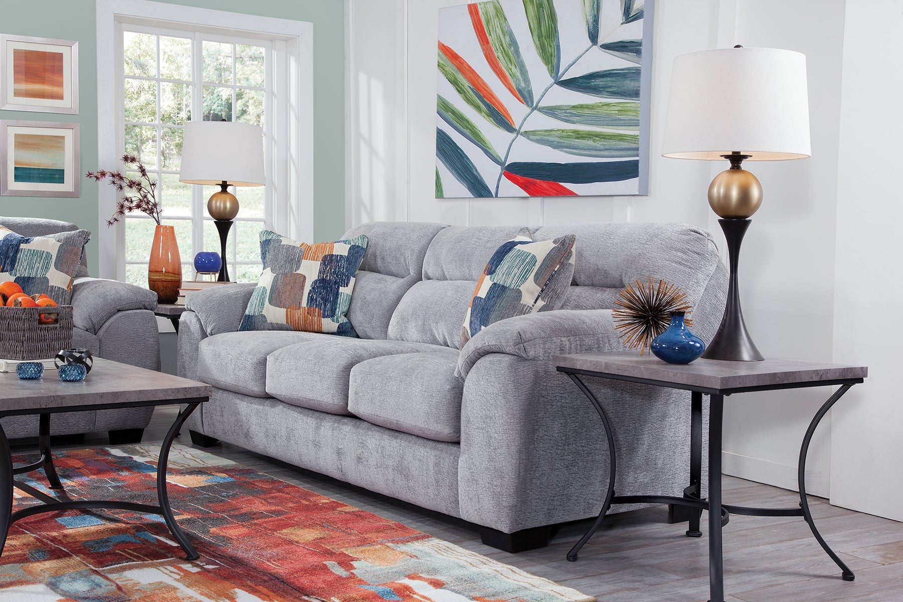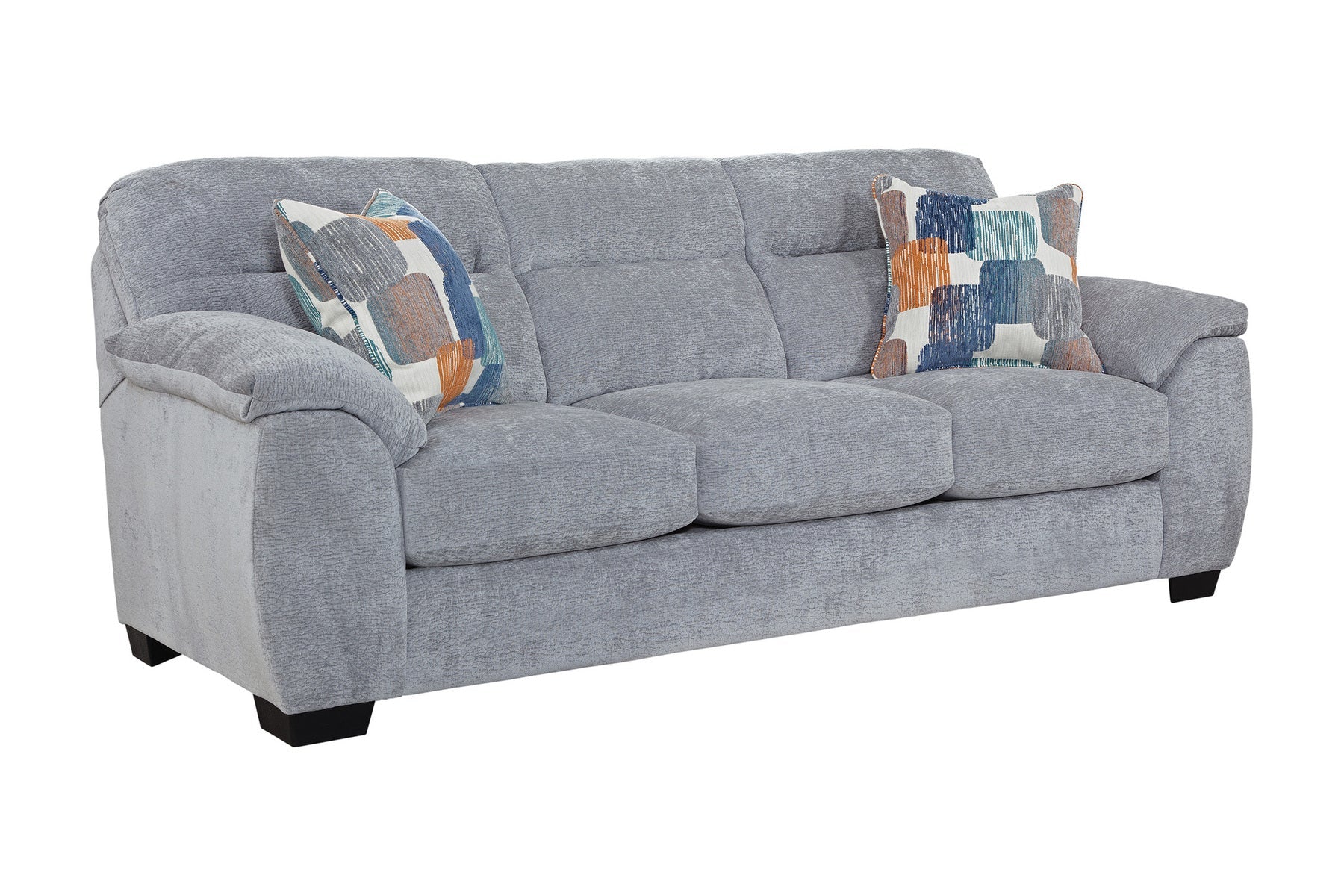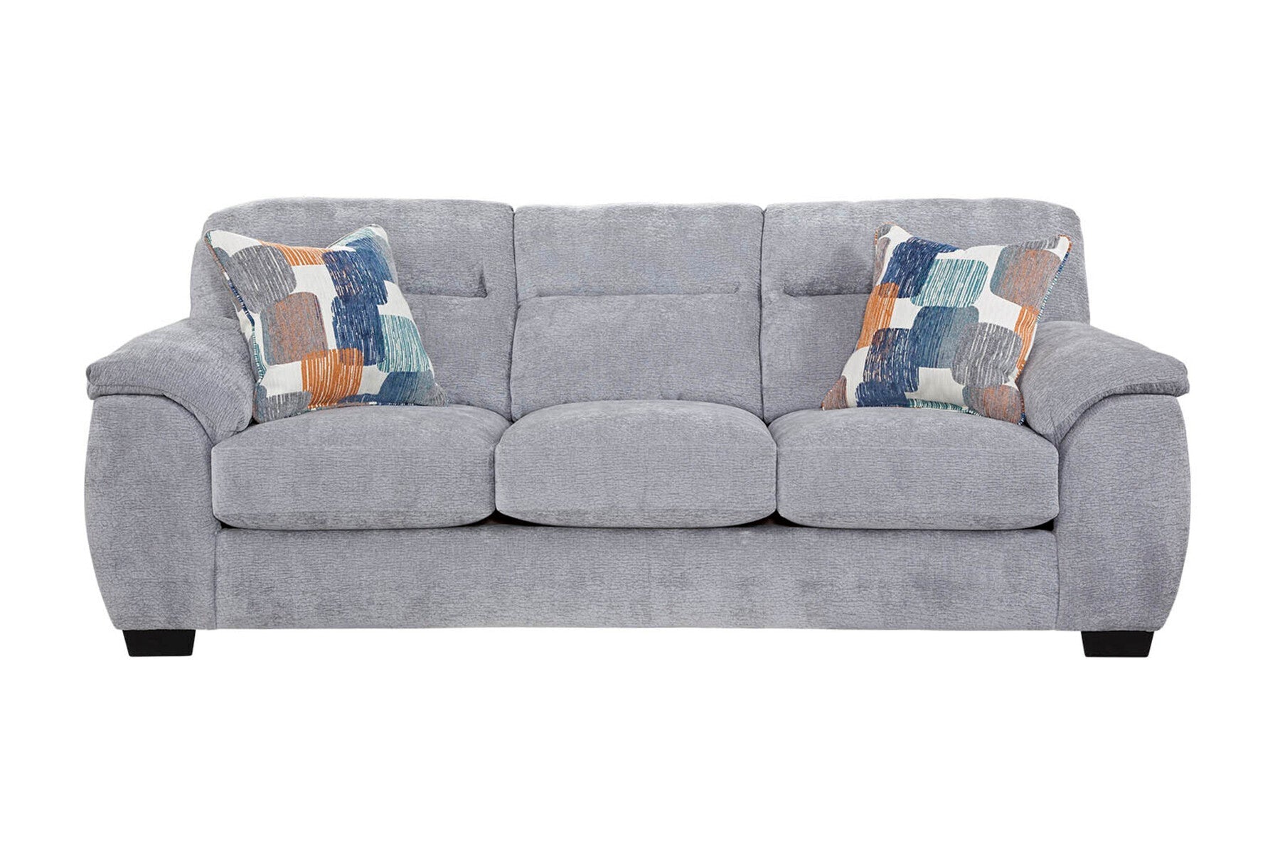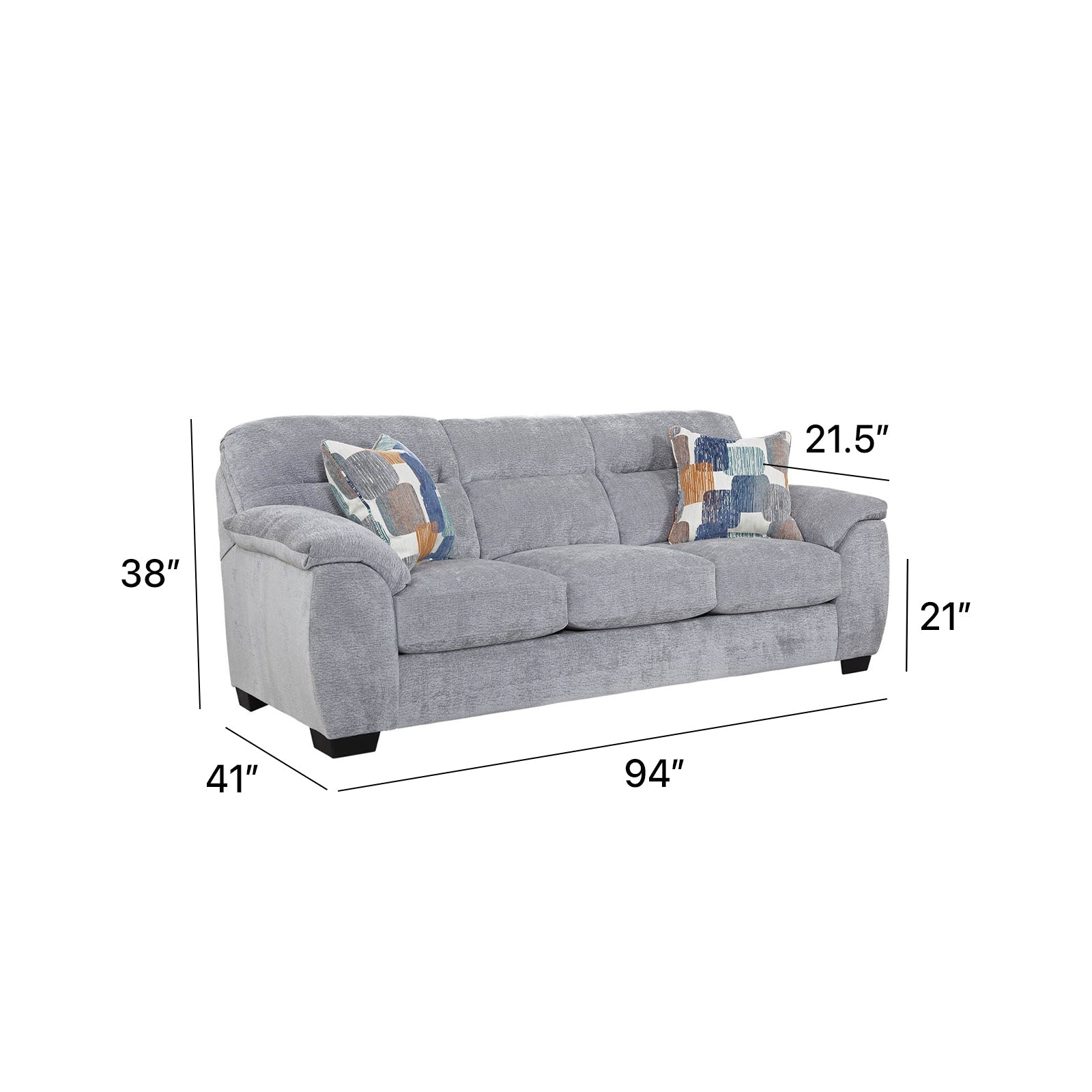 This sofa is part of our casual comfort collection. It provides cozy and comfortable seating as well as makes a statement. The fabric is a soft plush padded polyester with texture in a soft dove grey. The accent pillows are are bold geometric pattern with pops of orange and blue. This large sofa seats three people.