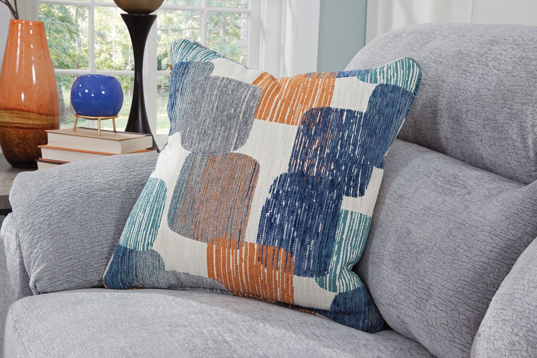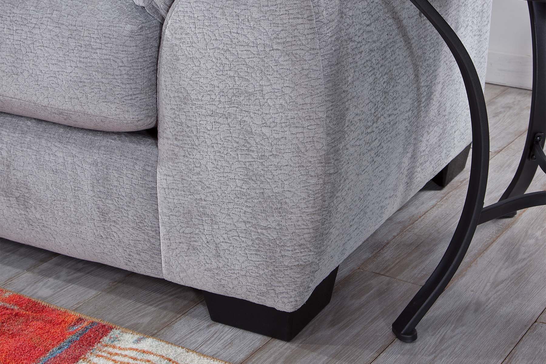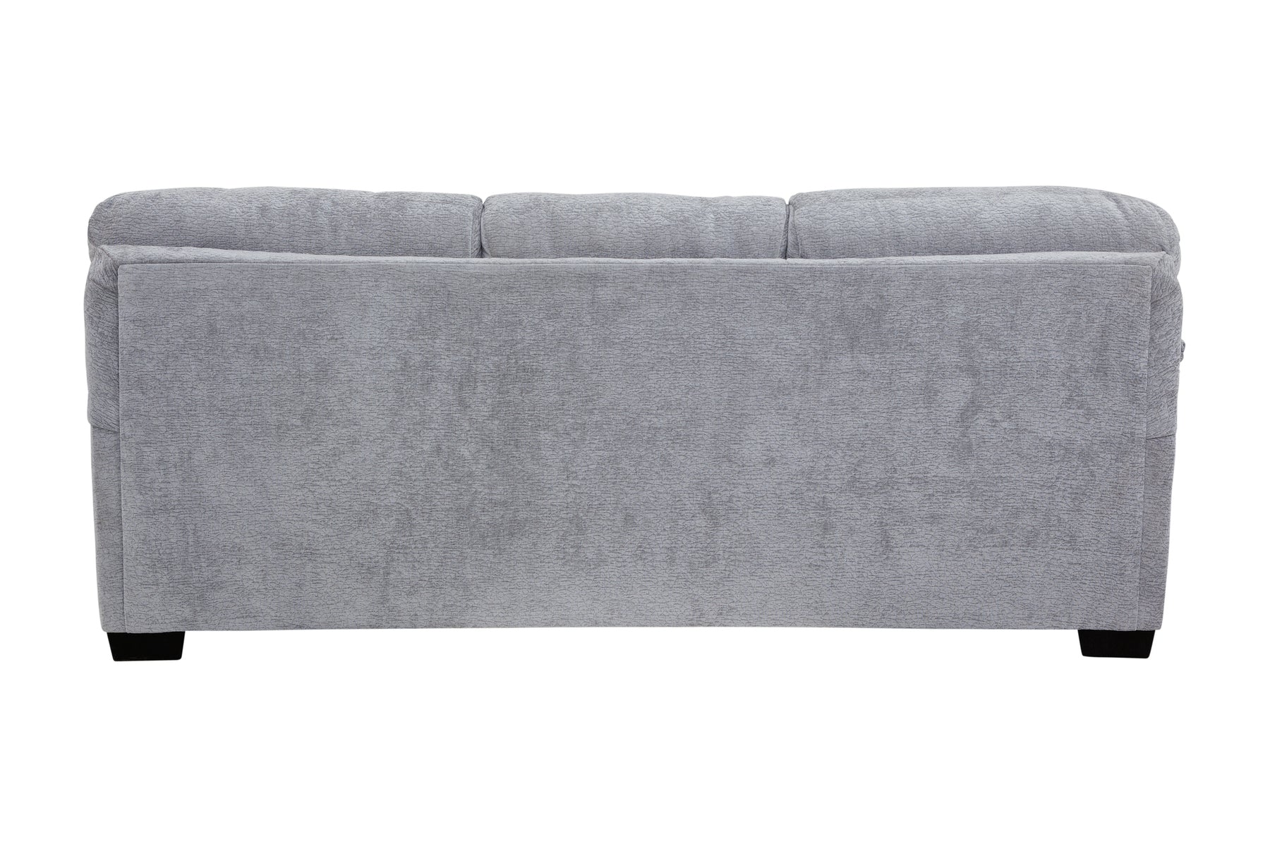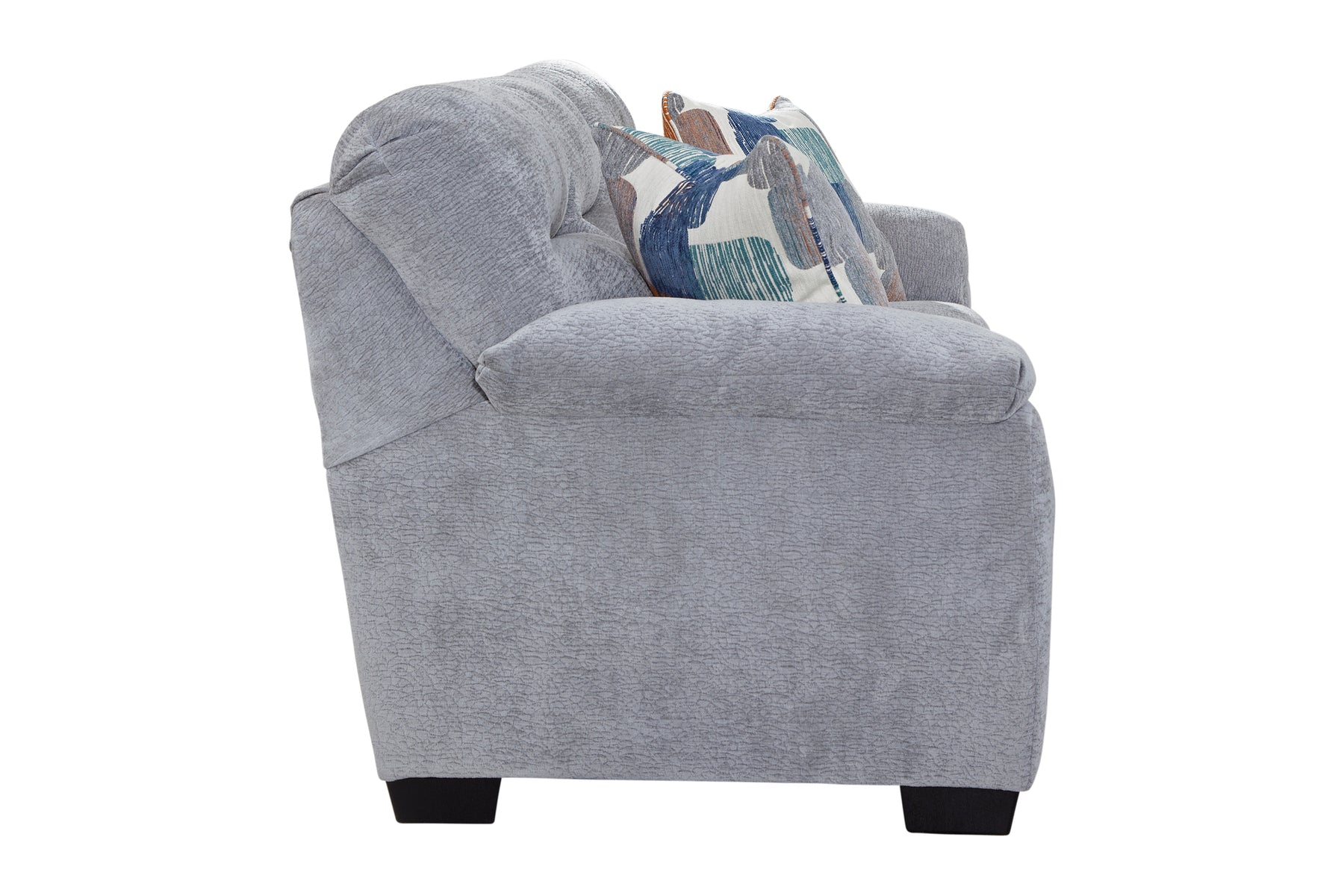 This sofa is part of our casual comfort collection. It provides cozy and comfortable seating as well as makes a statement. The fabric is a soft plush padded polyester with texture in a soft dove grey. The accent pillows are are bold geometric pattern with pops of orange and blue. This large sofa seats three people.