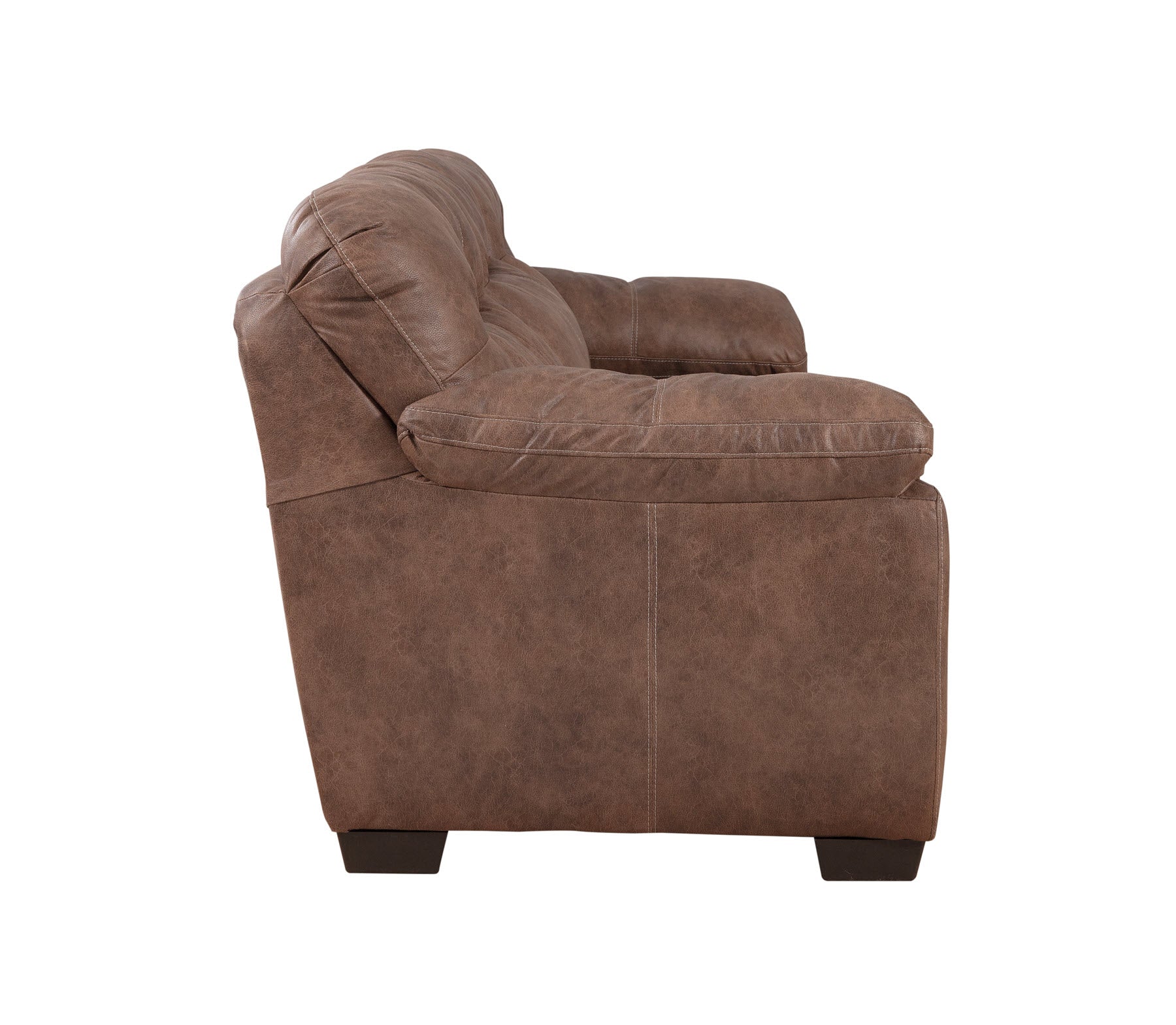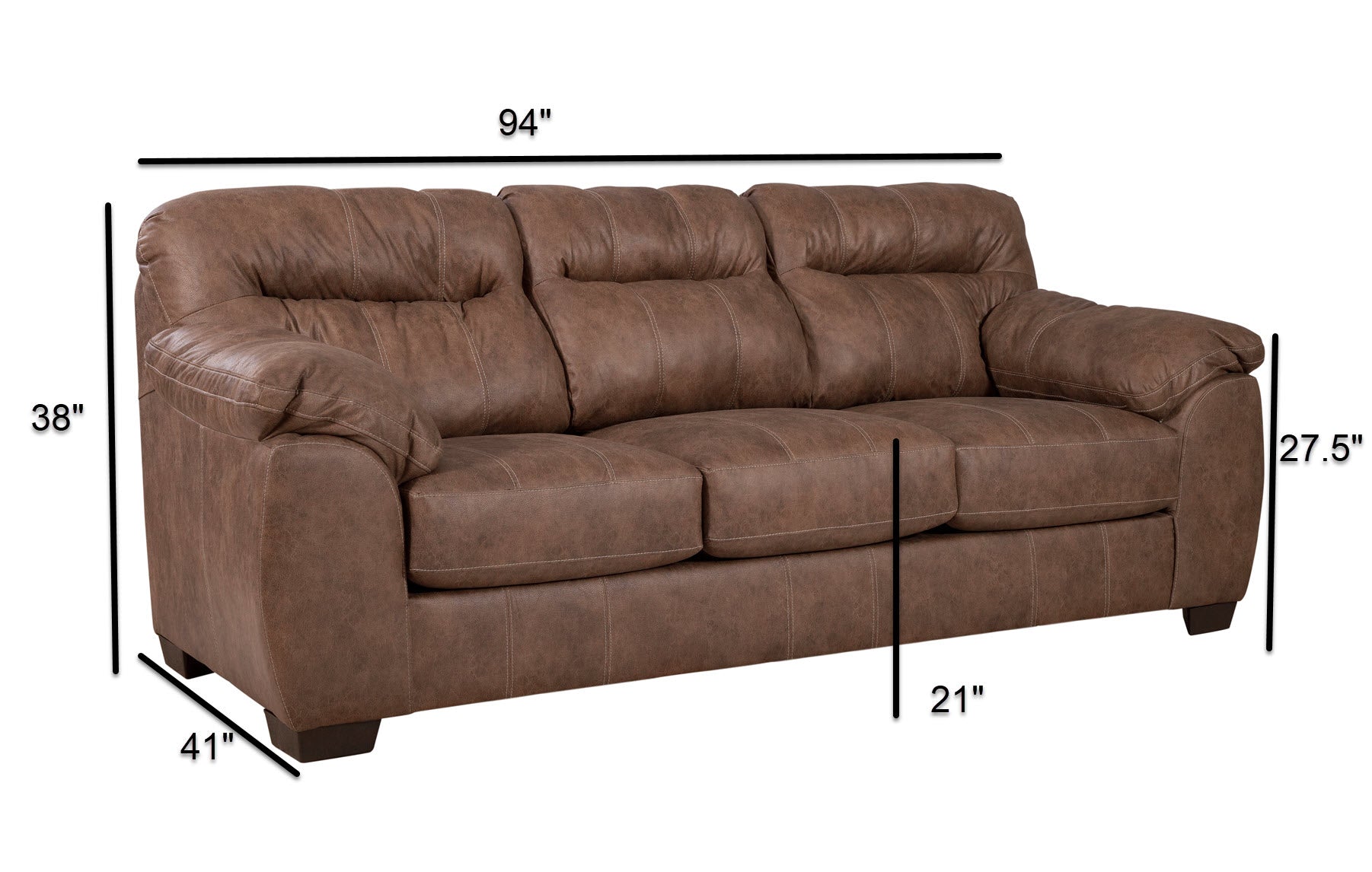 This is a timeless comfort style sofa. Soft pillow arms and back cushions provide ultimate comfort. A faux leather polyester fabric cover has a wonderful soft hand and is breathable. The back and seat cushions are non-reversible and will hold their shape and stay in place. A classic brown leather look with white topstitching provides boldness and makes a statement. Provides a comfortable place to sit and relax or entertain. Seats three comfortably. Can fit most floor plans.