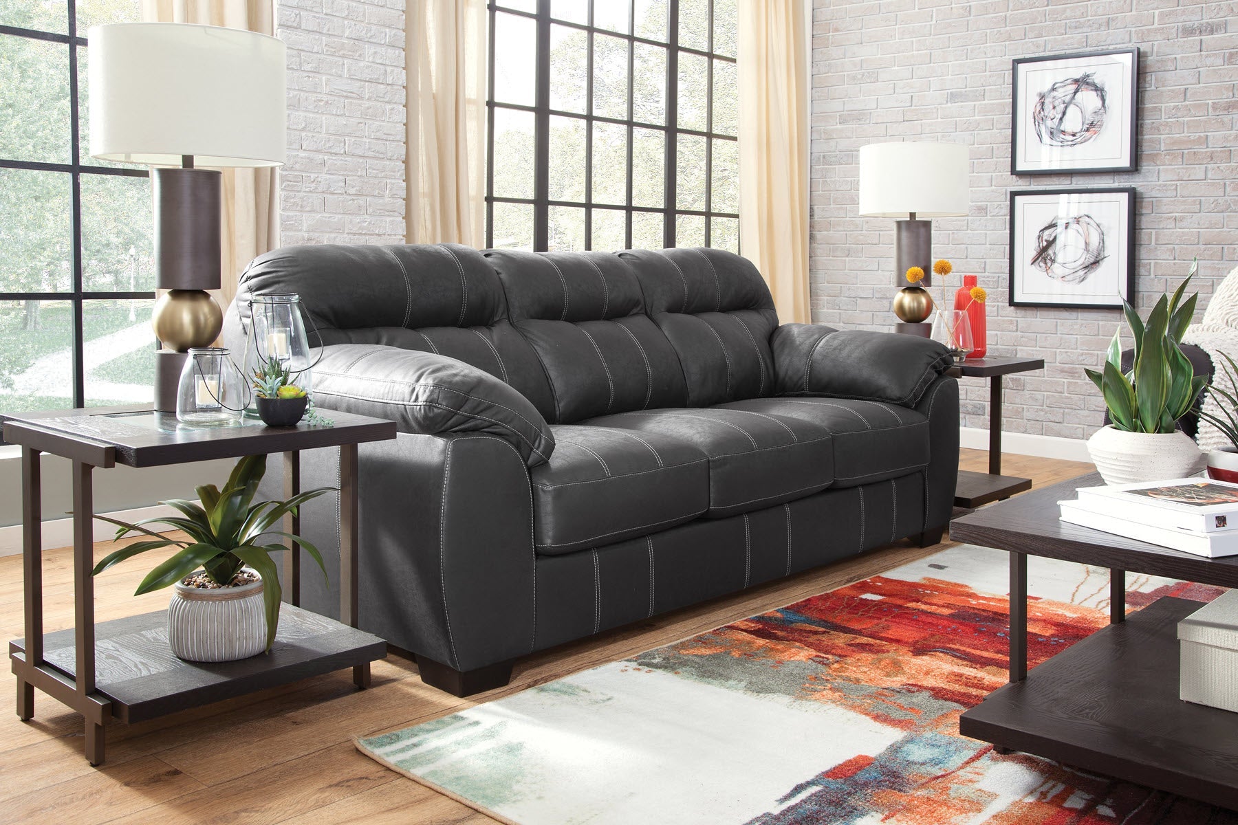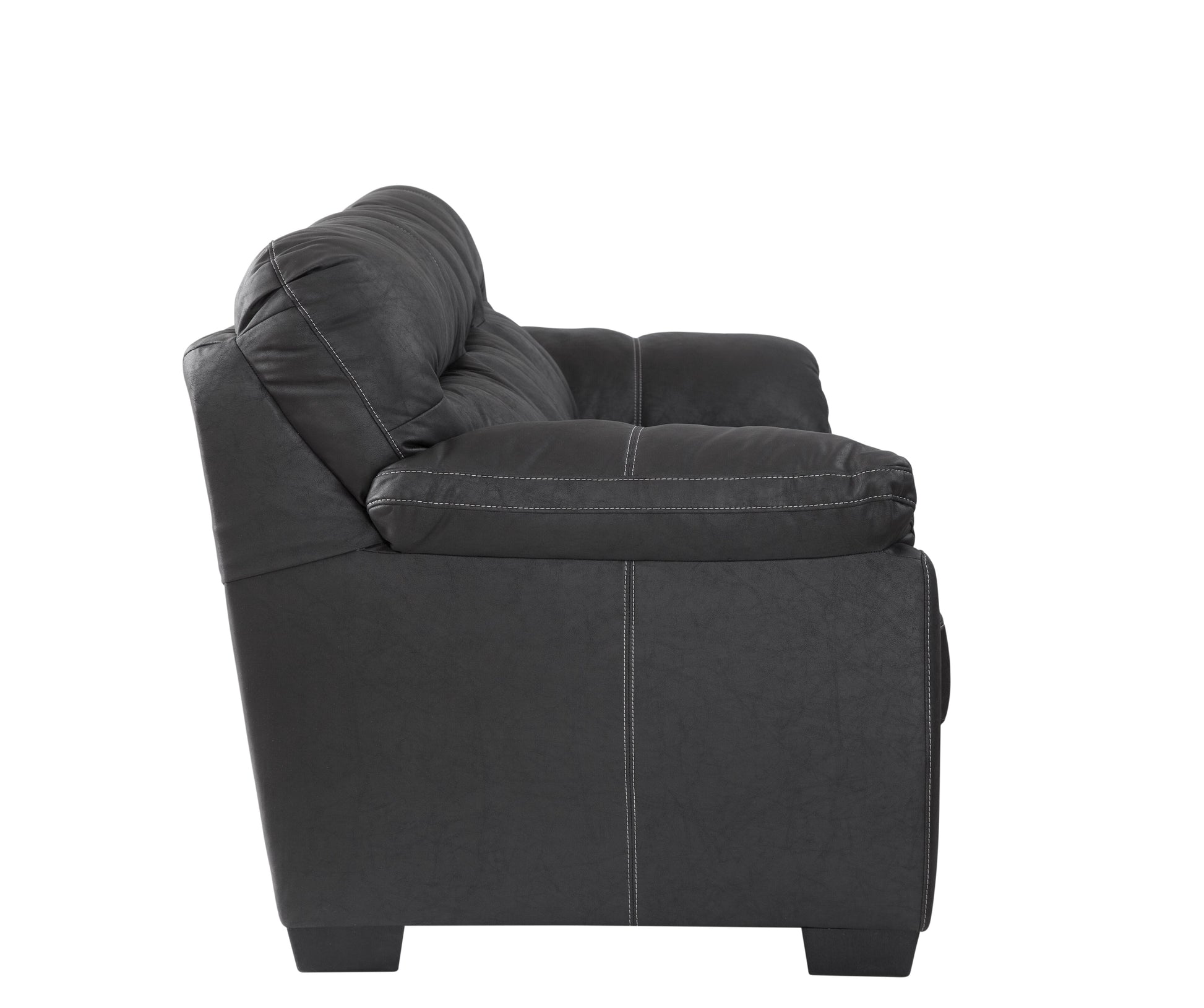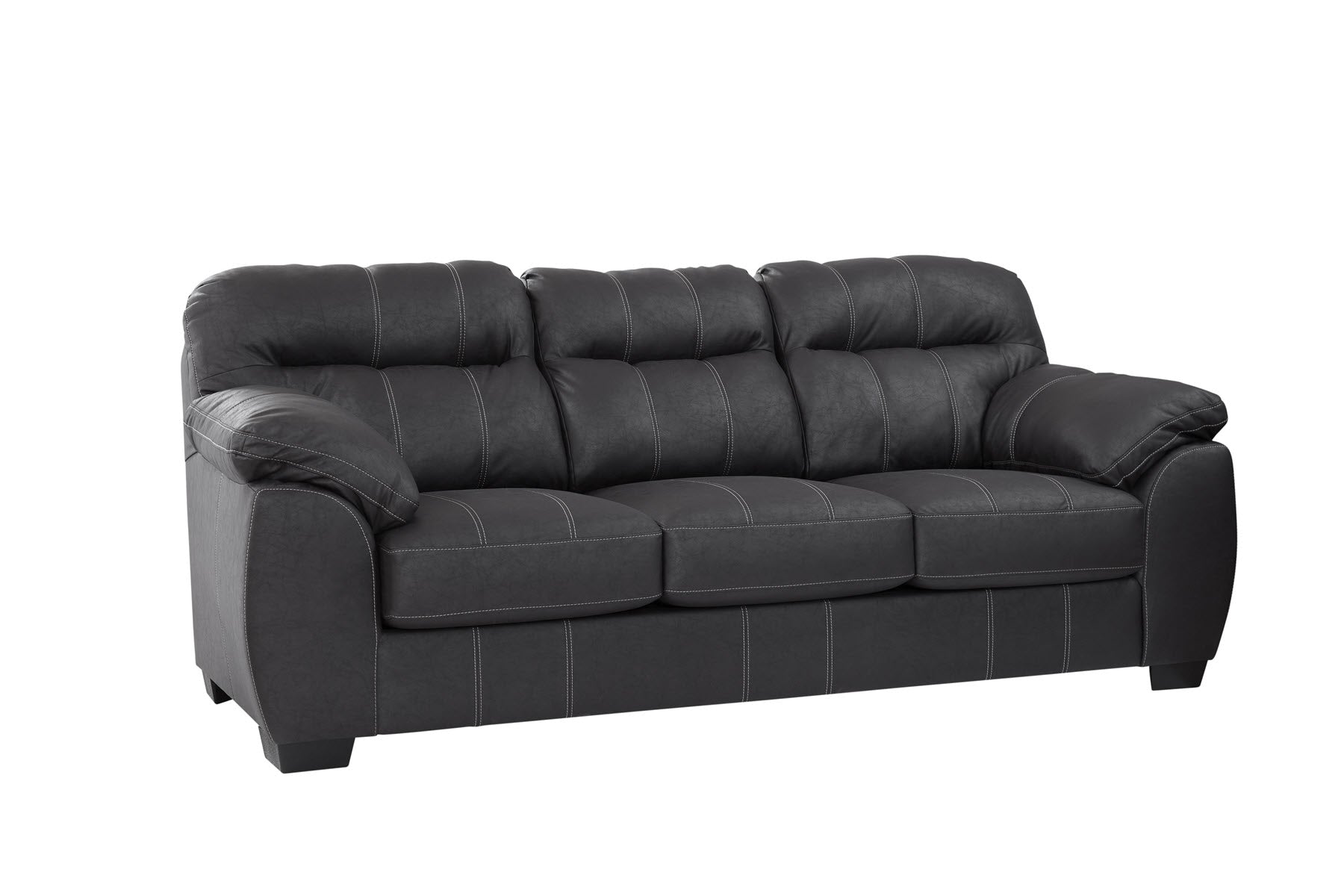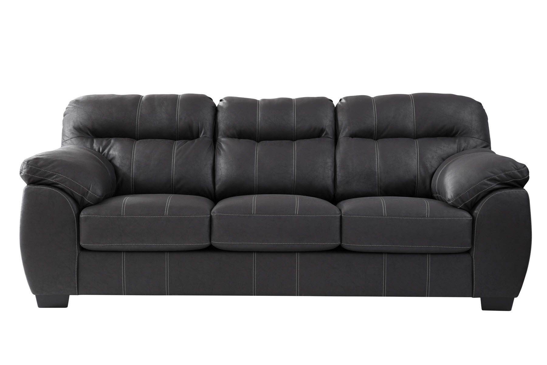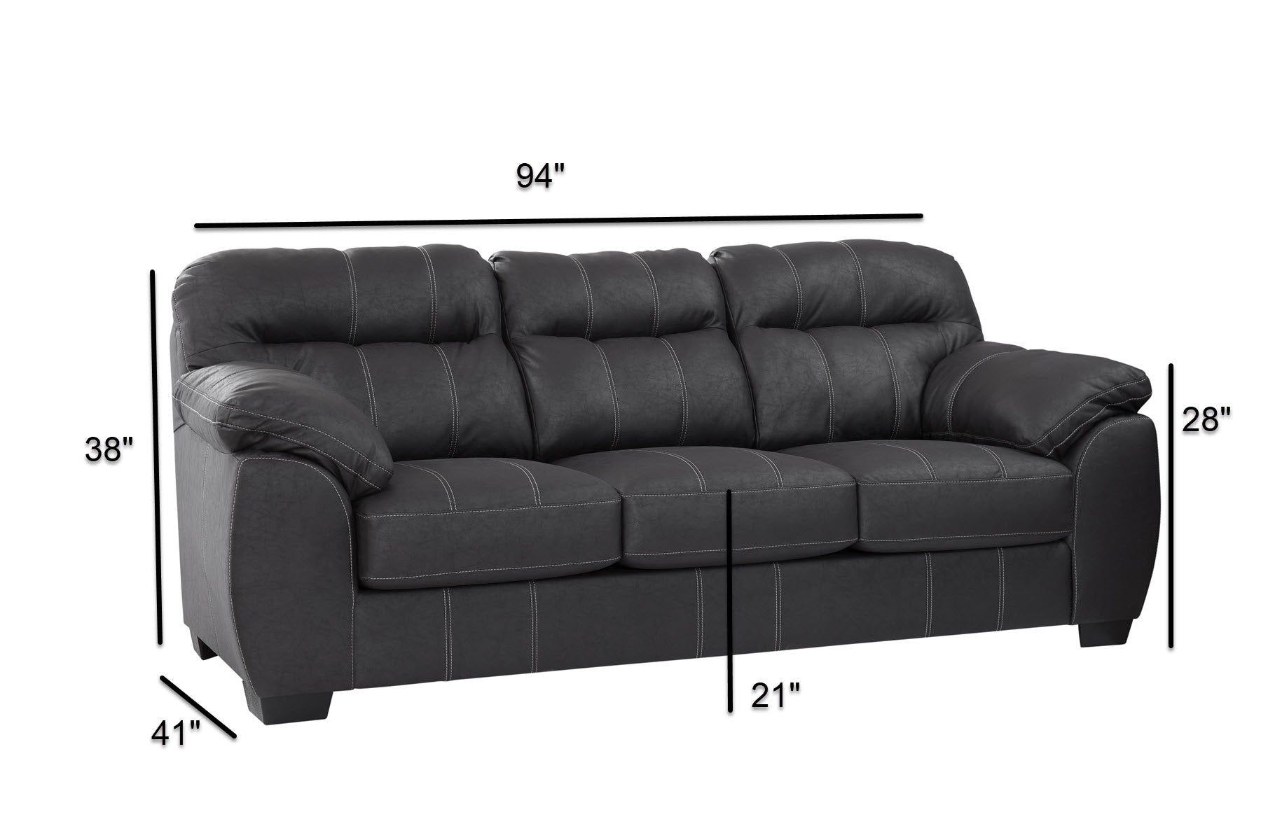 This is a timeless comfort style sofa. Soft pillow arms and back cushions provide ultimate comfort. A faux leather polyester fabric cover has a wonderful soft hand and is breathable. The back and seat cushions are non-reversible and will hold their shape and stay in place. A classic black leather look with white topstitching provides boldness and makes a statement. Provides a comfortable place to sit and relax or entertain. Seats three comfortably. Can fit most floor plans.