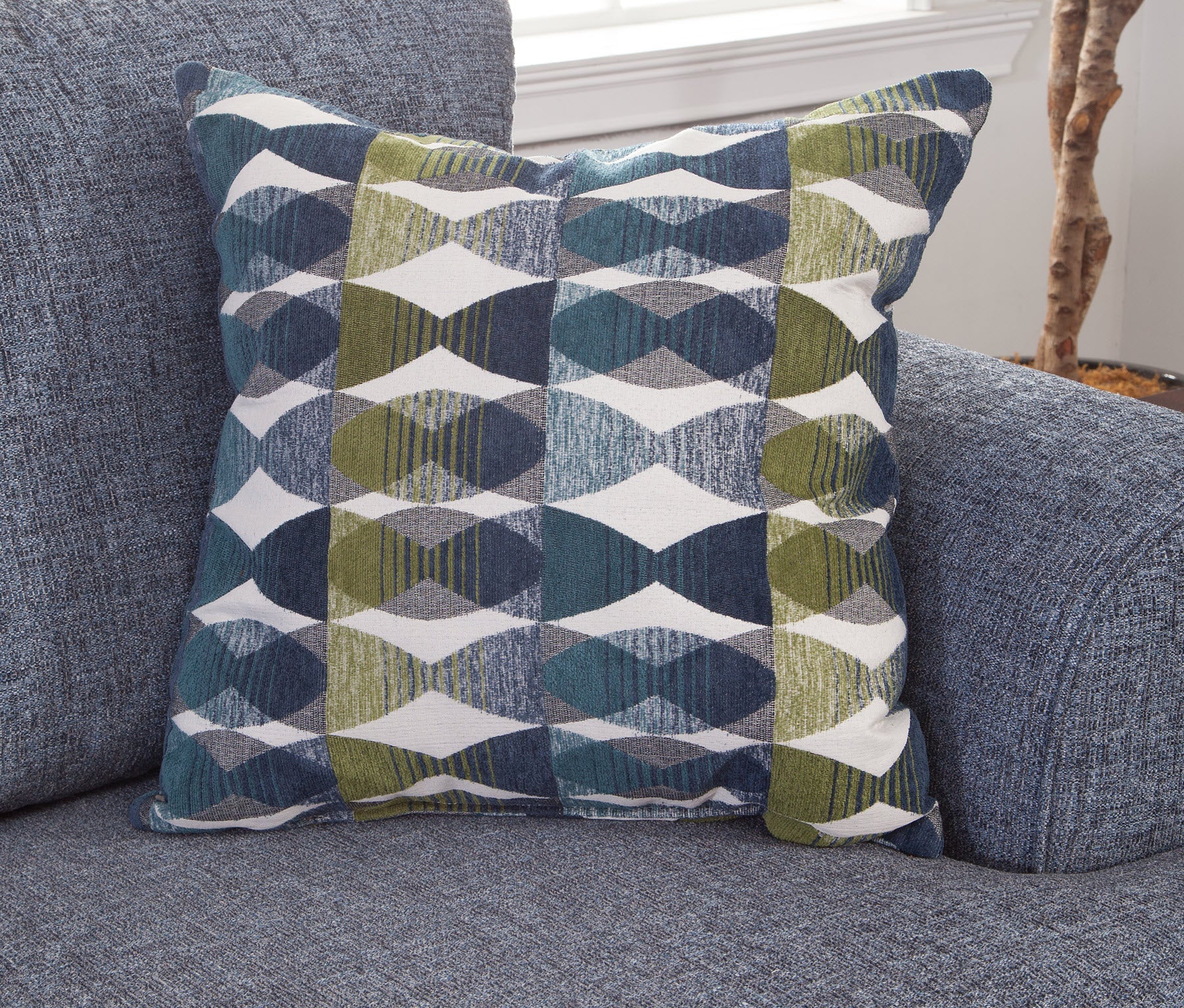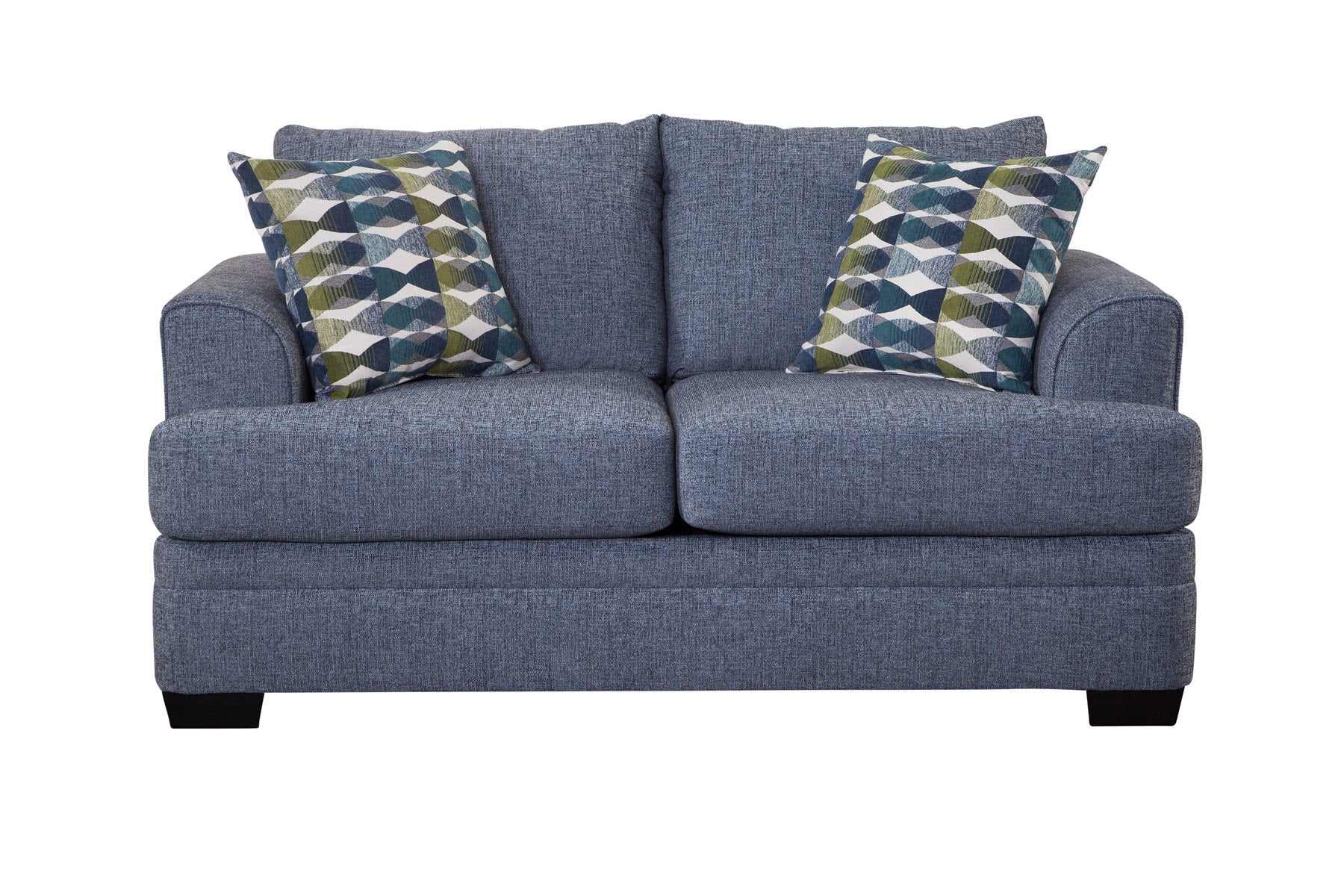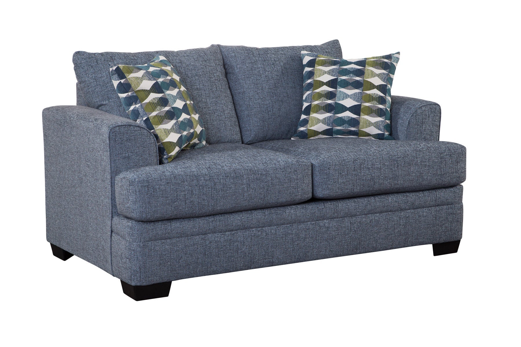 This loveseat features gently rounded arms in a transitional style, complemented by a two-over-two seat and back cushion design. The back cushions are securely attached, while the seat cushions are reversible, allowing for extended wear and versatility. Upholstered in a rich navy blue chenille, the fabric offers a combination of softness and durability. Two accent pillows in a modern jacquard fabric, showcasing a blend of spring green and shades of blue on an ivory background, add a pop of color. Designed to comfortably seat two, this sofa is a versatile addition to any floor plan.