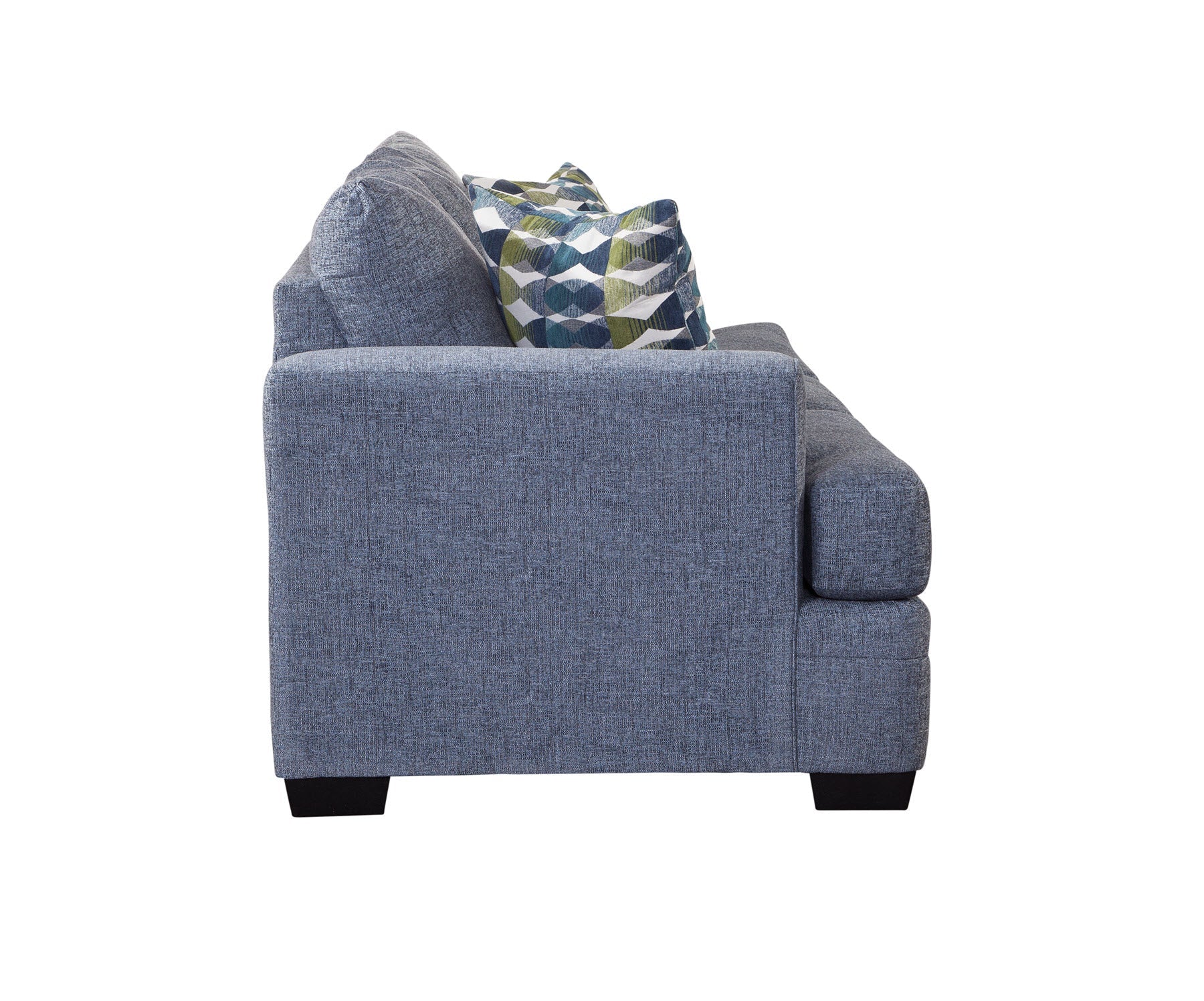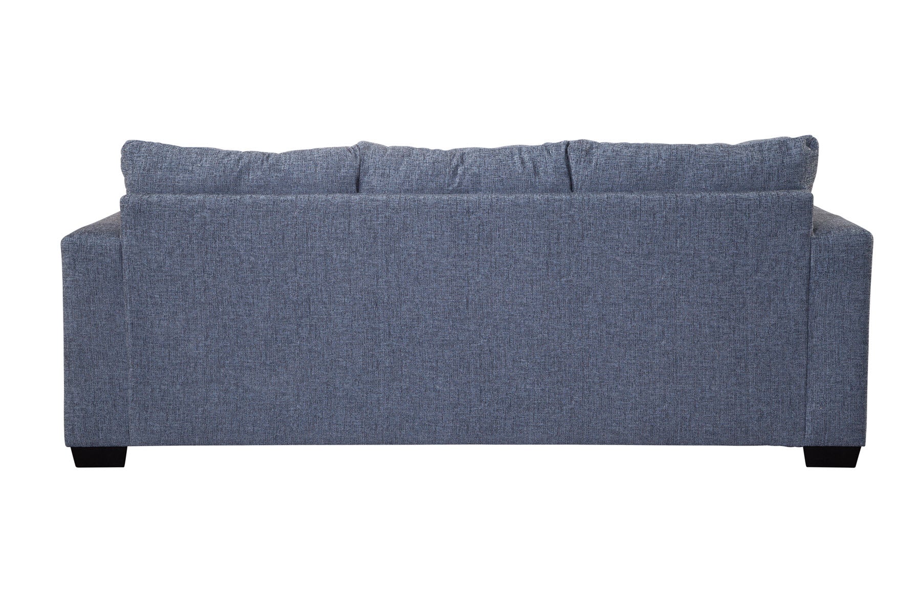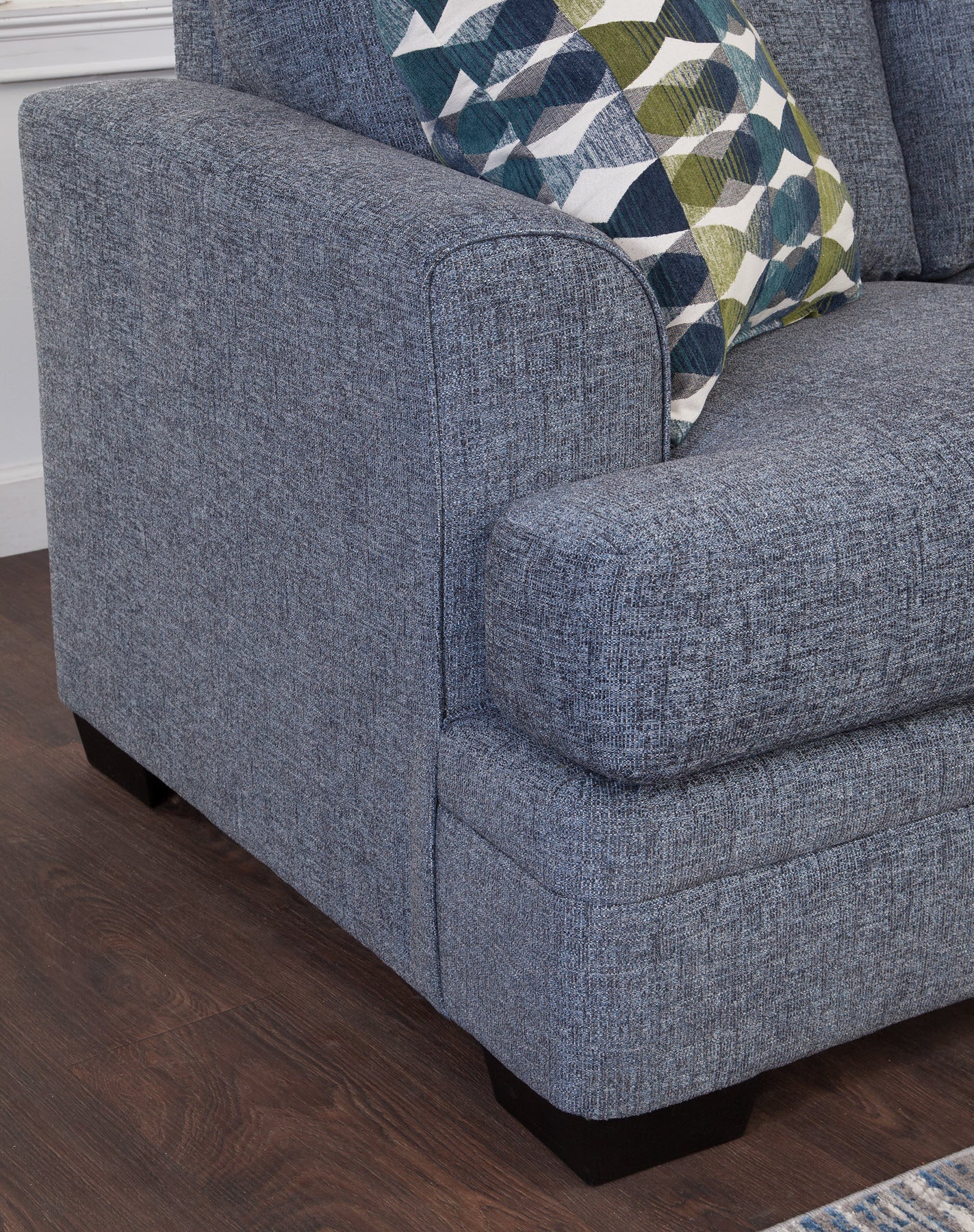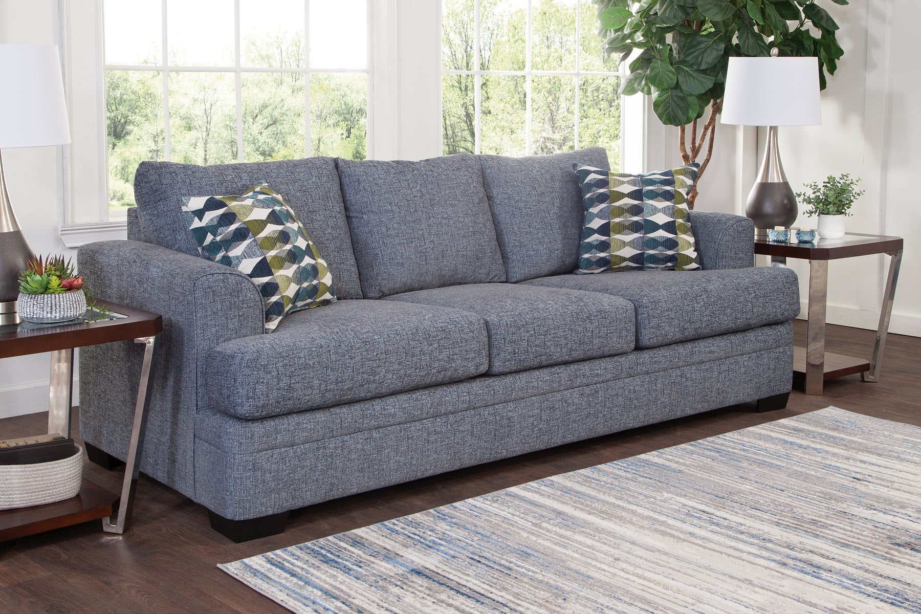 This sofa features gently rounded arms in a transitional style, complemented by a three-over-three seat and back cushion design. The back cushions are securely attached, while the seat cushions are reversible, allowing for extended wear and versatility. Upholstered in a rich navy blue chenille, the fabric offers a combination of softness and durability. Two accent pillows in a modern jacquard fabric, showcasing a blend of spring green and shades of blue on an ivory background, add a pop of color. Designed to comfortably seat three, this sofa is a versatile addition to any floor plan.