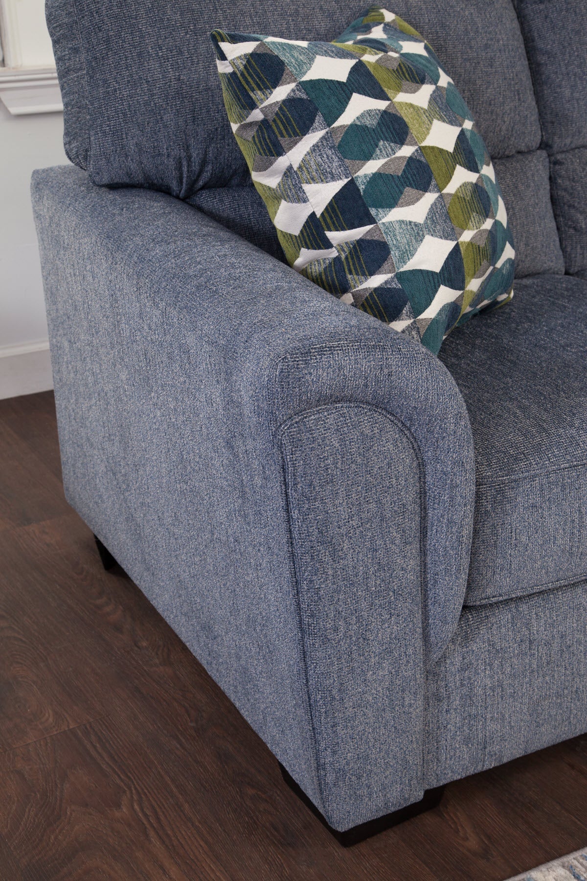 This loveseat provides a cozy seating solution with a compact footprint, making it suitable for almost any space. The non-reversible seat and back cushions offer support, and high-density foam ensures long-lasting durability and comfort. A padded roll arm adds both style and comfort, making this sofa an ideal choice for any room. Manufactured in the USA, it comfortably seats up to two people, perfect for small-space living.