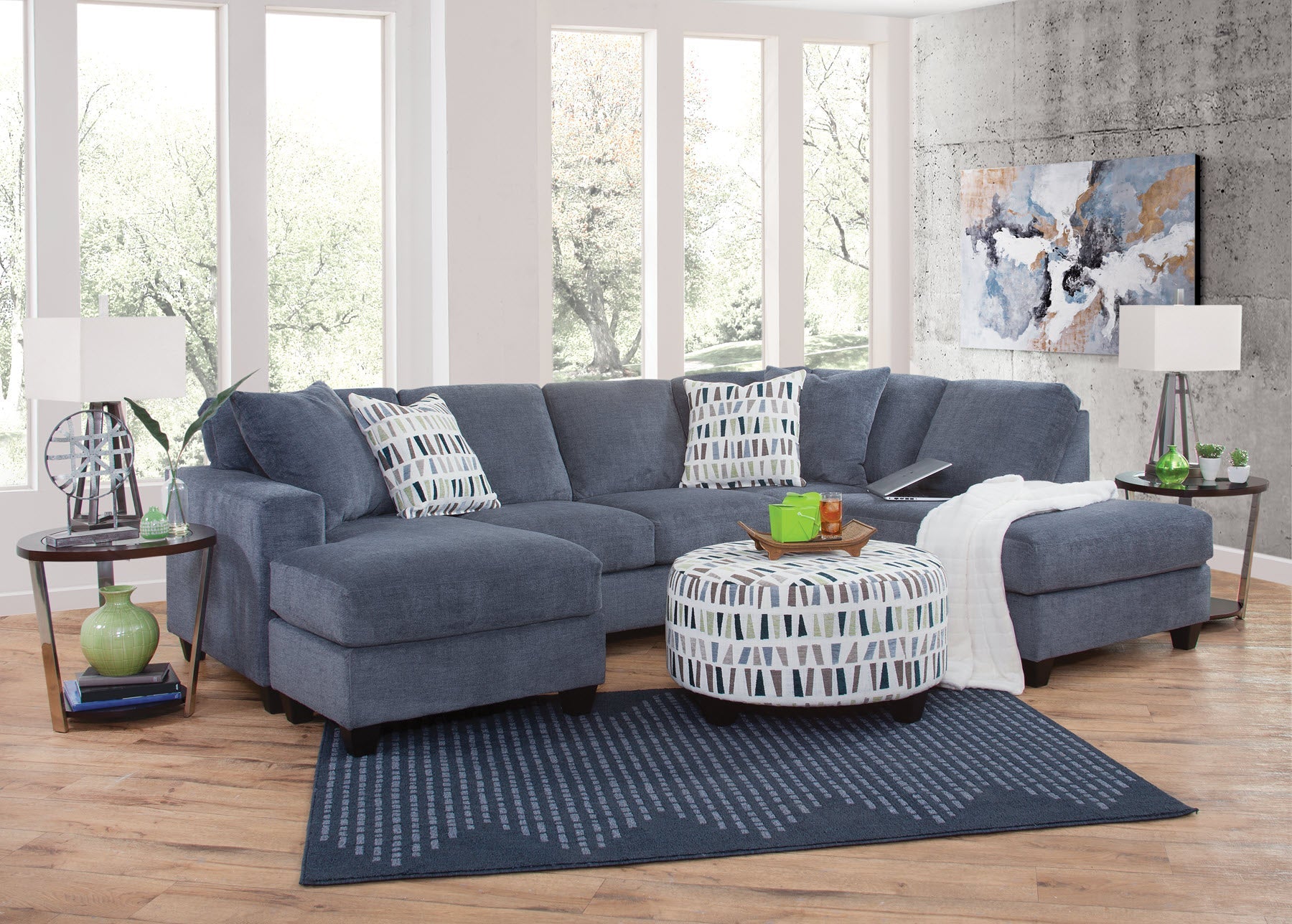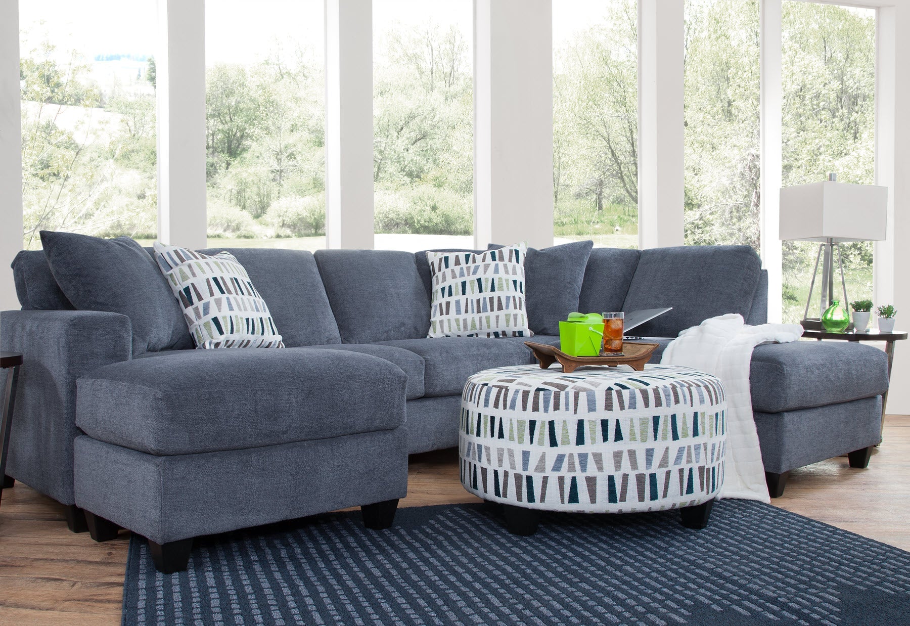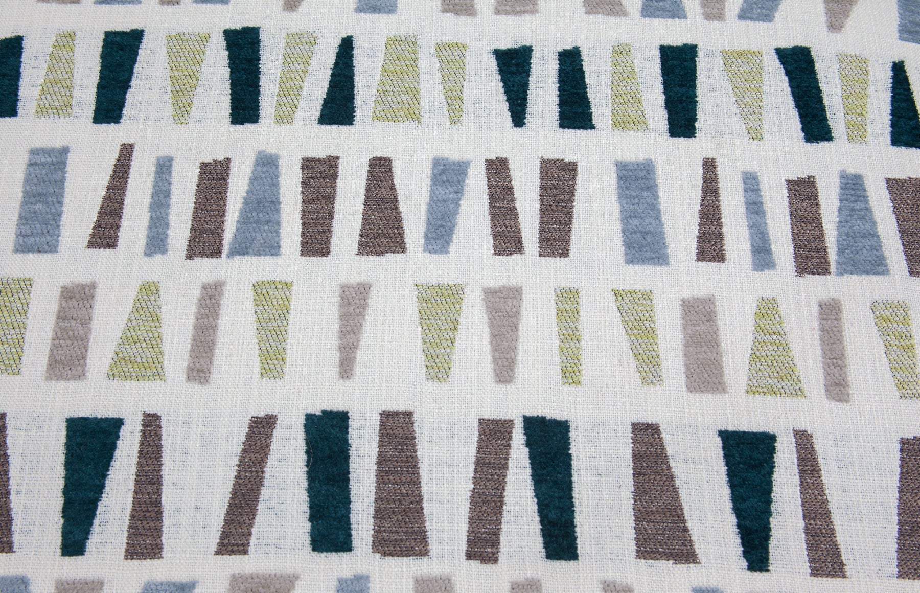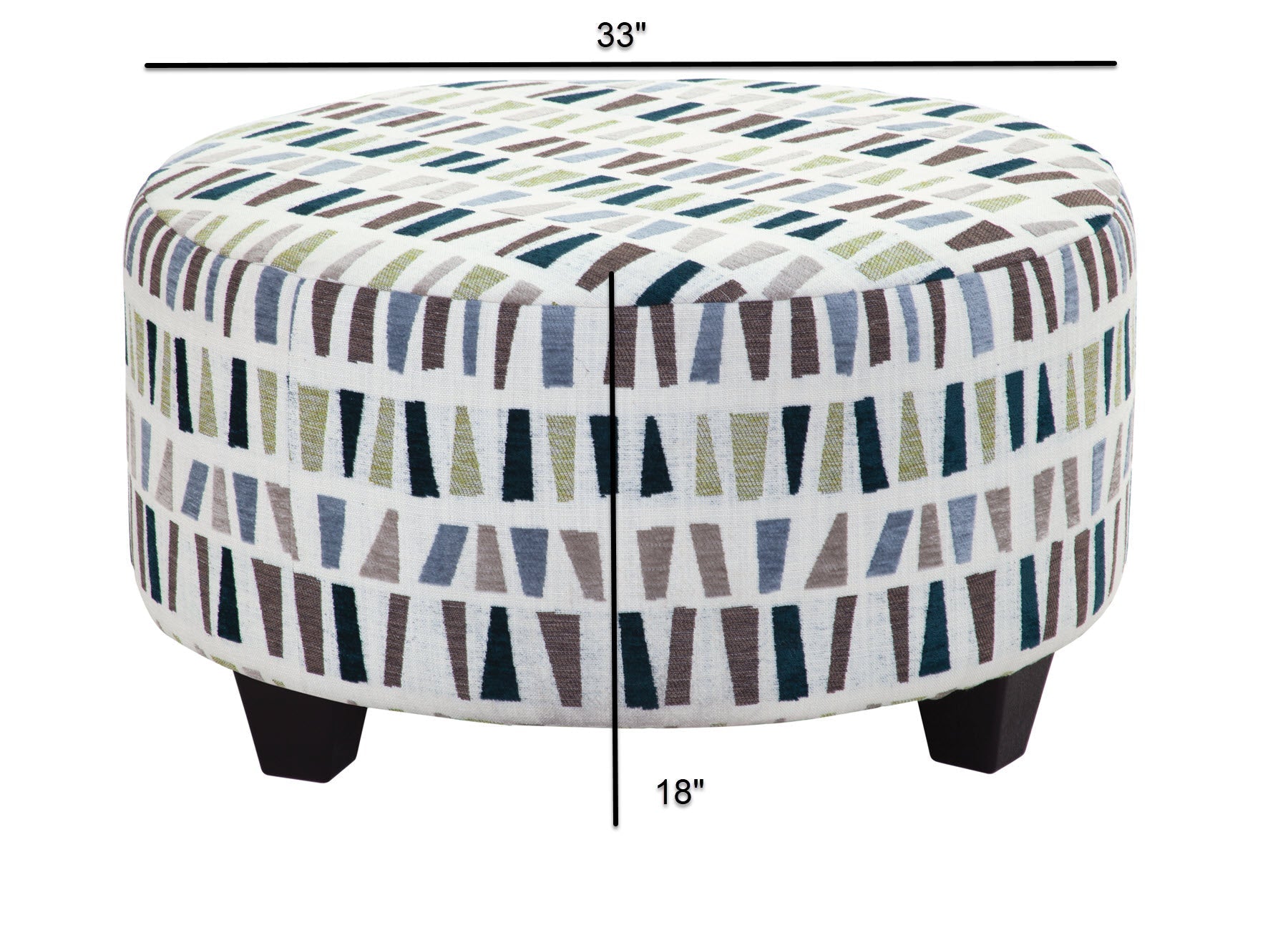 Round accent ottoman in a high impact geometric pattern. Background is ivory with shades of blue, green and taupe. Use for seating or as a cocktail table.