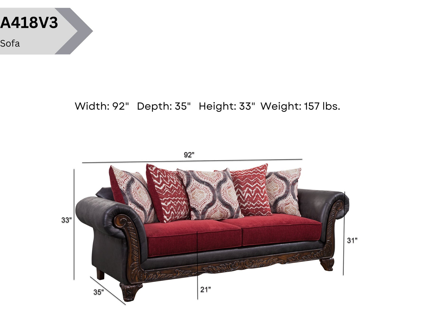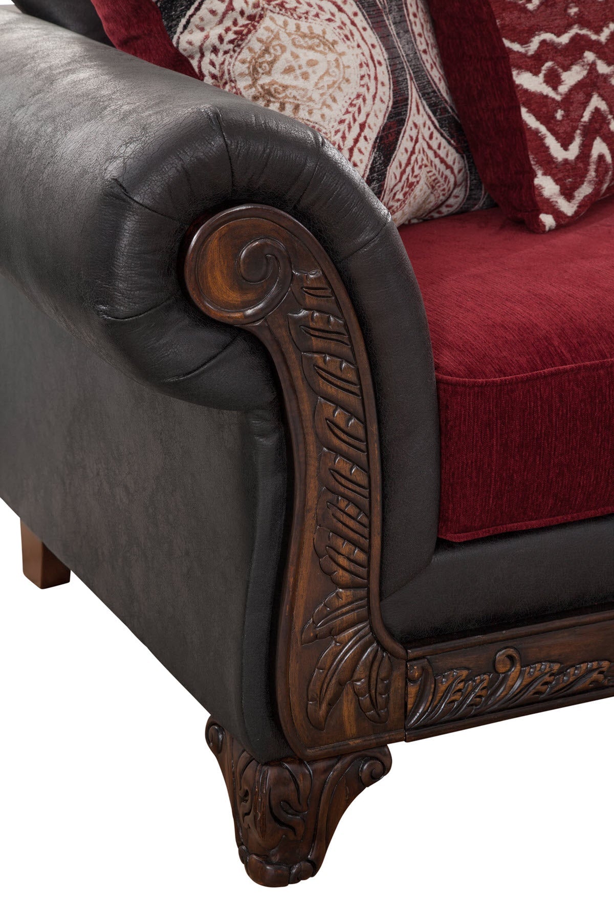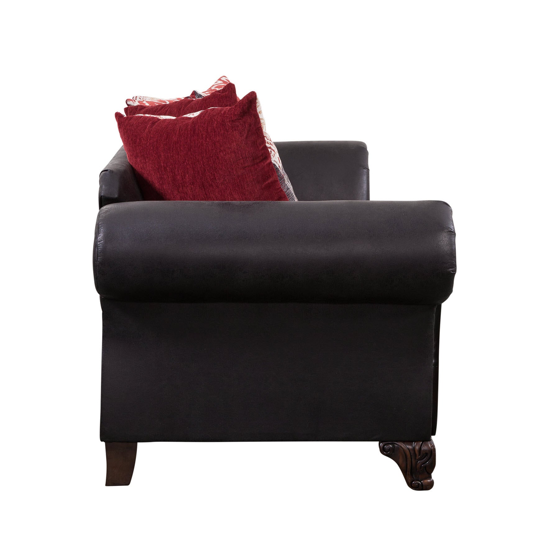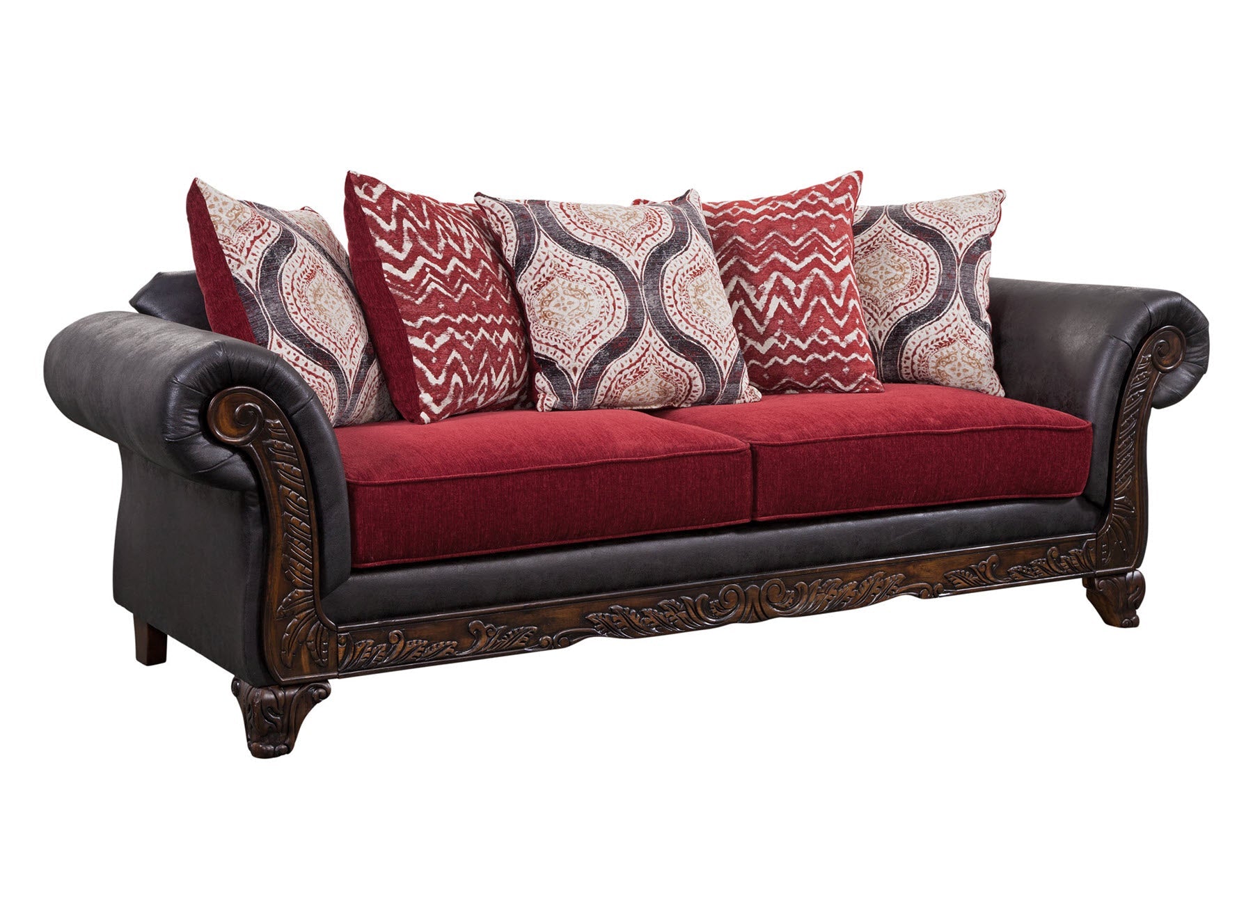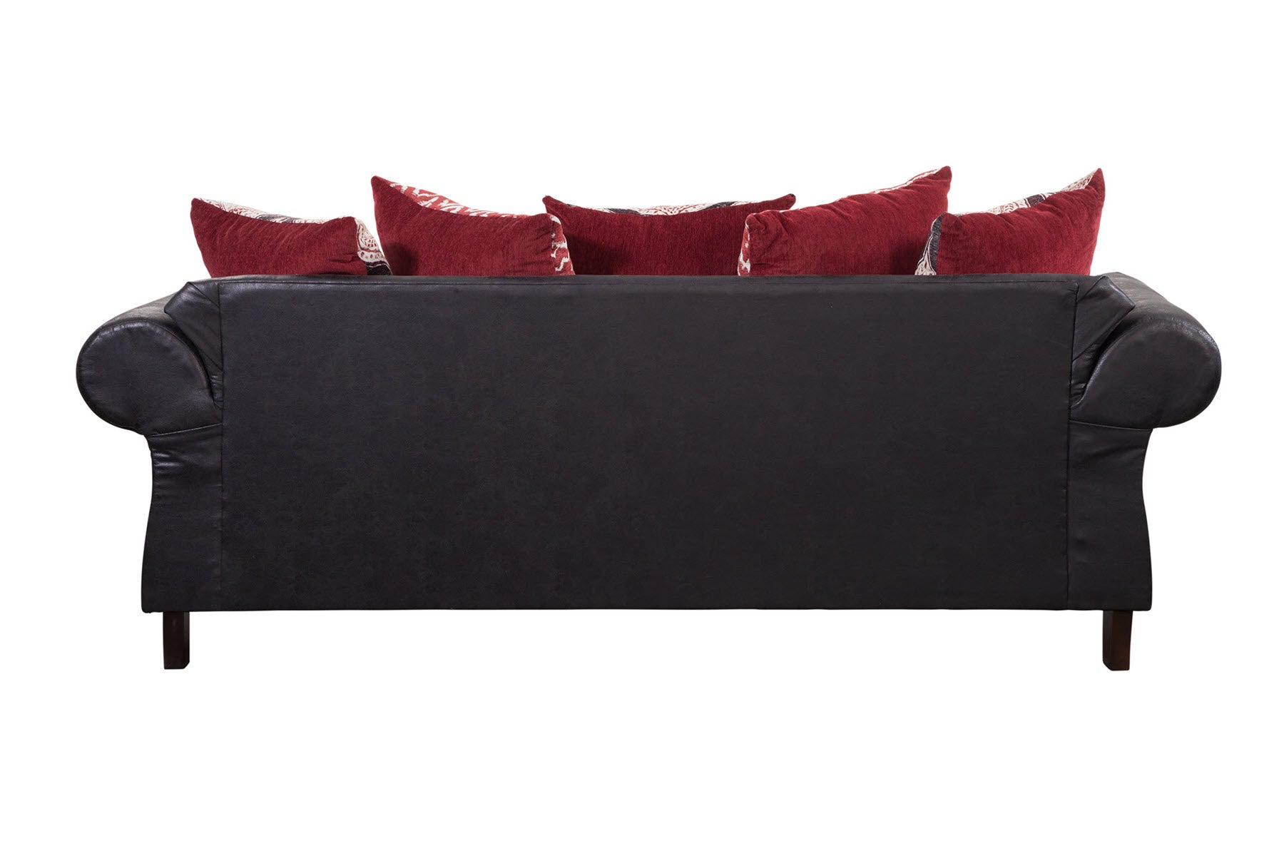 Elevate your living space with this traditional sofa, a testament to traditional sophistication and modern comfort. Crafted on a sturdy rolled arm frame adorned with exquisite show wood details, this ensemble boasts a luxurious polyester base in charcoal with a sleek vinyl finish. The cushions, in their rich, chenille-textured scarlet red, beckon relaxation and warmth, while the vibrant patterns of the loose back pillows add a contemporary flair. Embrace the deep allure of this sofa and indulge in timeless elegance in your home.