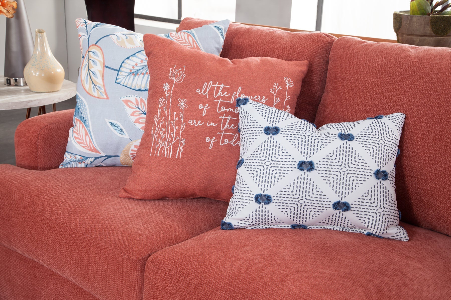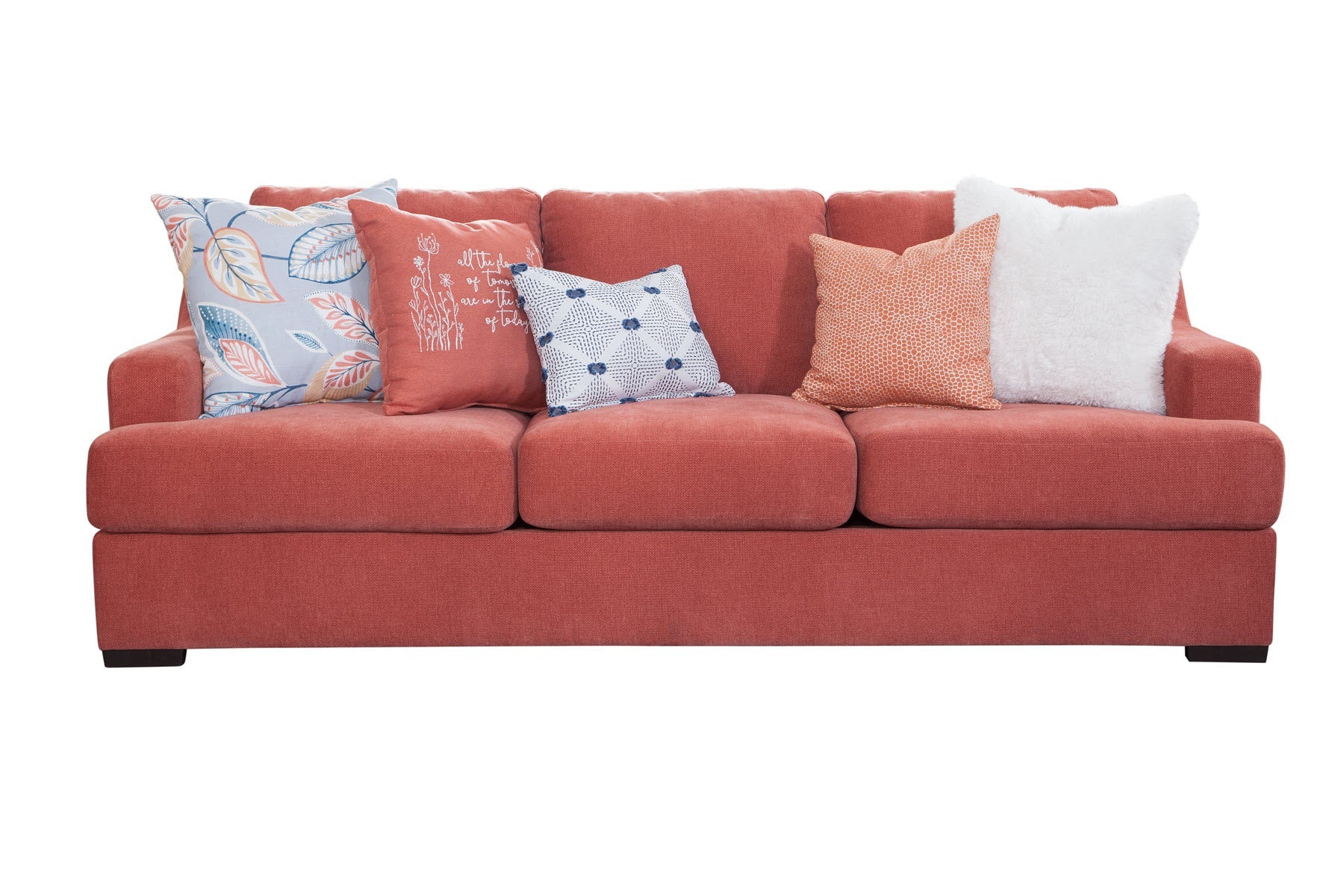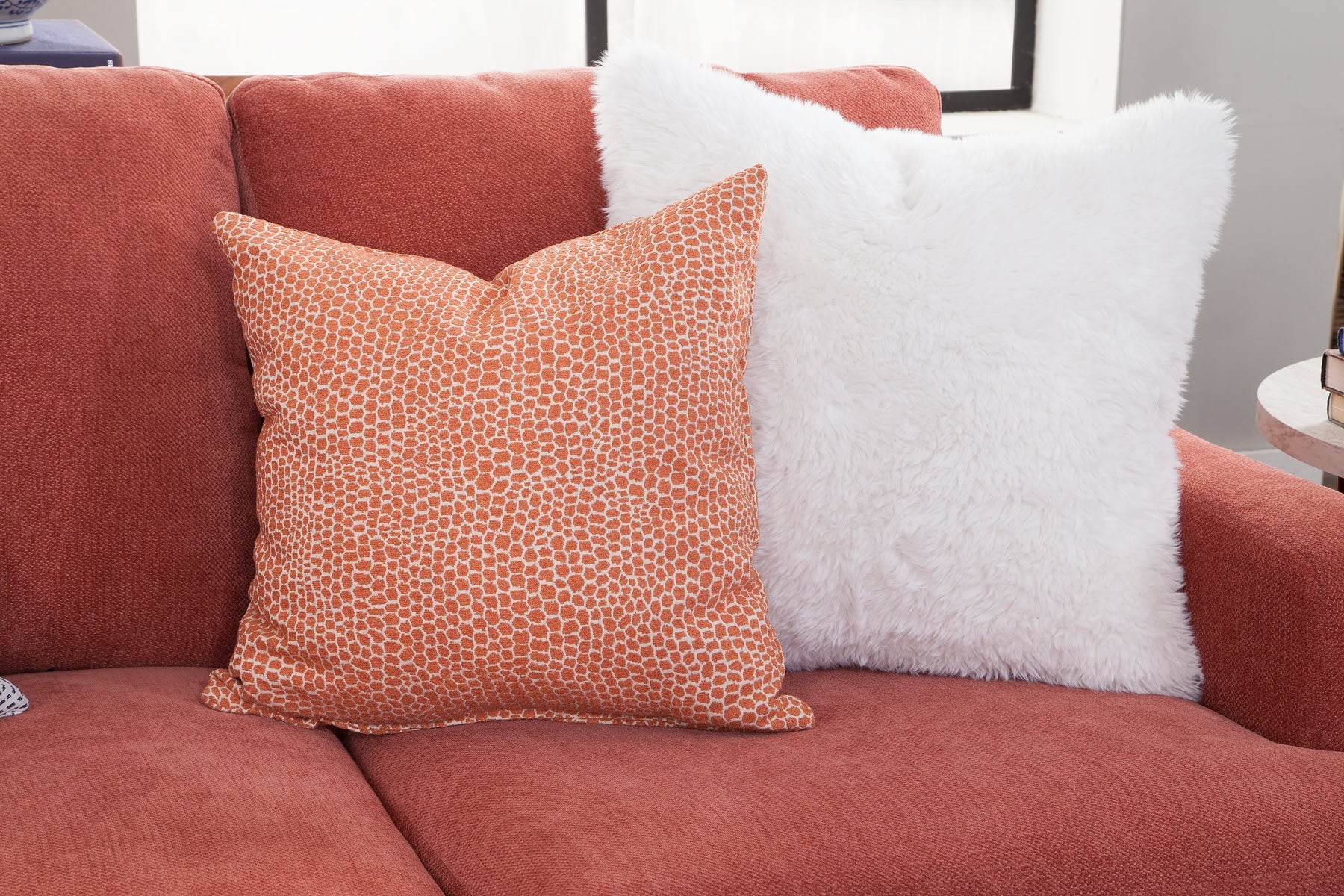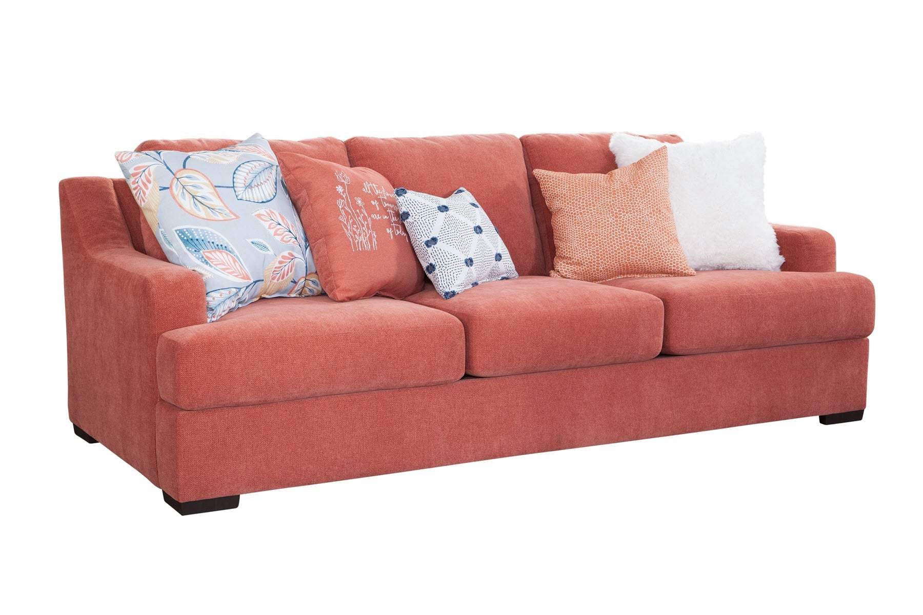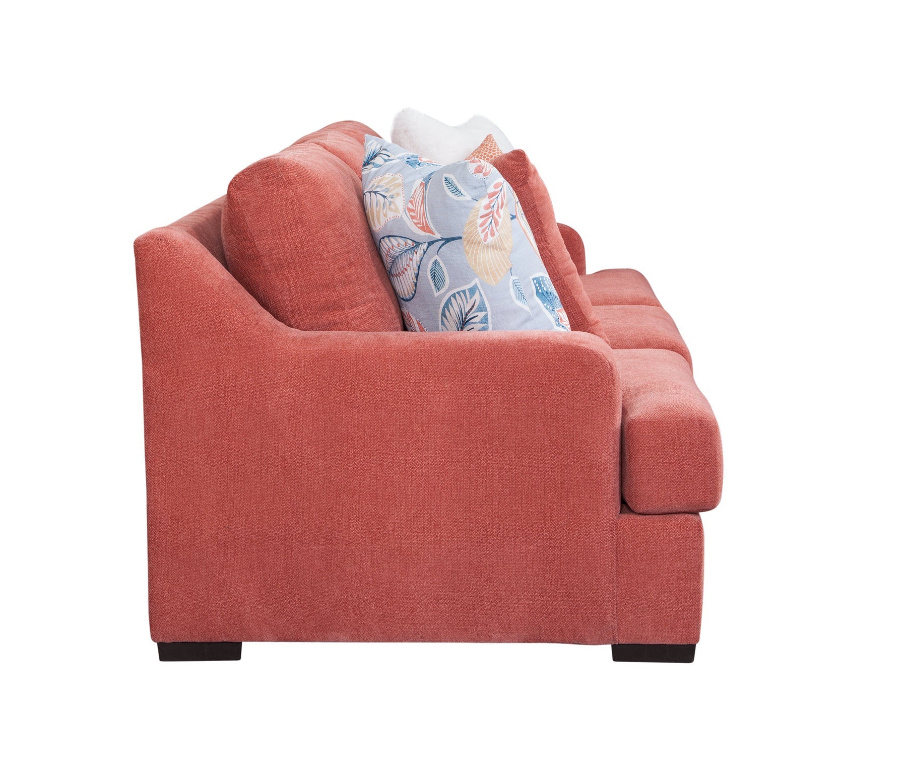 This sofa offers a bold and eclectic twist on a classic sloped-arm design. Upholstered in a vibrant paprika-colored chenille, the fabric is both soft to the touch and highly durable. The reversible back and seat cushions provide additional longevity, making this piece ideal for everyday use. Accompanied by an assortment of five accent pillows, each featuring unique fabrics—such as fur, animal print, floral, text, and textured patterns in complementary colors—this sofa exudes a boho flair. With its lively and colorful appearance, it serves as a striking conversation piece while comfortably seating three and fitting seamlessly into most floor plans.
