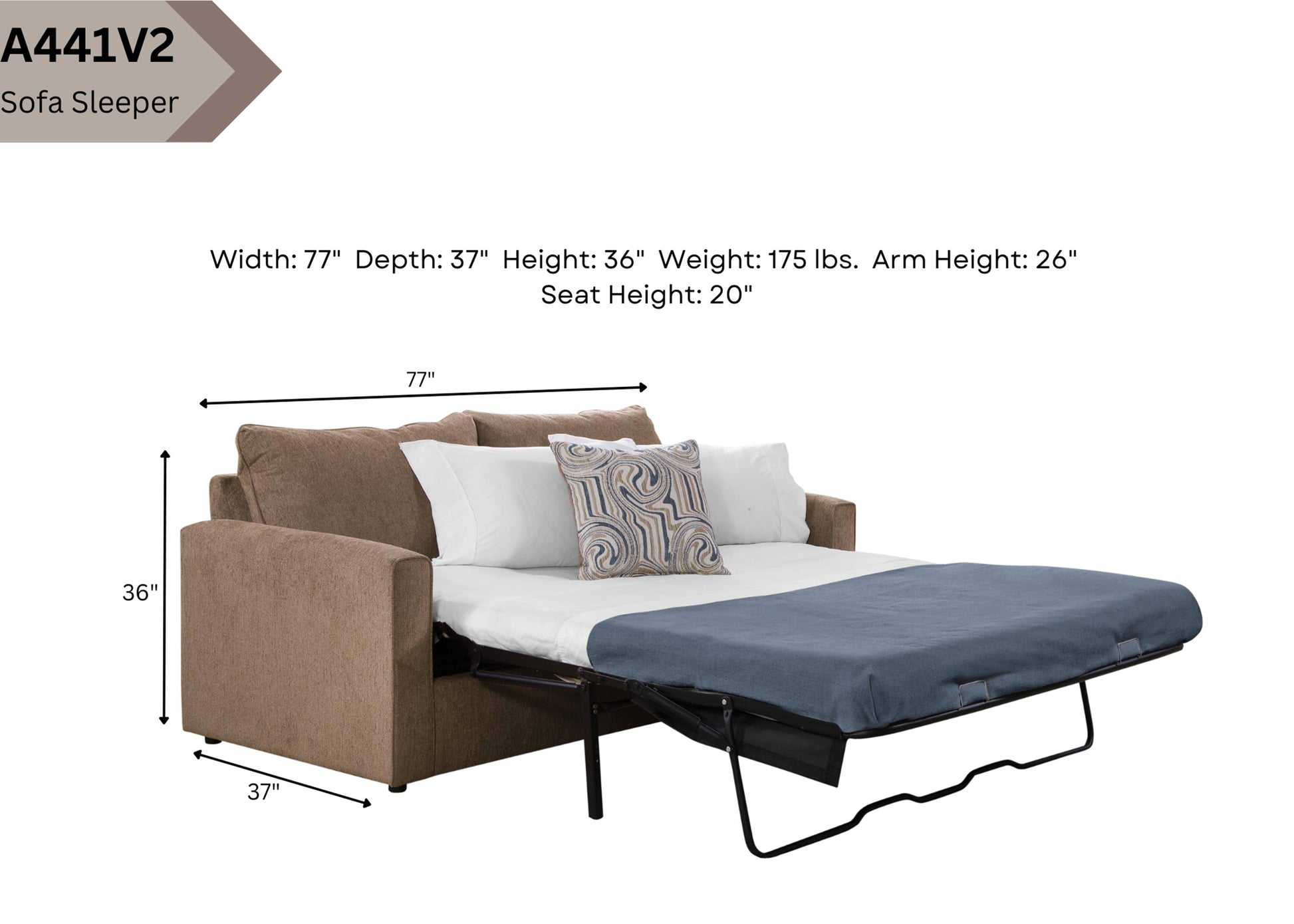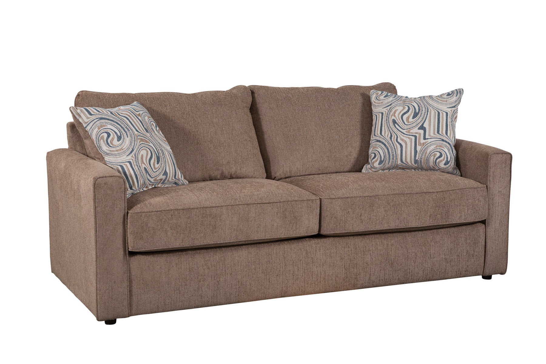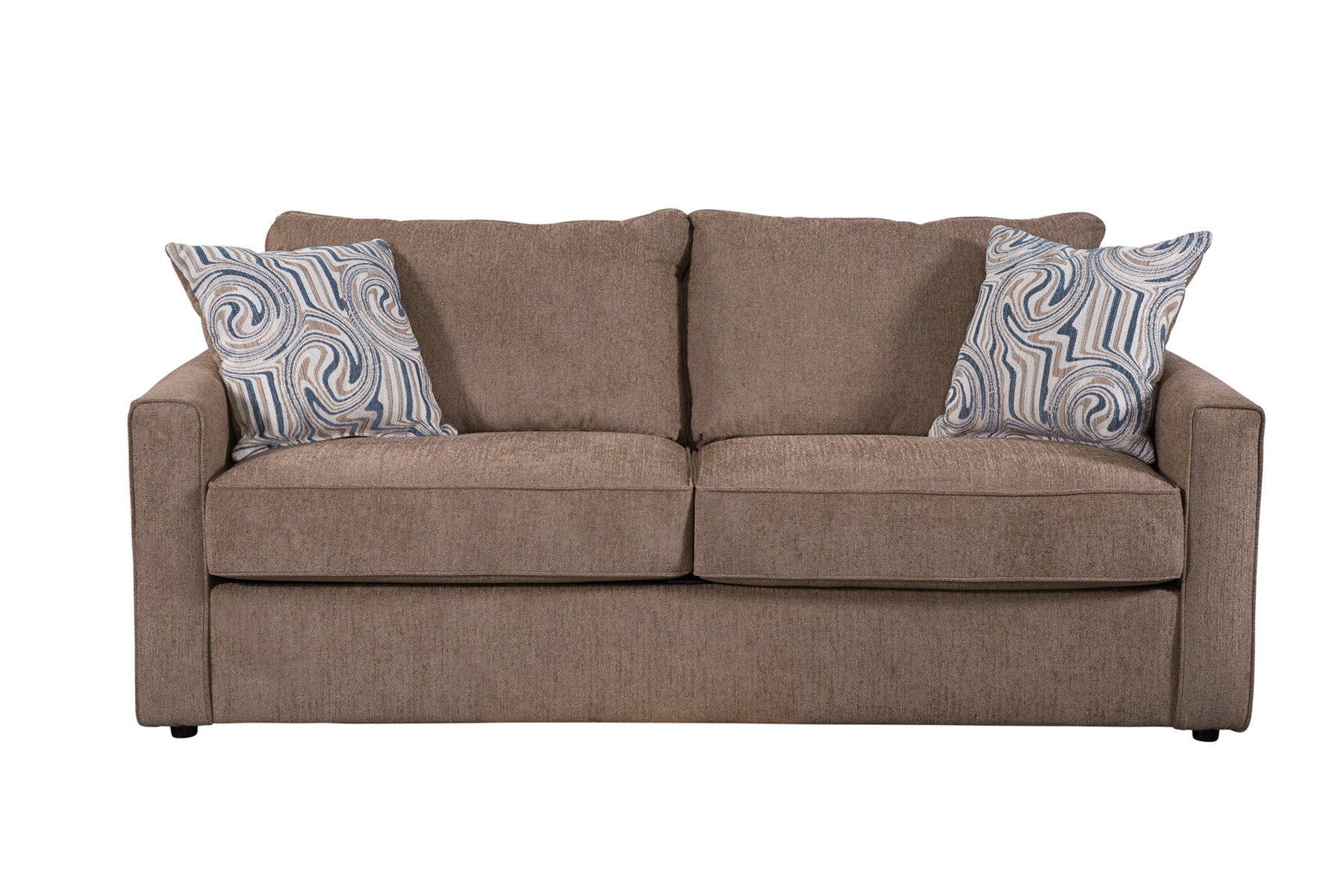 An urban modern style with narrow rounded track arms. The soft chenille fabric is a latte color, light neutral brown. Accent pillows are in a modern jacquard swirl pattern in shades of aquamarine and latte on an ivory background. The back cushions are attached, and the seat cushions are removable but non reversible. Sleeper sofa is a two over two style that can seat three comfortably. A perfect sofa for small space living. The pullout sleeper adds additional sleeping space.