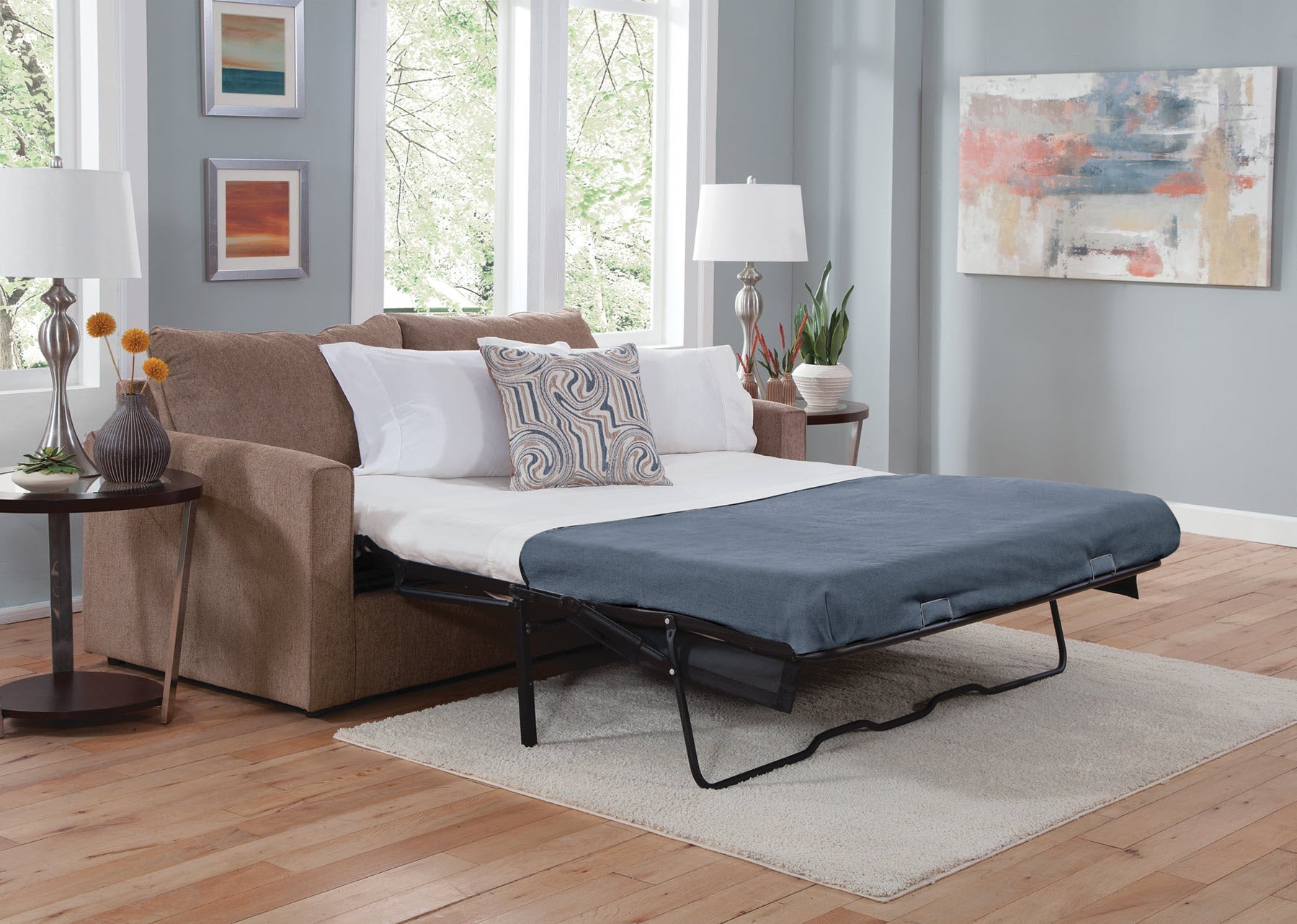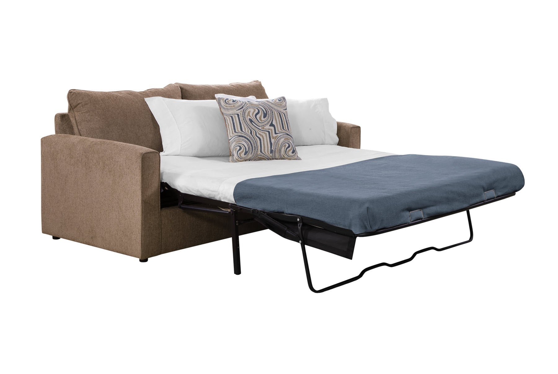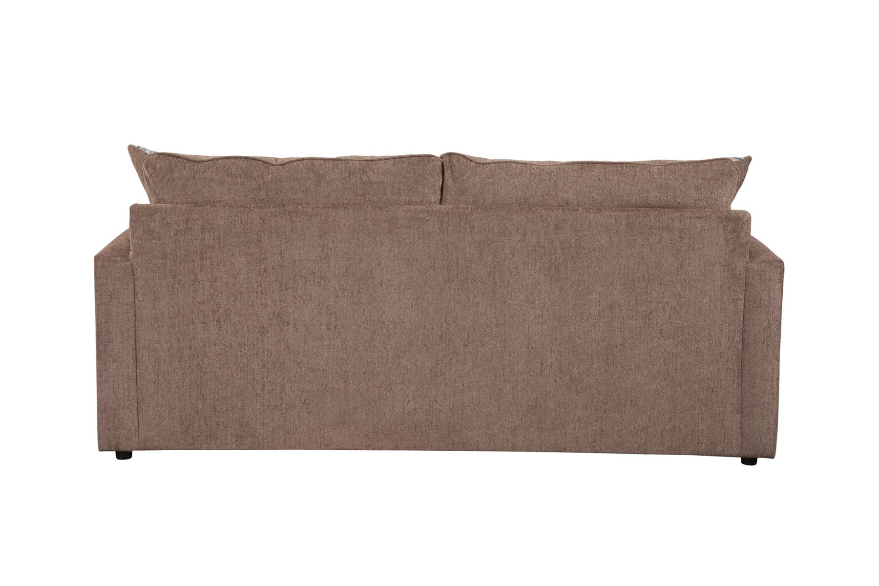 An urban modern style with narrow rounded track arms. The soft chenille fabric is a latte color, light neutral brown. Accent pillows are in a modern jacquard swirl pattern in shades of aquamarine and latte on an ivory background. The back cushions are attached, and the seat cushions are removable but non reversible. Sleeper sofa is a two over two style that can seat three comfortably. A perfect sofa for small space living. The pullout sleeper adds additional sleeping space.