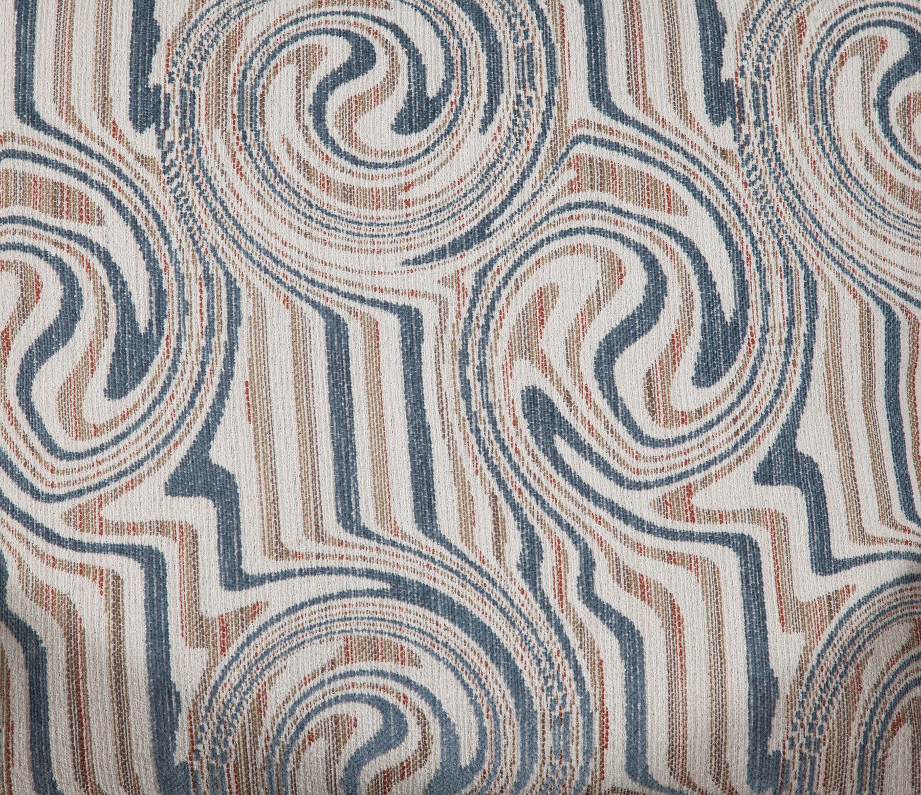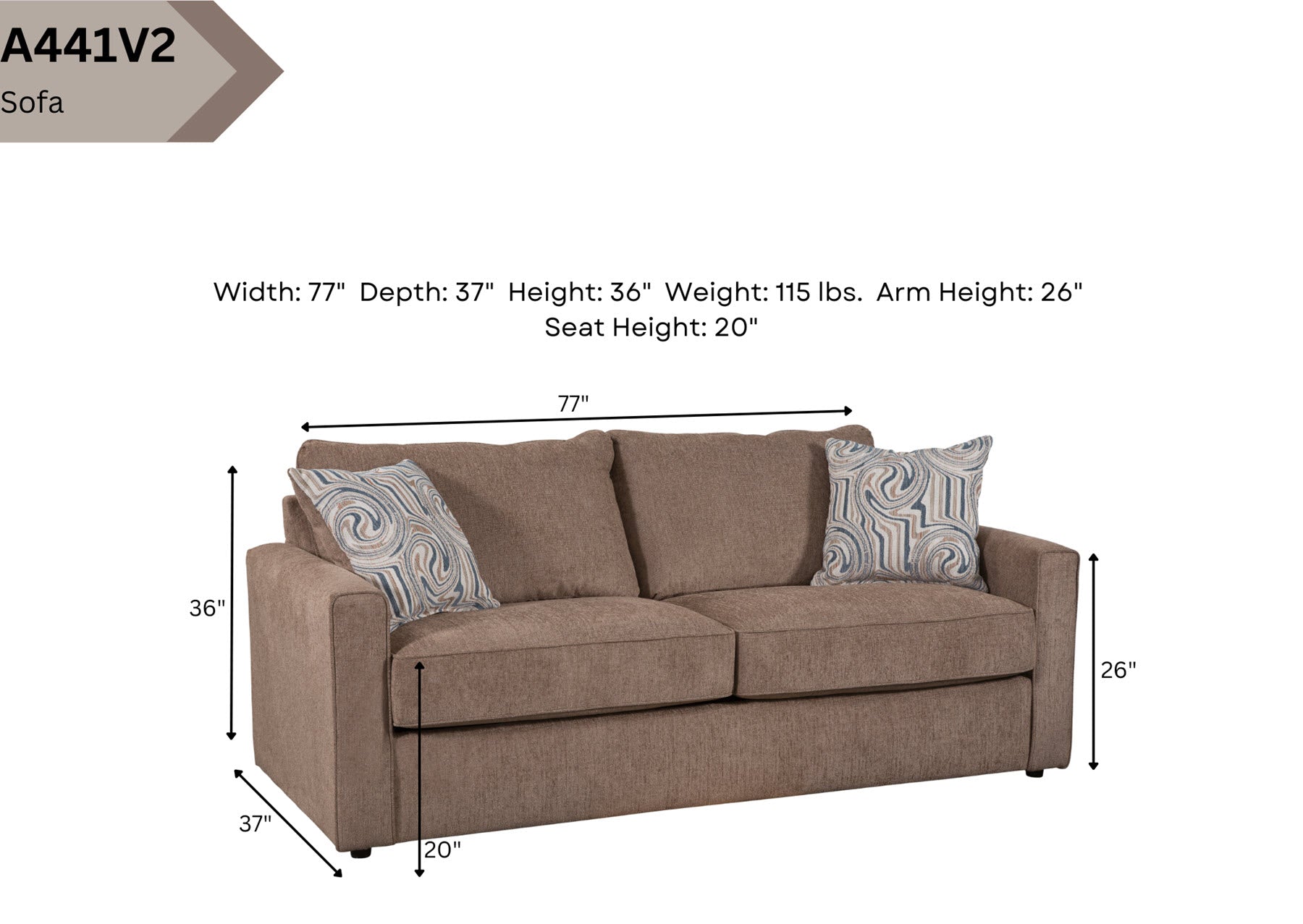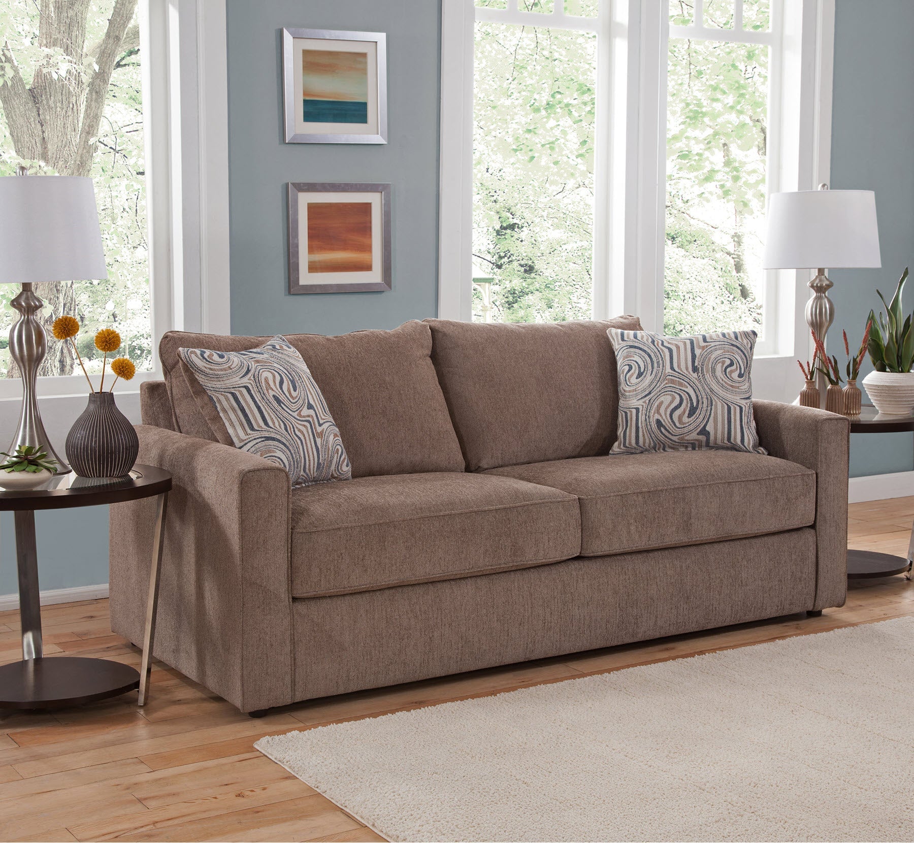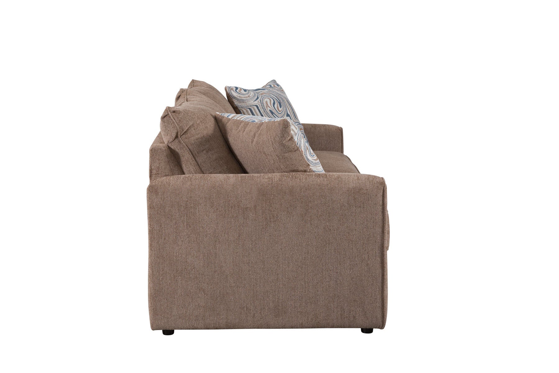 An urban modern style with narrow rounded track arms. The soft chenille fabric is a latte color, light neutral brown. Accent pillows are in a modern jacquard swirl pattern in shades of aquamarine and latte on an ivory background. The back cushions are attached, and the seat cushions are removable but non-reversible. Sofa is a two over two style that can seat three comfortably. A perfect sofa for small space living