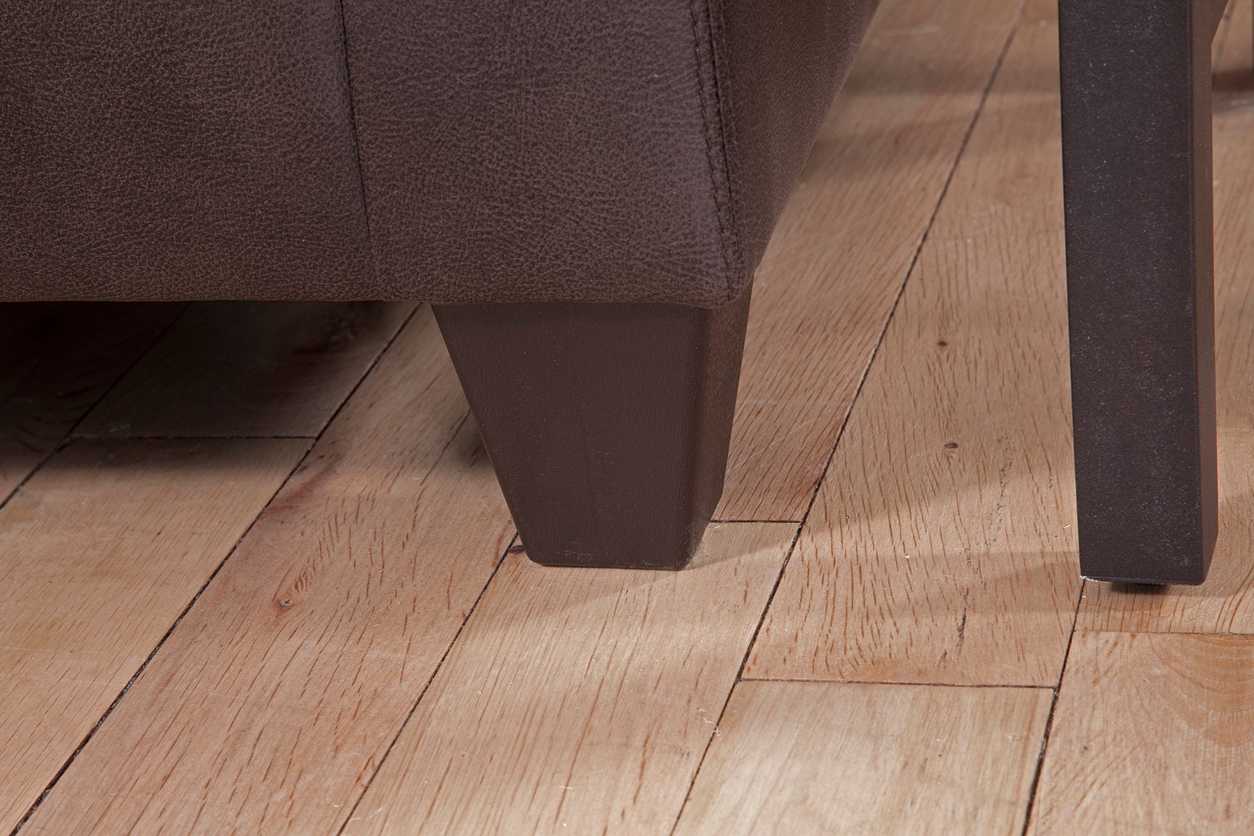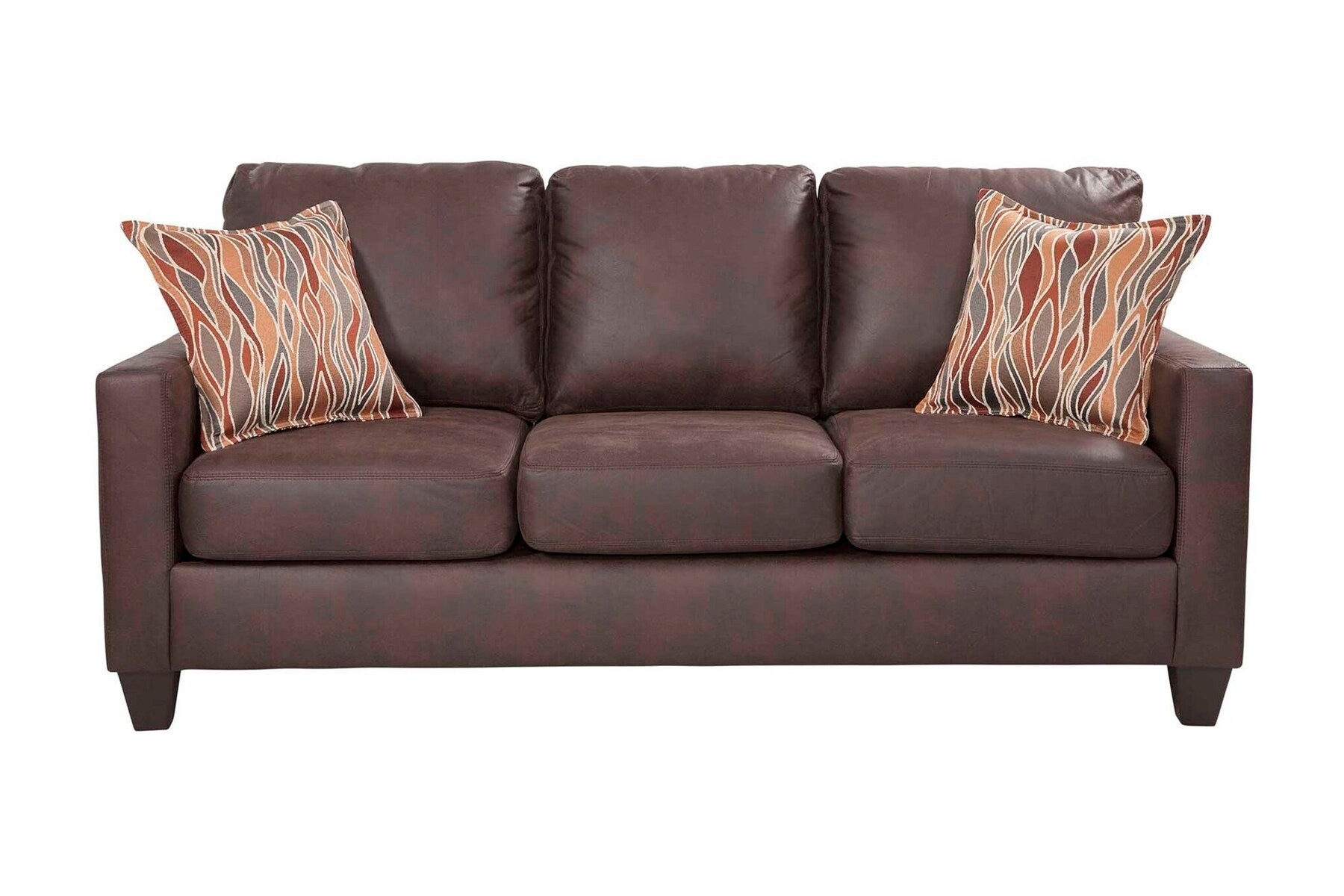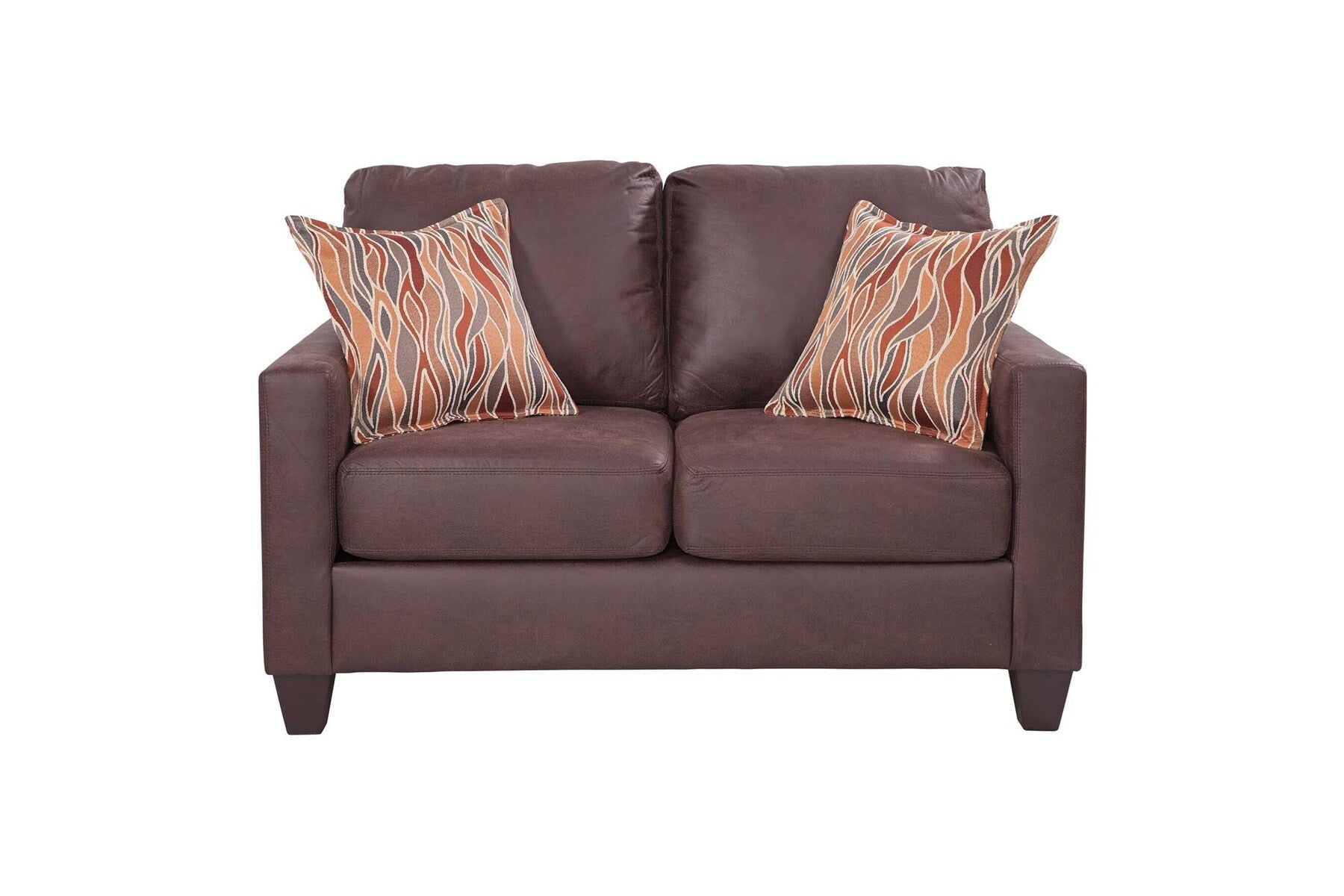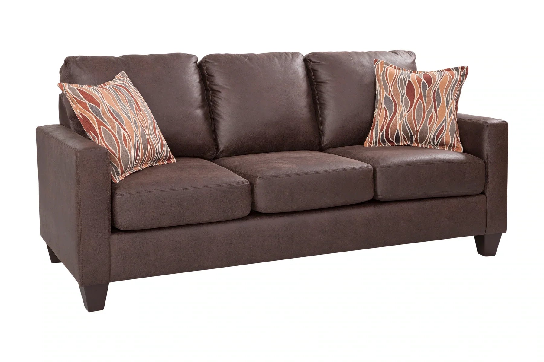 This is modern and sleek furniture set that will truly add style and vibrance to your living room. This sofa is covered in a faux leather that is 100% polyester. This sofa is a smaller scale sofa that can fit into any floor plan adding both style and comfort. This sofa and love seat have reversible seat cushions and attached back cushions for protection against wear and tear. The accent pillows add a pop of color in a stylized modern design in shades of orange, brown and grey. This sofa can seat three people comfortably and the love seat can fit two people.