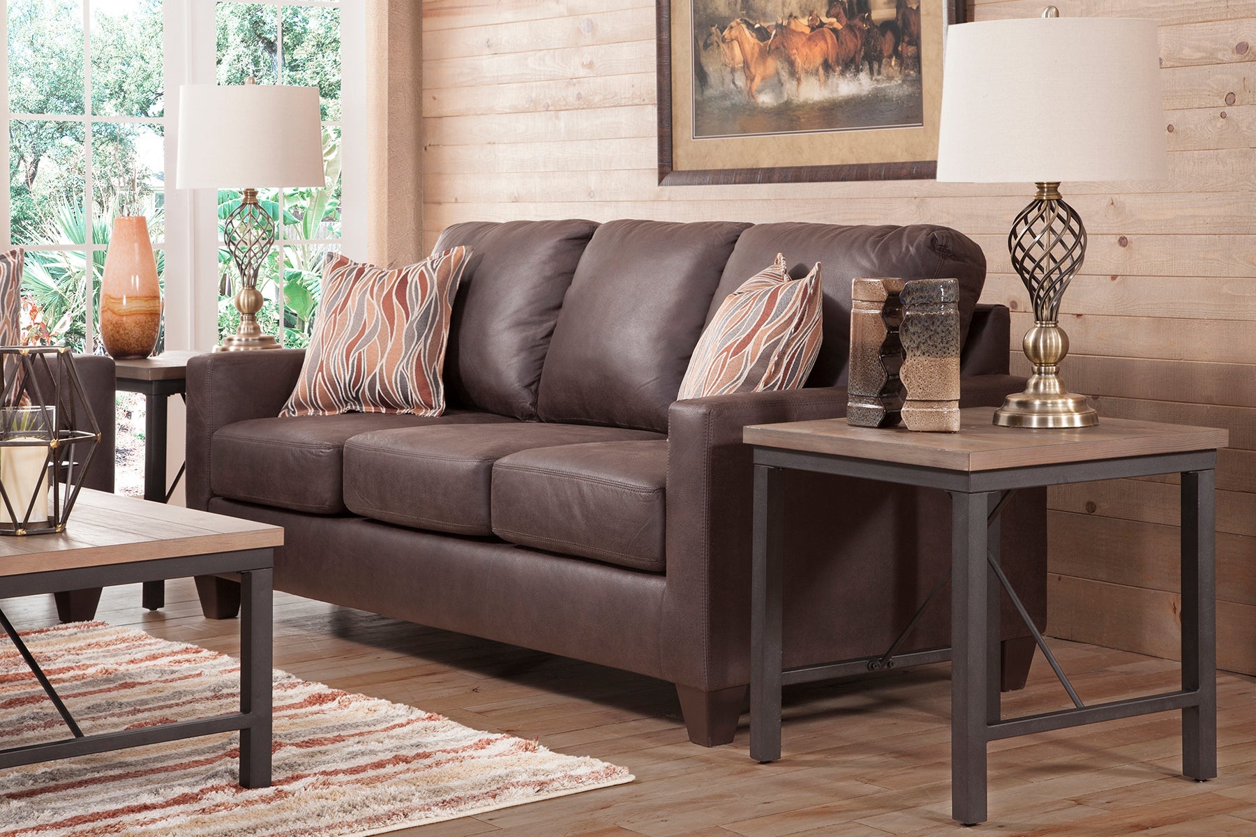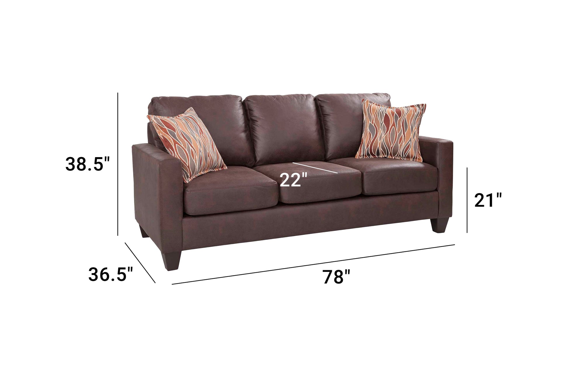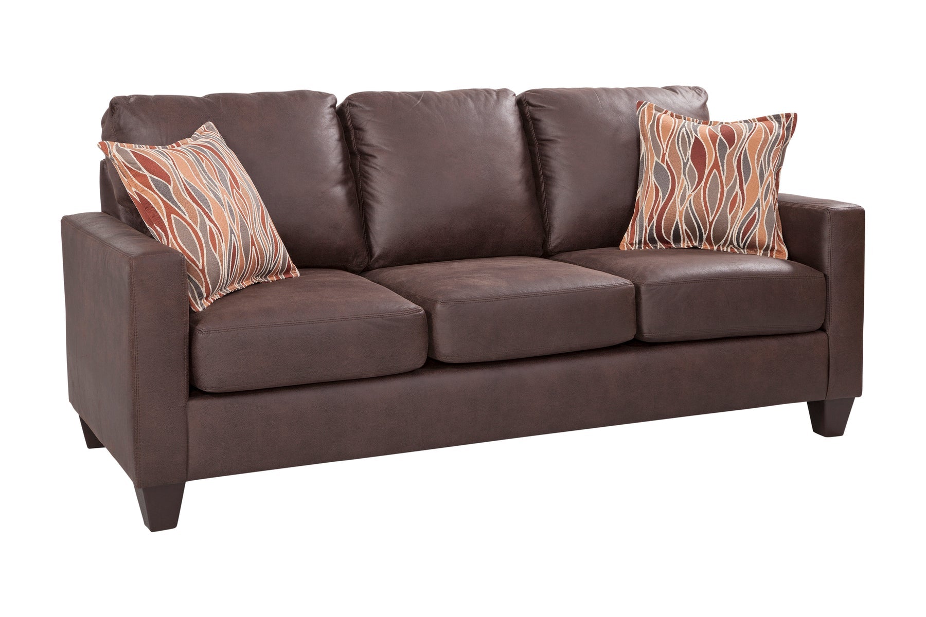 This is a modern track arm sofa that is in our urban loft collection. This sofa is covered in a faux leather that is 100% polyester. This sofa is a smaller scale sofa that can fit into any floor plan adding both style and comfort. This sofa has reversible seat cushions and attached back cushions for protection against wear and tear. The accent pillows add a pop of color in a stylized modern design in shades of orange, brown and grey. This sofa can seat three people comfortably.