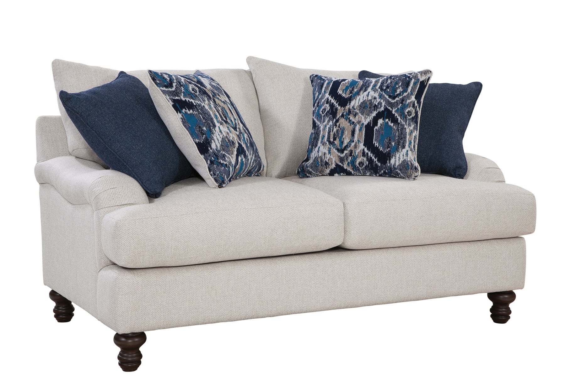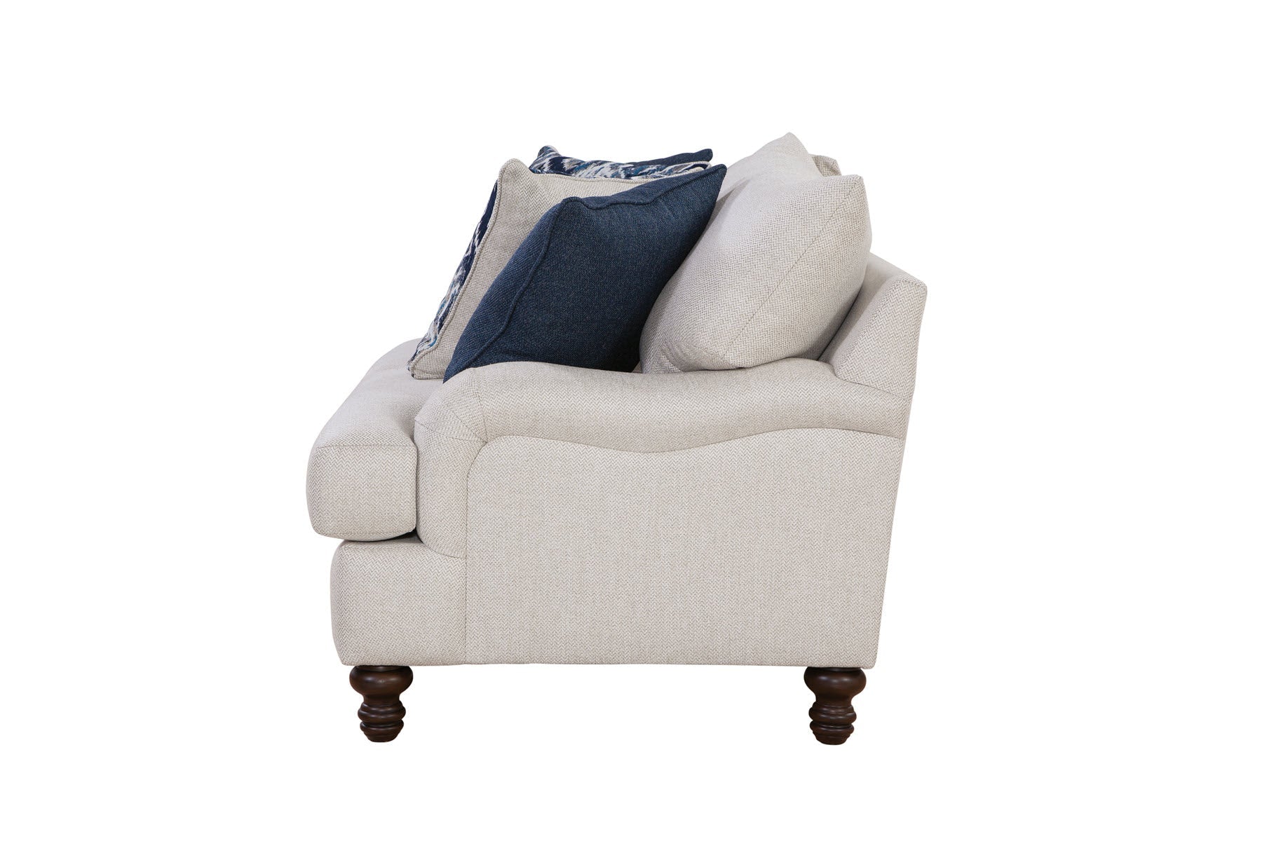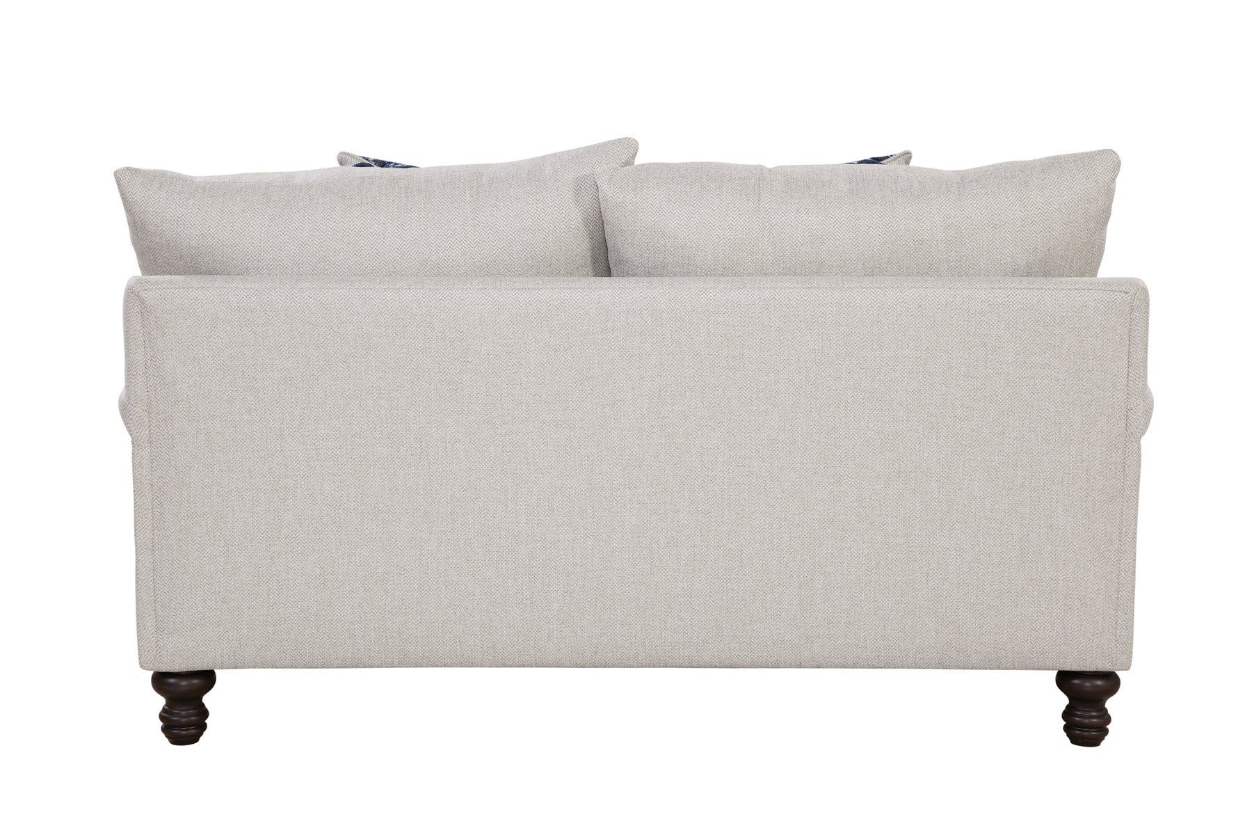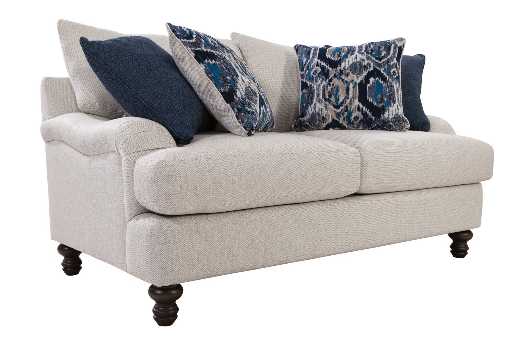 Transitional styling, rich colors and a soft geometric print blend beautifully together in this loveseat. The sculpted curved Charles of London arm ties in with rich carved wooden legs to create a classic look that is always in style. Reversible seat and back cushions for long life and durability are an added bonus.
