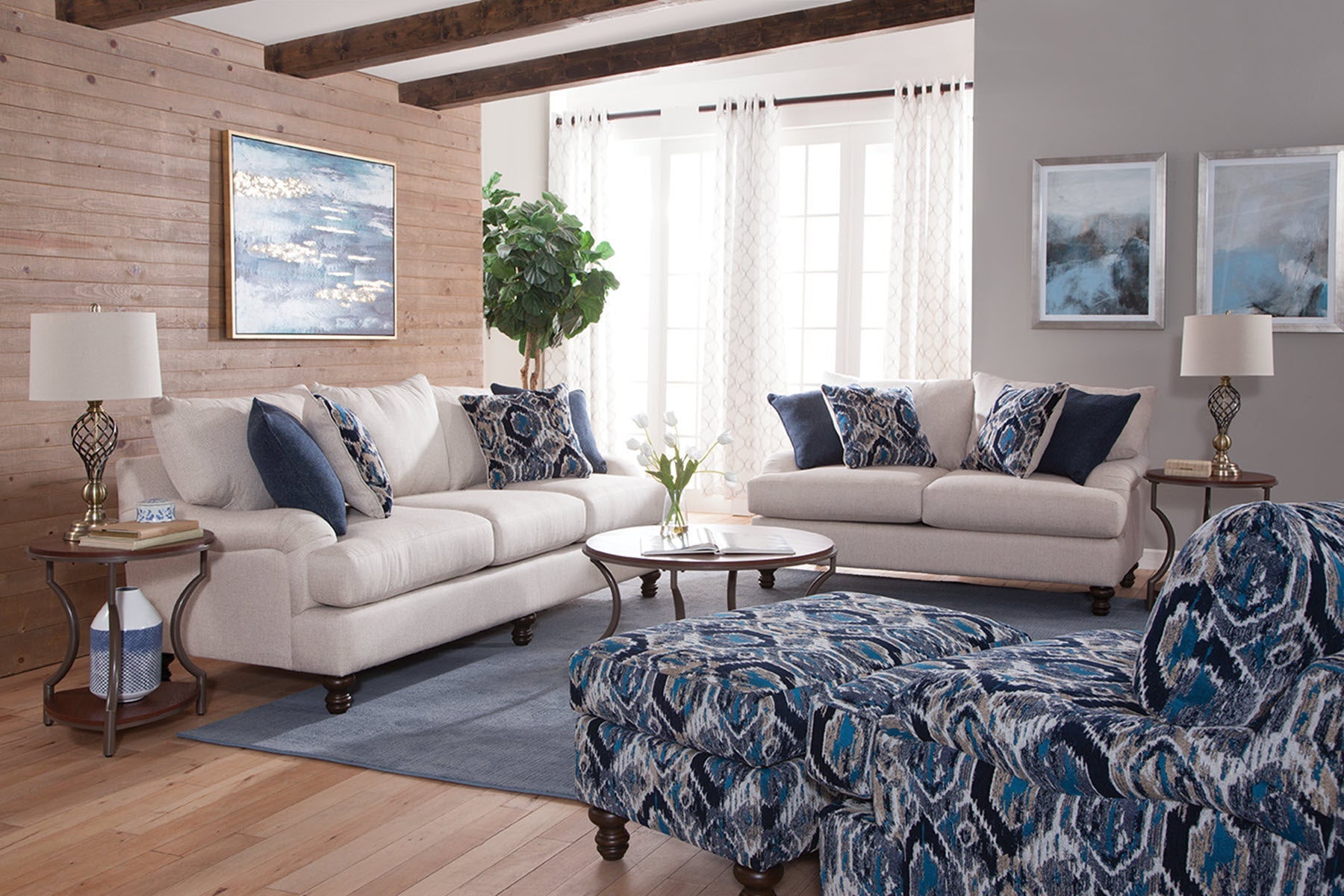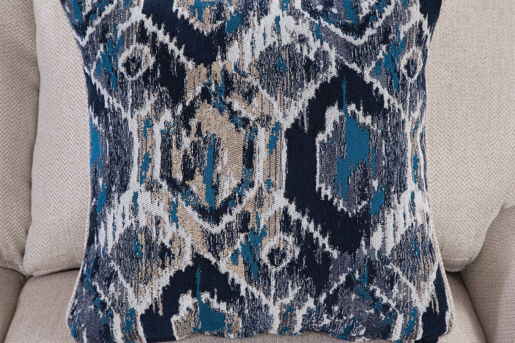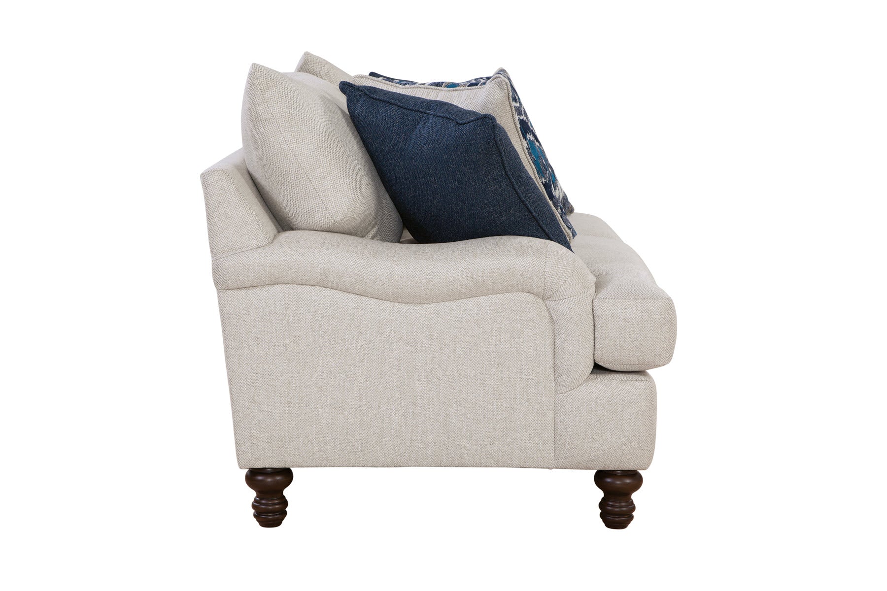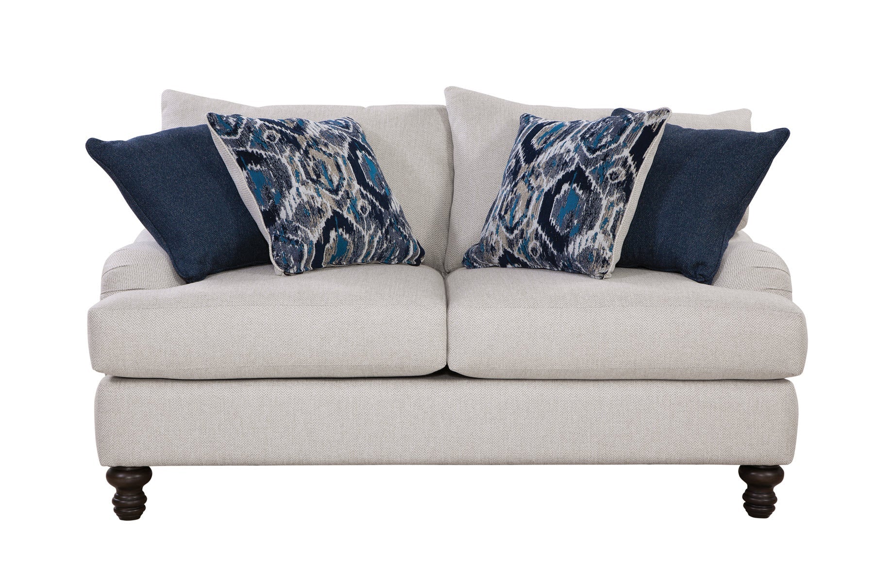Transitional styling, rich colors and a soft geometric print blend beautifully together in this loveseat. The sculpted curved Charles of London arm ties in with rich carved wooden legs to create a classic look that is always in style. Reversible seat and back cushions for long life and durability are an added bonus.