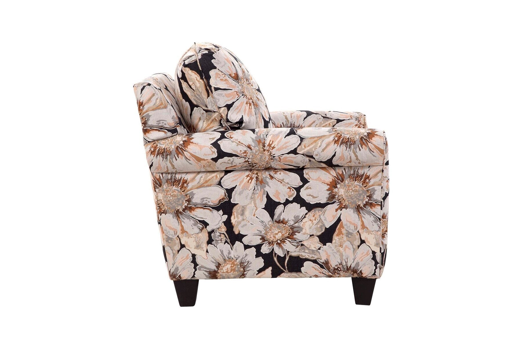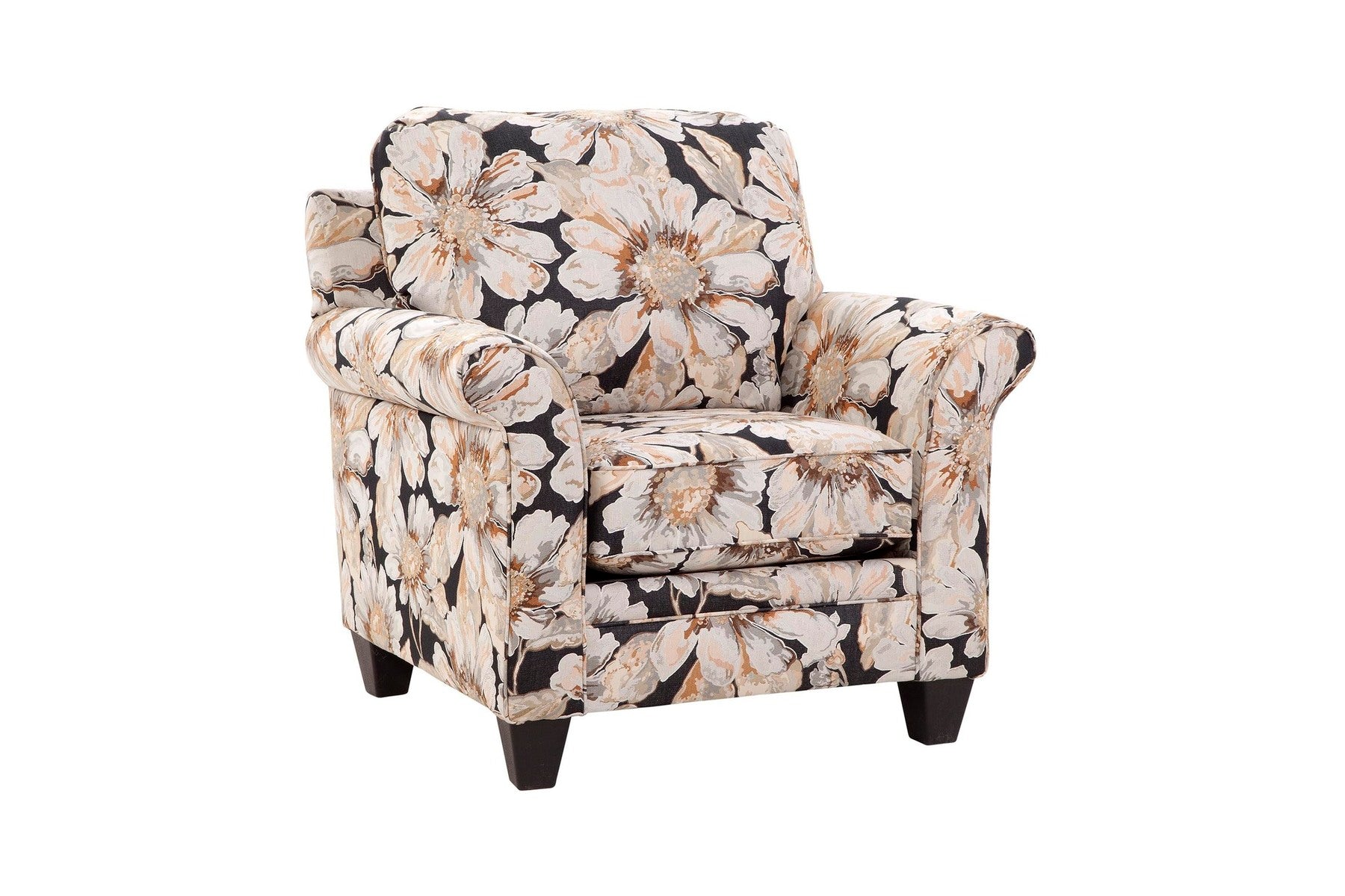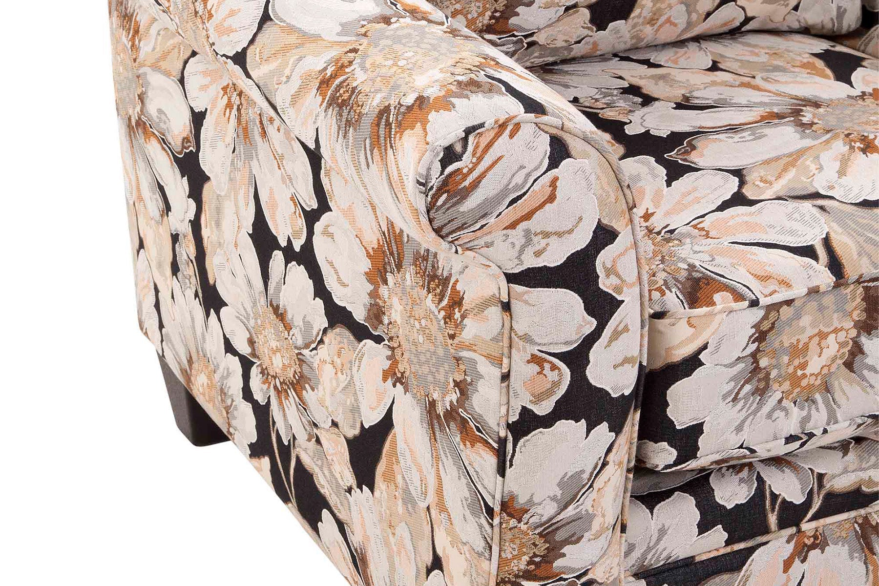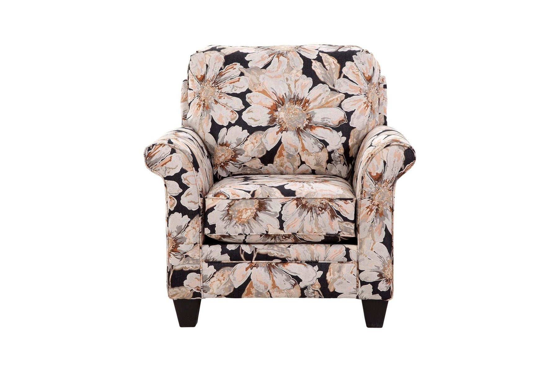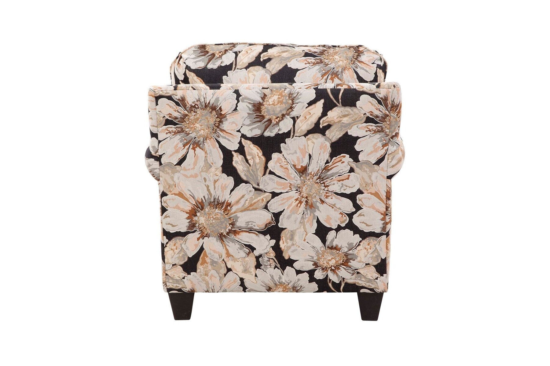 This armchair might be considered an updated traditional roll arm style, but the bold black and white oversized floral pattern fabric take it to a new level. This floral armchair is for those looking to make a statement. An accent chair like this will improve any room. It has reversible seat cushions and reversible back cushions.