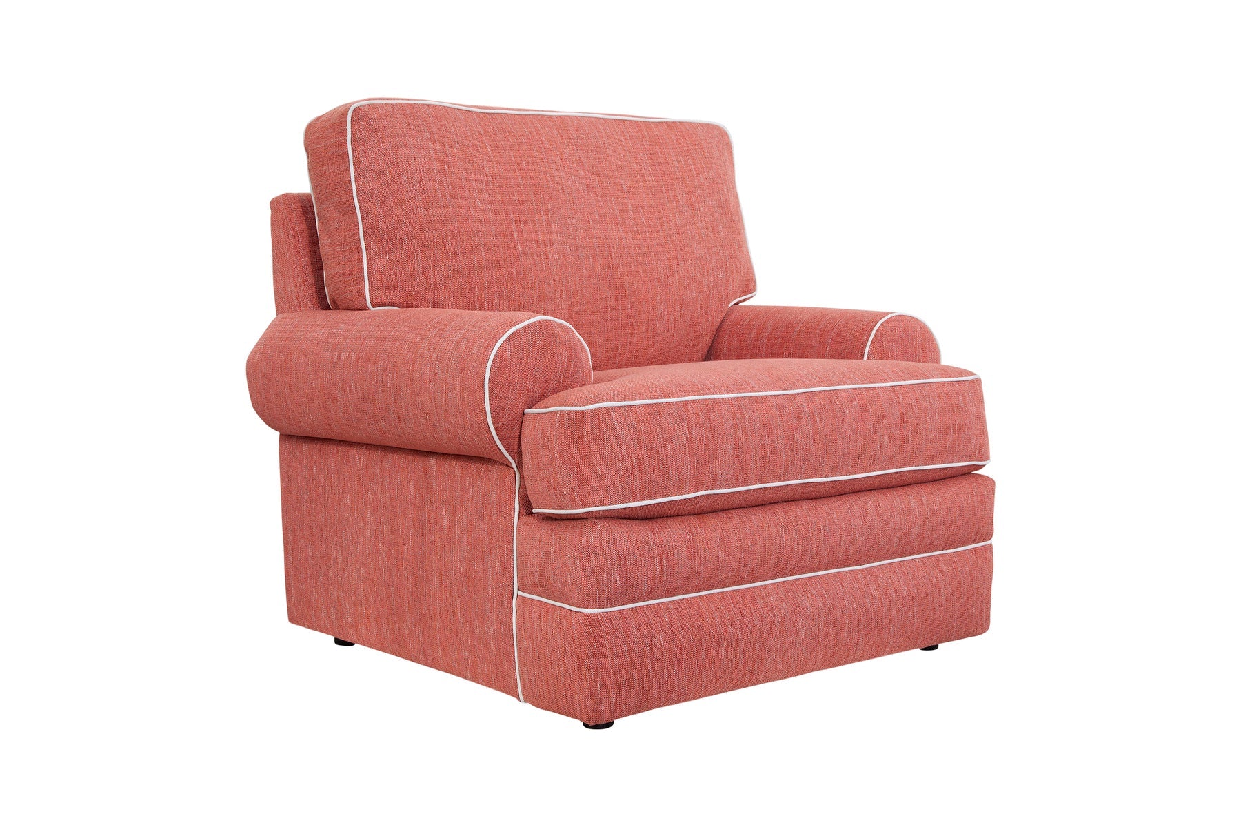 This soft armchair is from our updated traditional collection. A beautiful coral color with ivory contrast welt in a coastal theme. A classic large round armchair with reversible seat and back cushions for long-term wear and tear. The fabric has the look of a woven natural linen using a durable poly blend. Sure to add a touch of elegance to your room. Perfectly tailored with attention to detail.