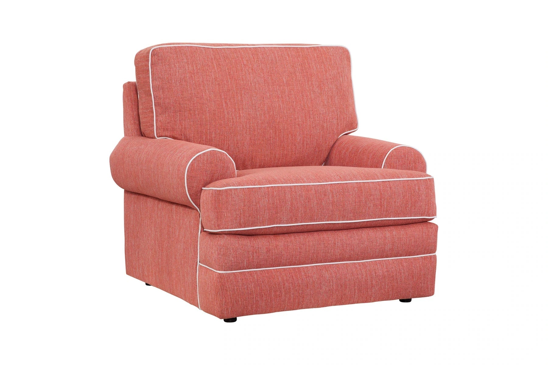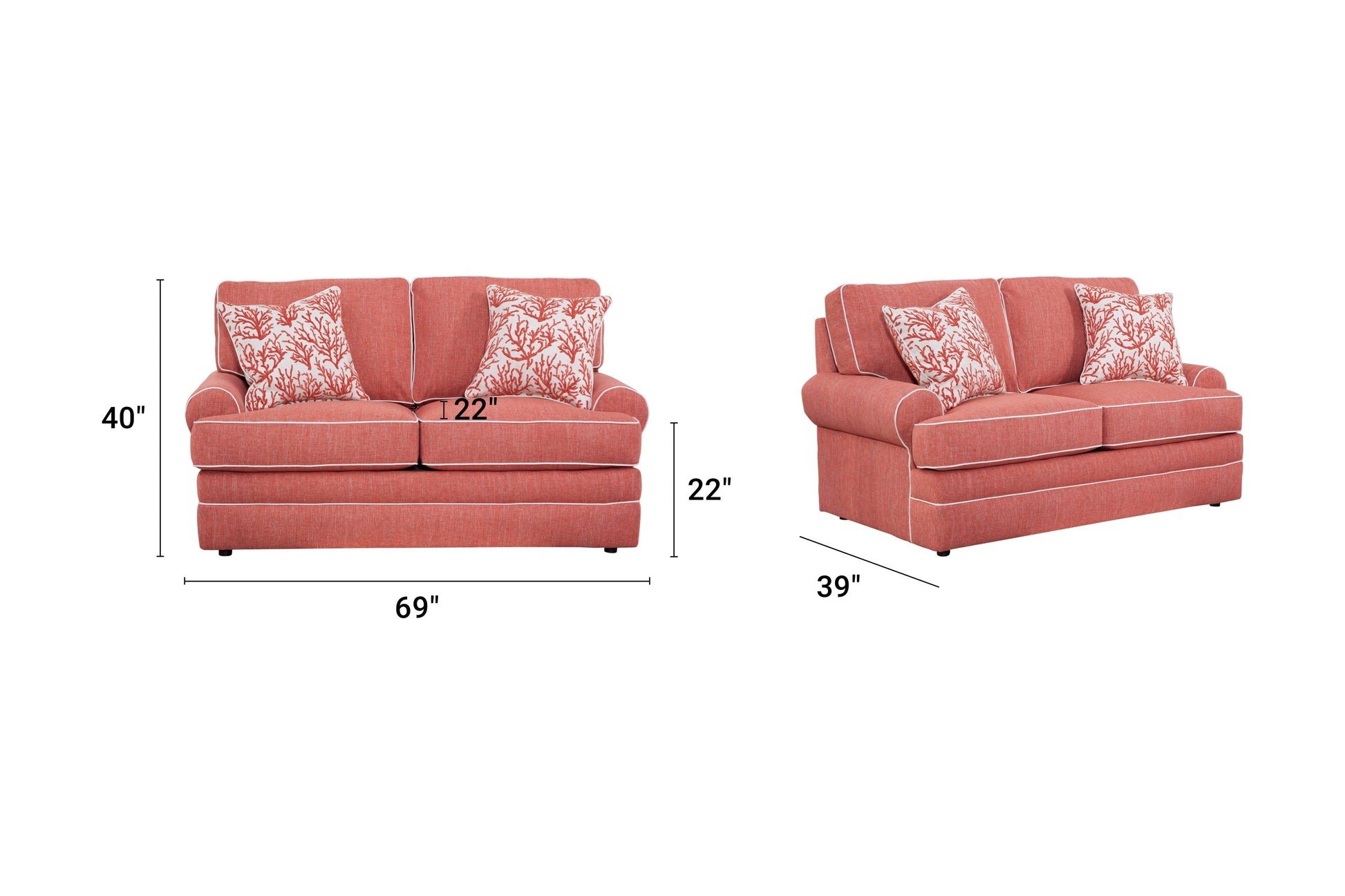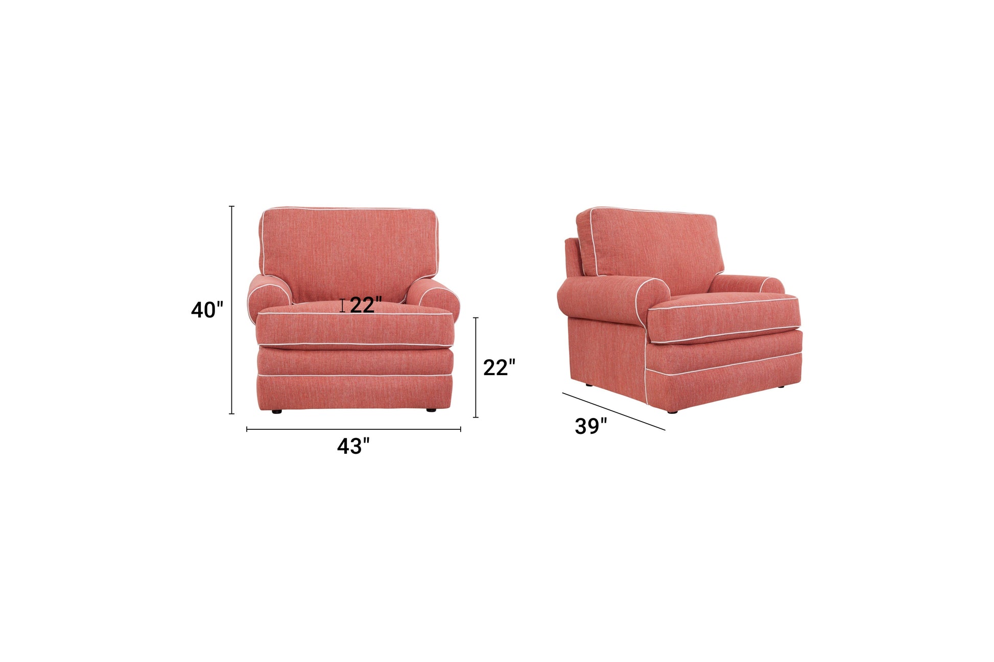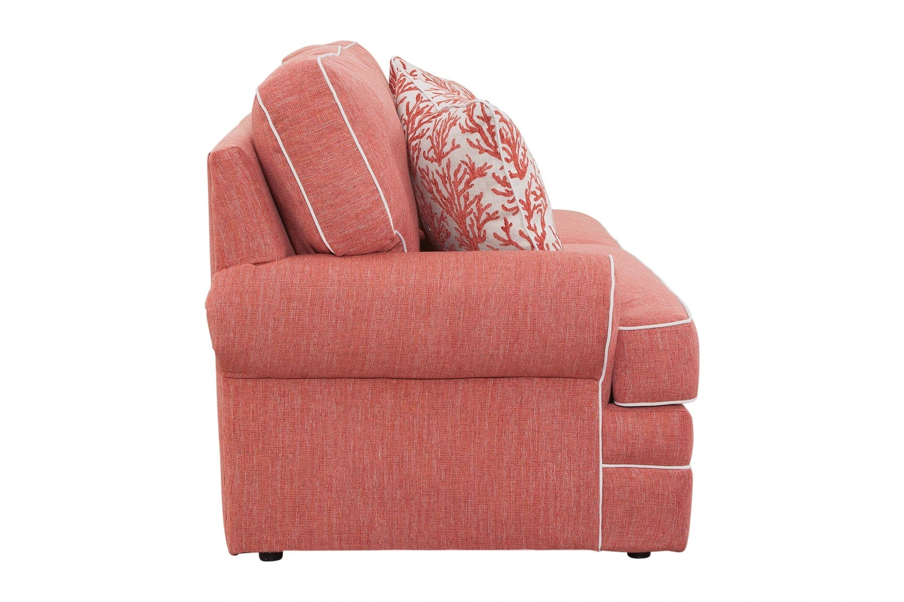 This furniture set has a beautiful coral color with ivory contrast welt in a coastal theme that is sure to impress. The set includes a sofa, loveseat and soft armchair. All items have reversible two over two seat and back cushions for long-term wear and tear. The fabric has the look of a woven natural linen using a durable poly blend. This set will upgrade any room and bring a level of elegance to your home. The set is perfectly tailored and can set up to six people.