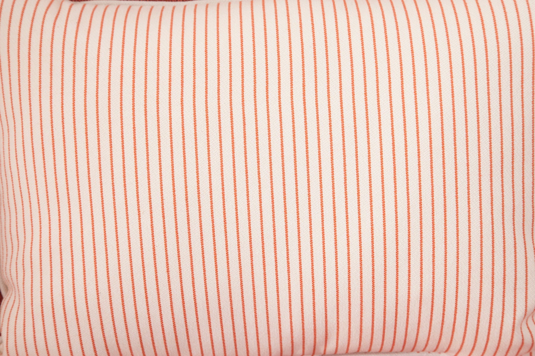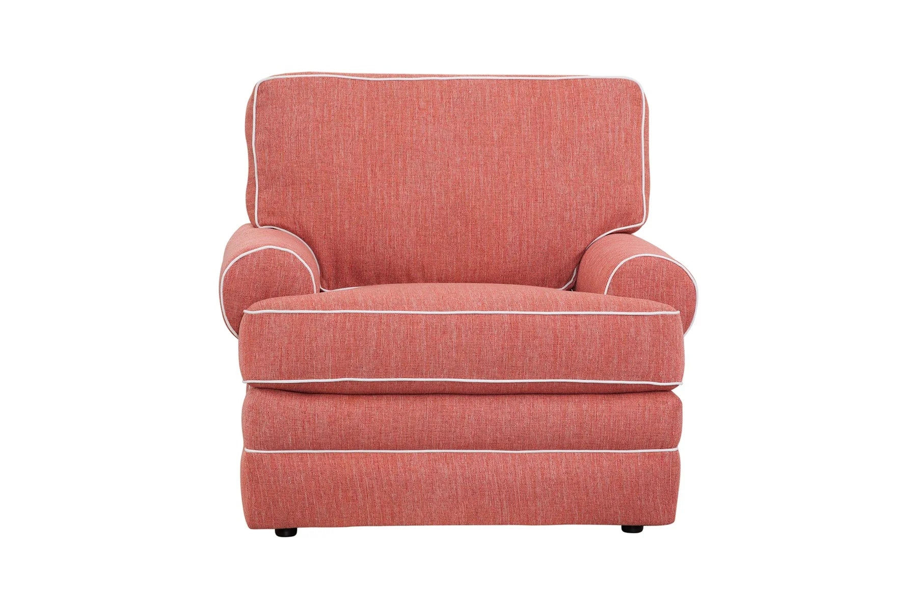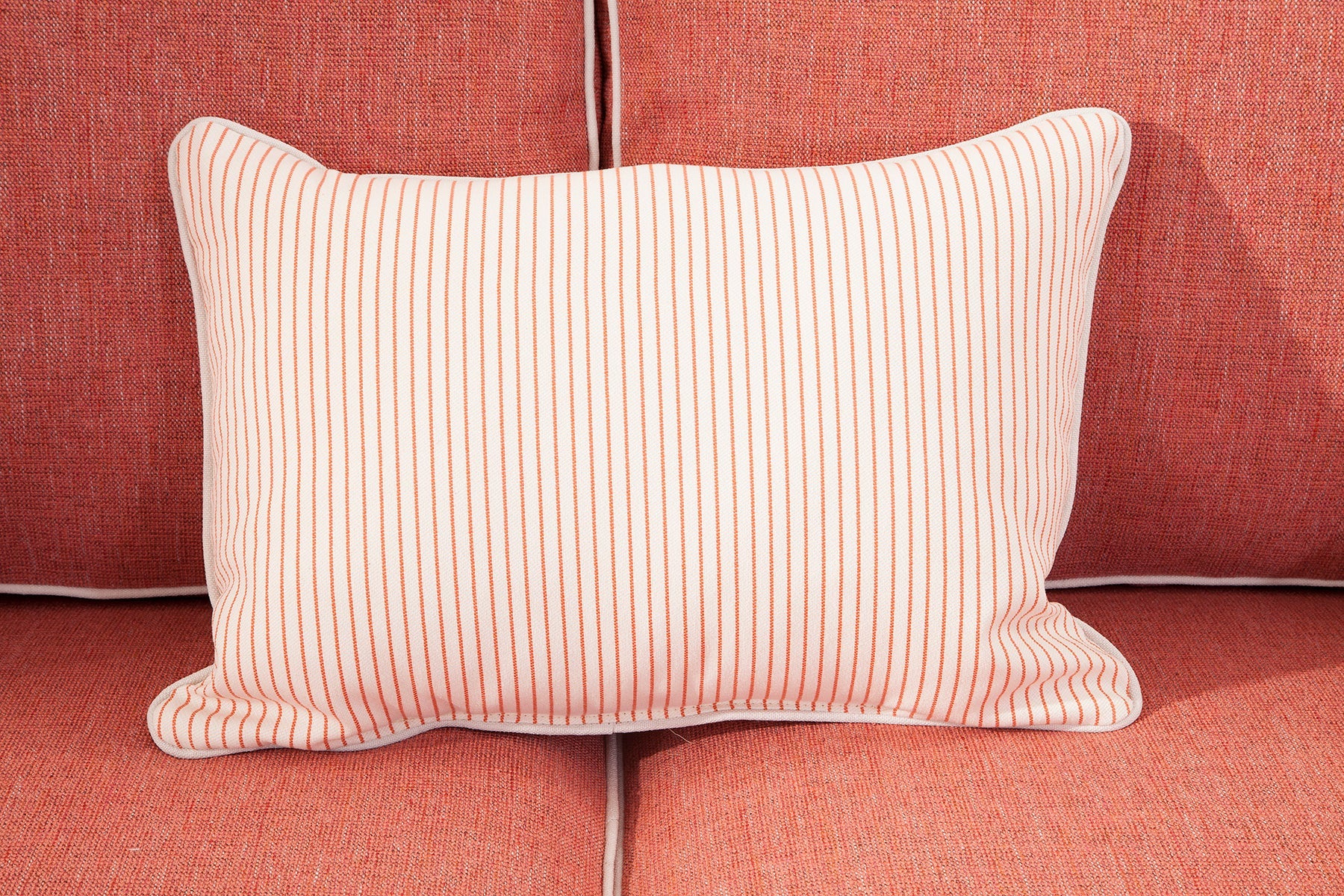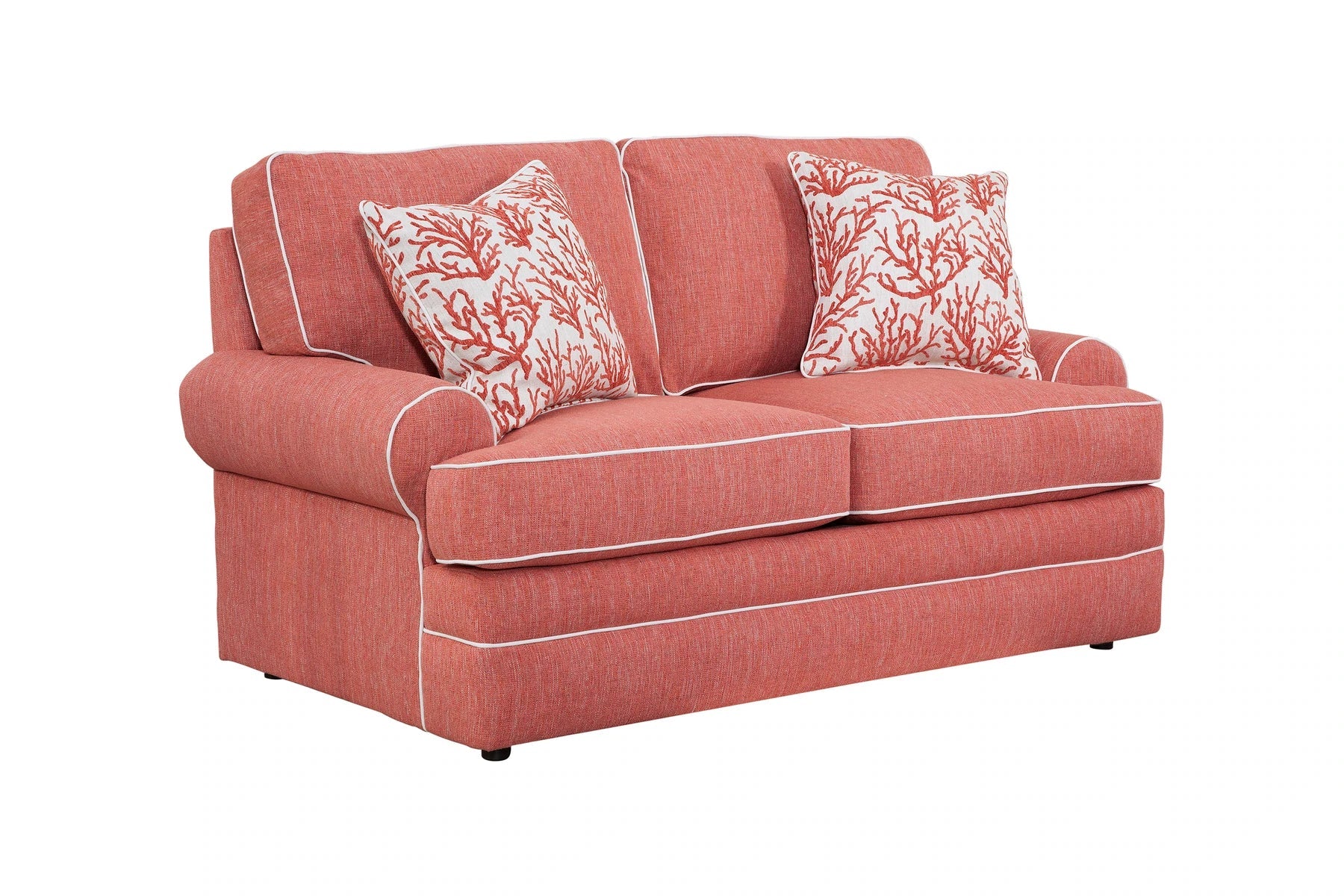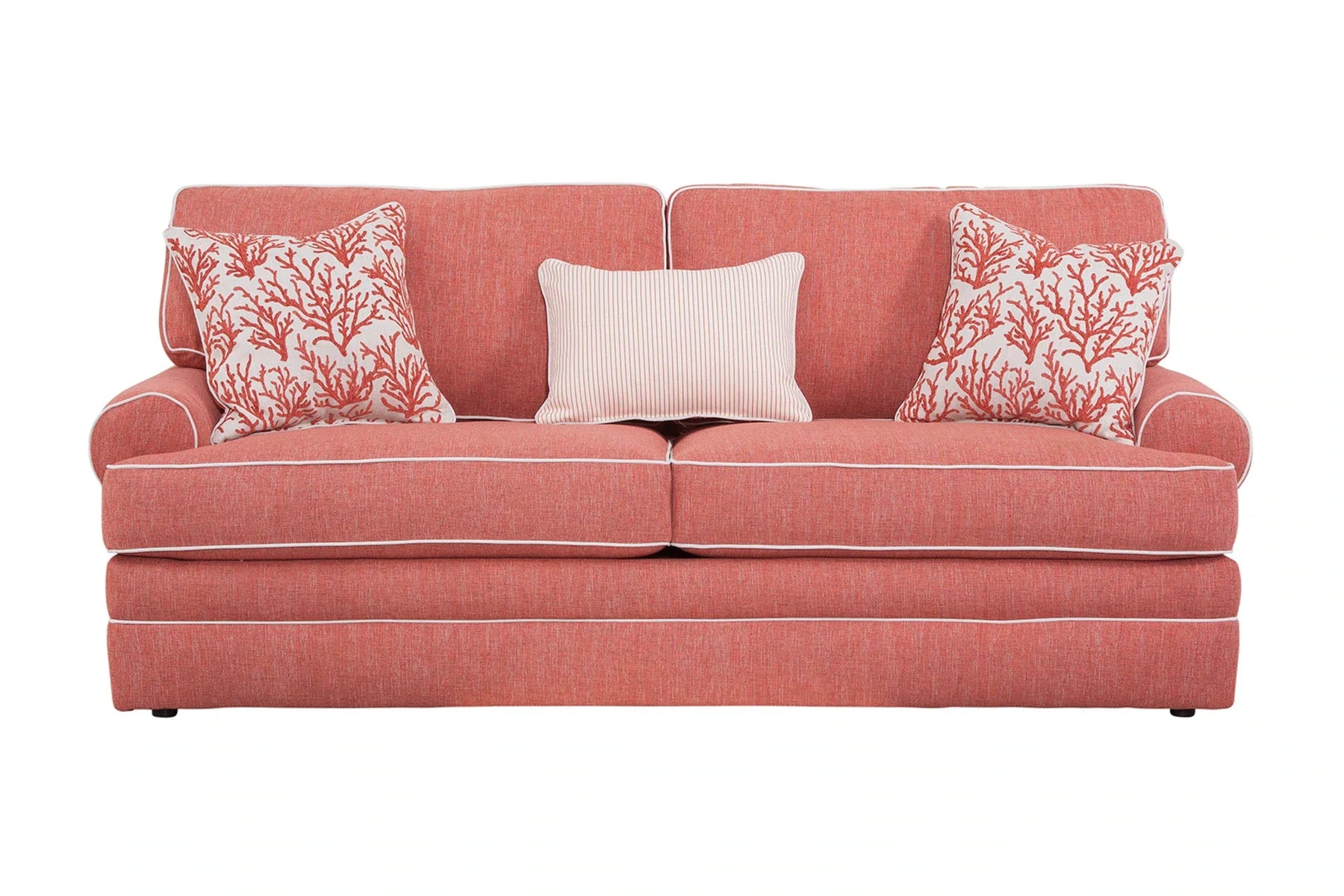 This furniture set has a beautiful coral color with ivory contrast welt in a coastal theme that is sure to impress. The set includes a sofa, loveseat and soft armchair. All items have reversible two over two seat and back cushions for long-term wear and tear. The fabric has the look of a woven natural linen using a durable poly blend. This set will upgrade any room and bring a level of elegance to your home. The set is perfectly tailored and can set up to six people.