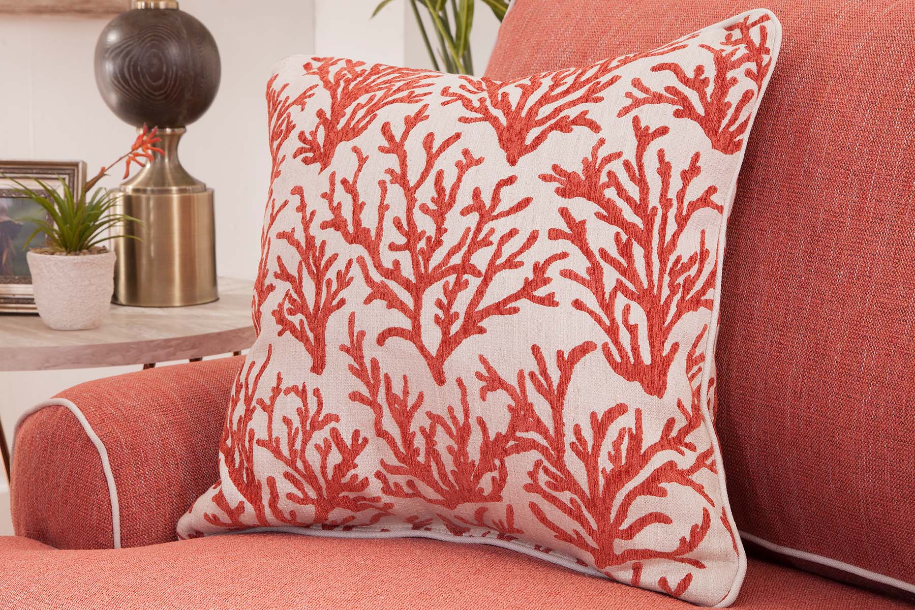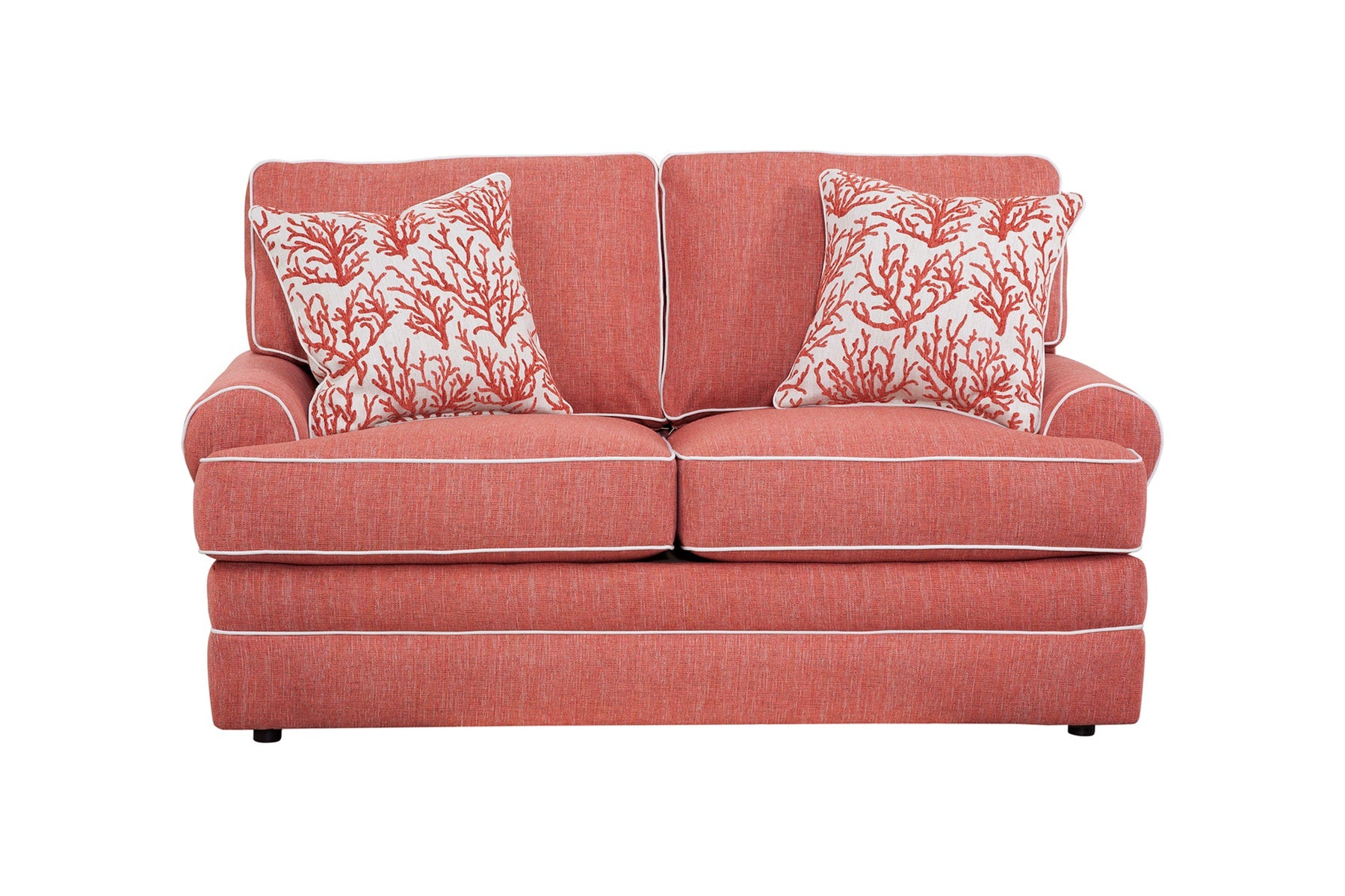 This loveseat is from our updated traditional collection. A beautiful coral color with ivory contrast welt in a coastal theme. A classic round arm sofa with reversible two over two seat and back cushions for long-term wear and tear. The fabric has the look of a woven natural linen using a durable poly blend. Two accent pillows in a coral reef pattern on an ivory background are the perfect compliment. This loveseat is sure to add a touch of elegance to your room. Perfectly tailored with attention to detail with a coastal theme. This medium loveseat seats two people.
