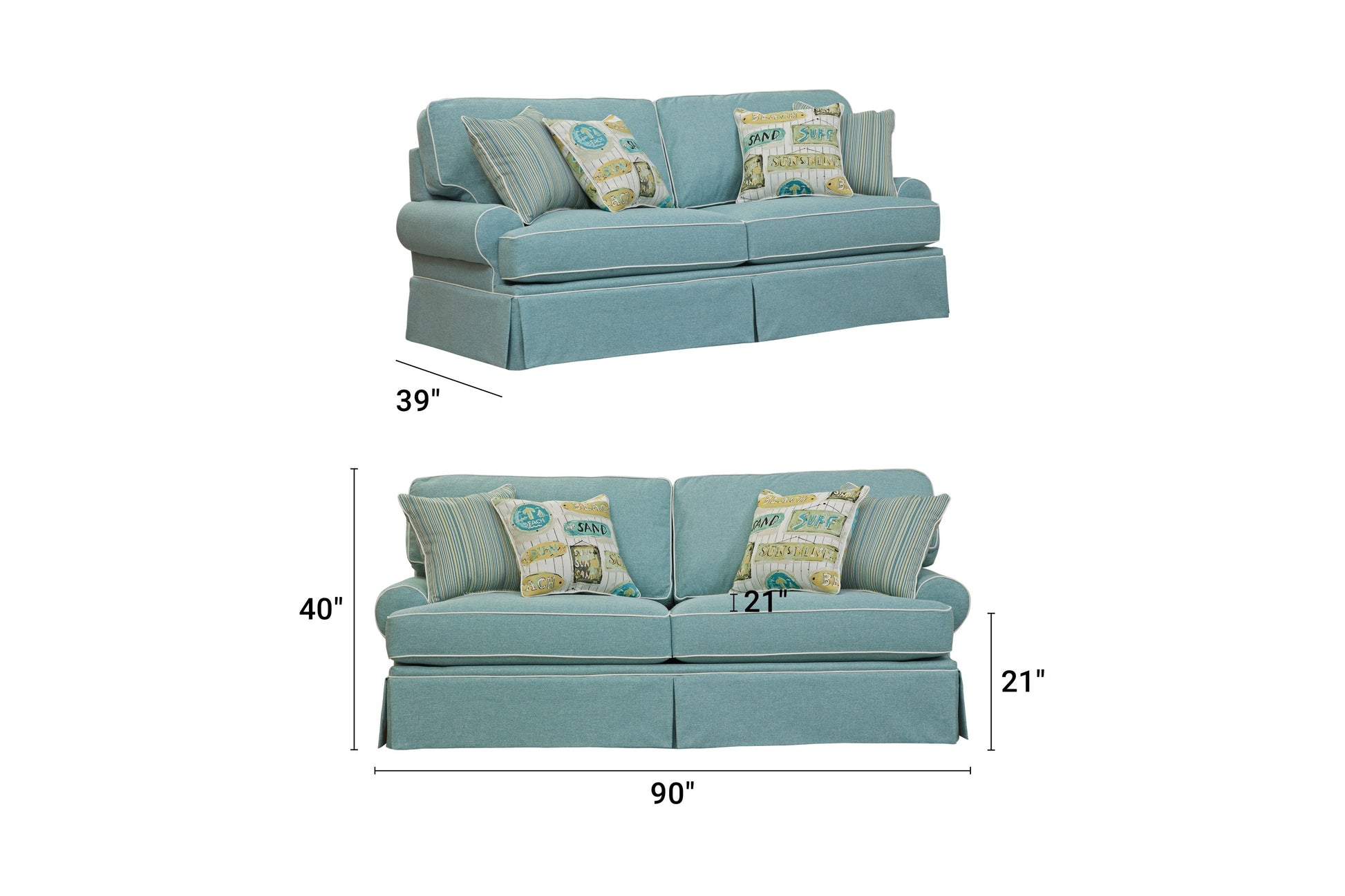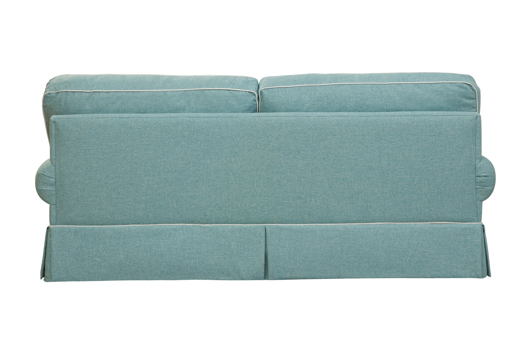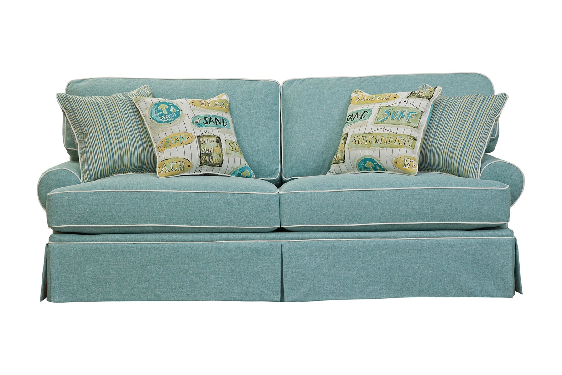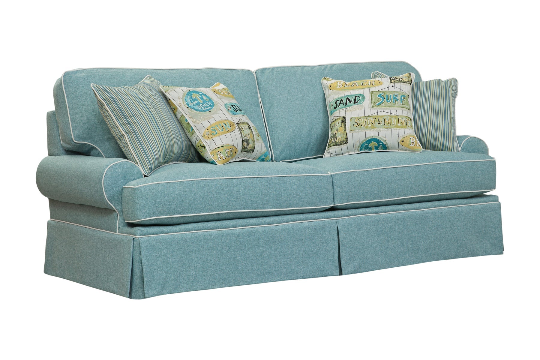 This sofa is from our updated traditional collection. A beautiful aqua color with ivory contrast welt in a coastal theme. Classic round arm sofa with reversible two over two seat and back cushions for wear and tear. This group has a tailored skirt. The fabric has the look of a woven natural linen using a durable poly blend. Accent pillows in a beach pattern on an ivory background are the perfect compliment. Sure to add a touch of elegance to your room. Perfectly tailored with an attention to detail. This large sofa seats three people.