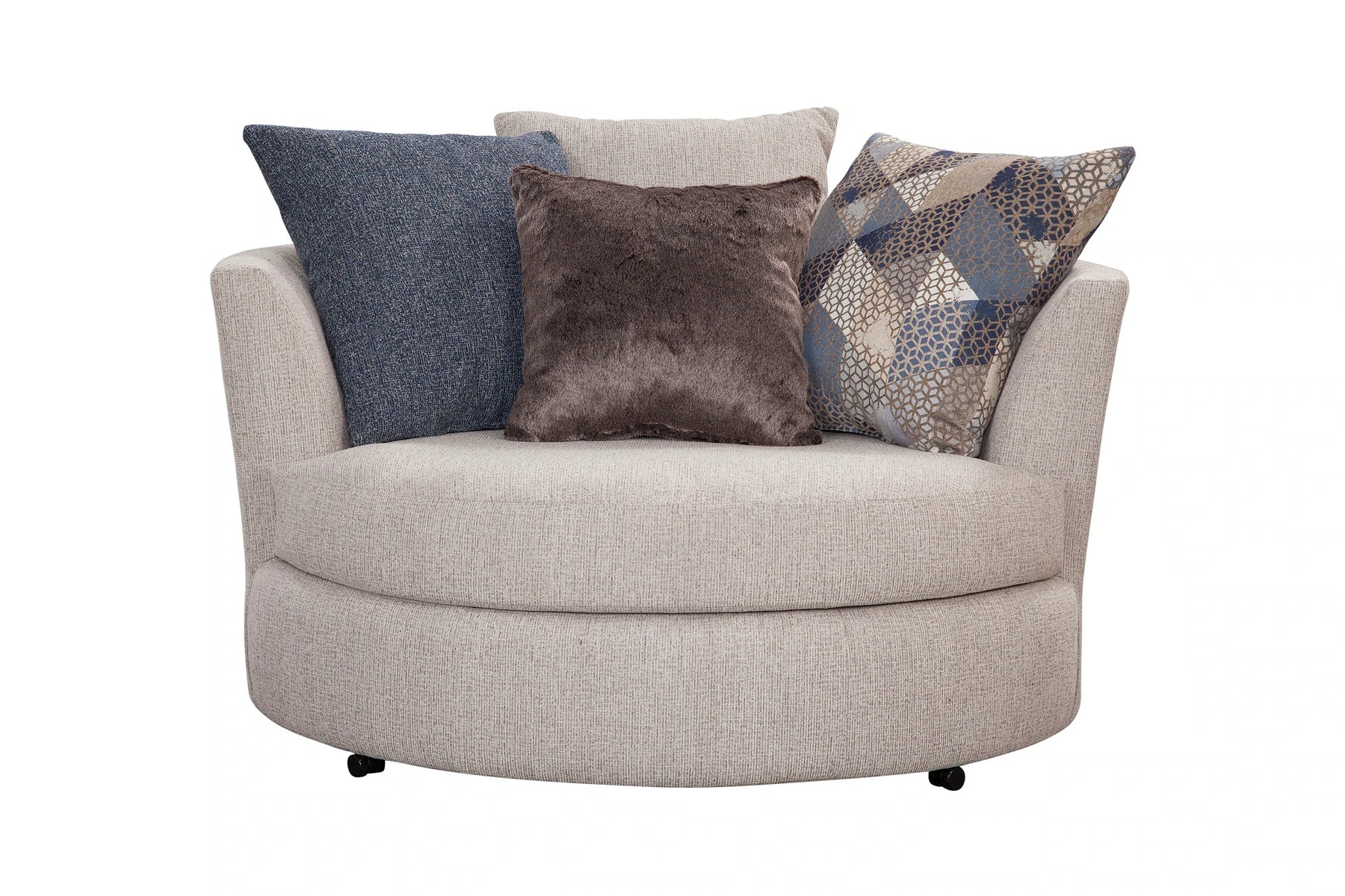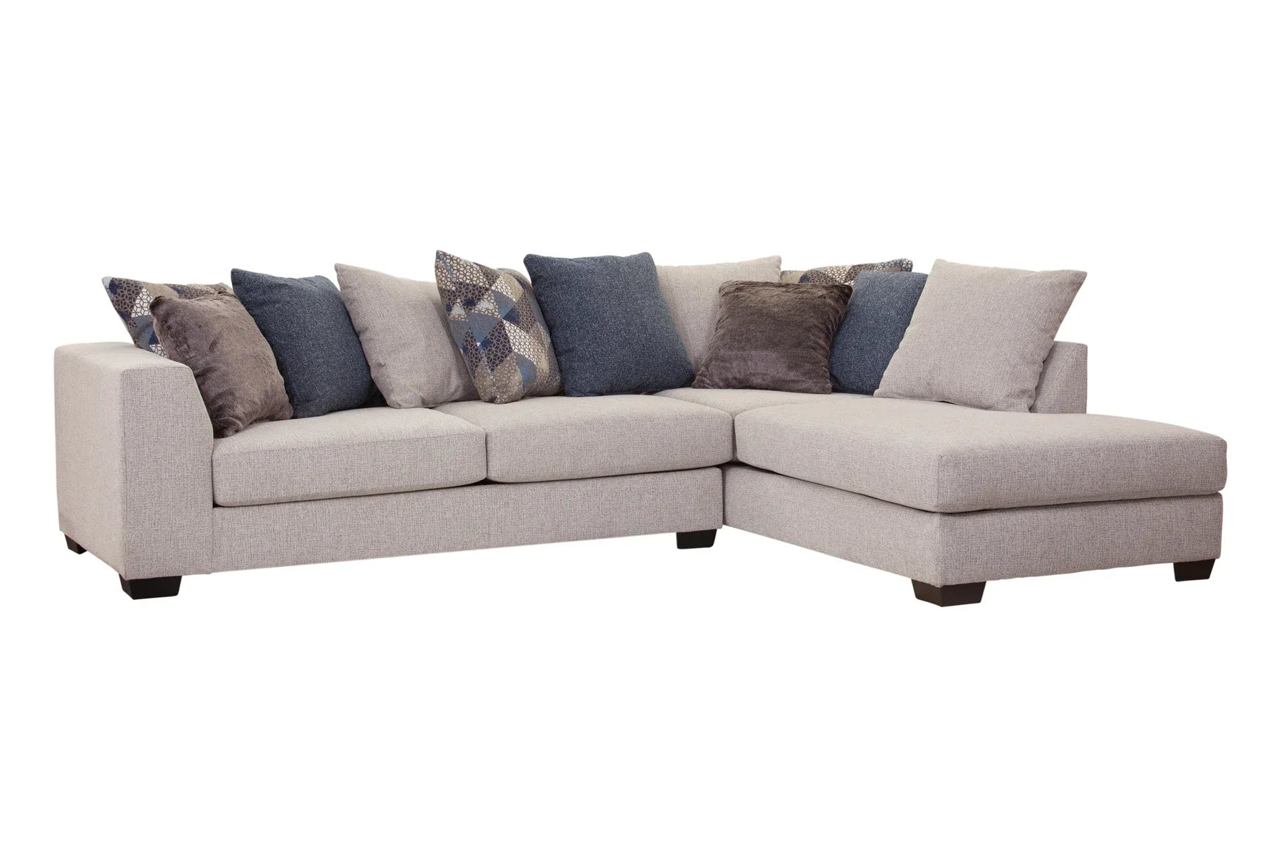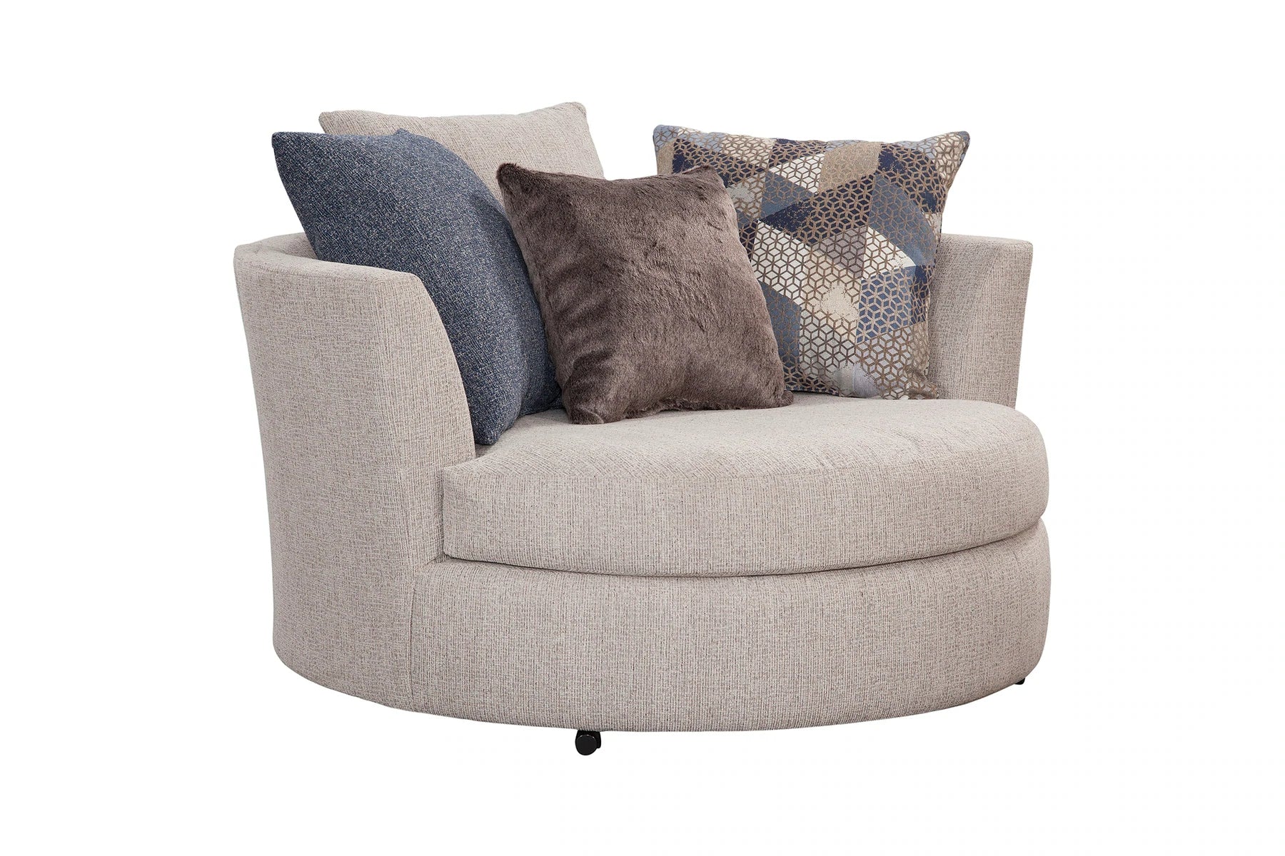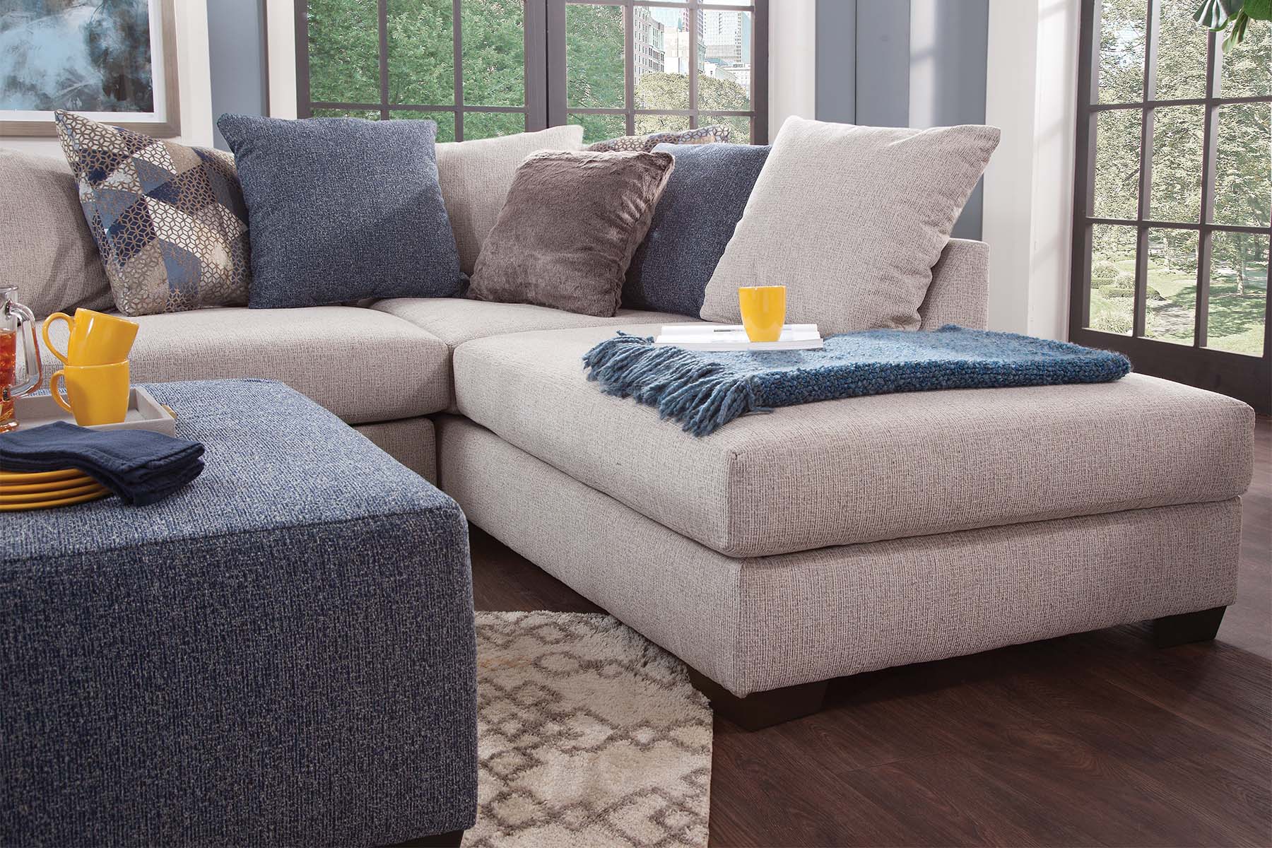 This sectional and chair set is a perfect neutral addition to your living room. The ivory couch and chair both feature ribbed chenille base fabric with various shades of blue and ivory pillows. The sectional with chaise lounge is casual and comfortable. It's a large piece with seating for up to five people. The back pillows are loose so you can arrange them however you'd like. Touches of metallic and fur give sparkle and texture to the accent pillows. This sectional has a large footprint and seats up to five people. The large barrel chair has three loose cushions and a soft accent pillow. It has a deep seat and is incredibly comfortable - you can even curl up in it!