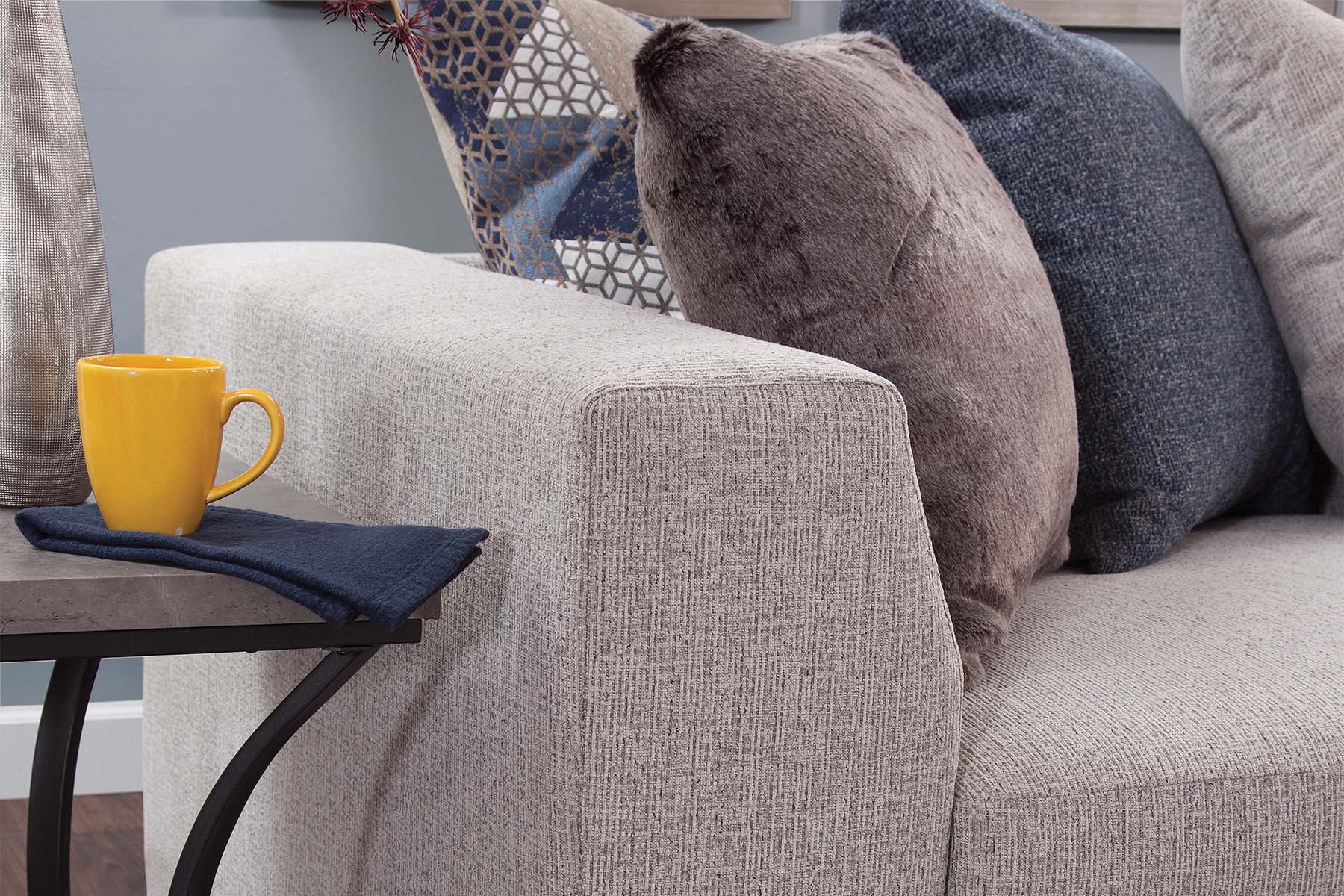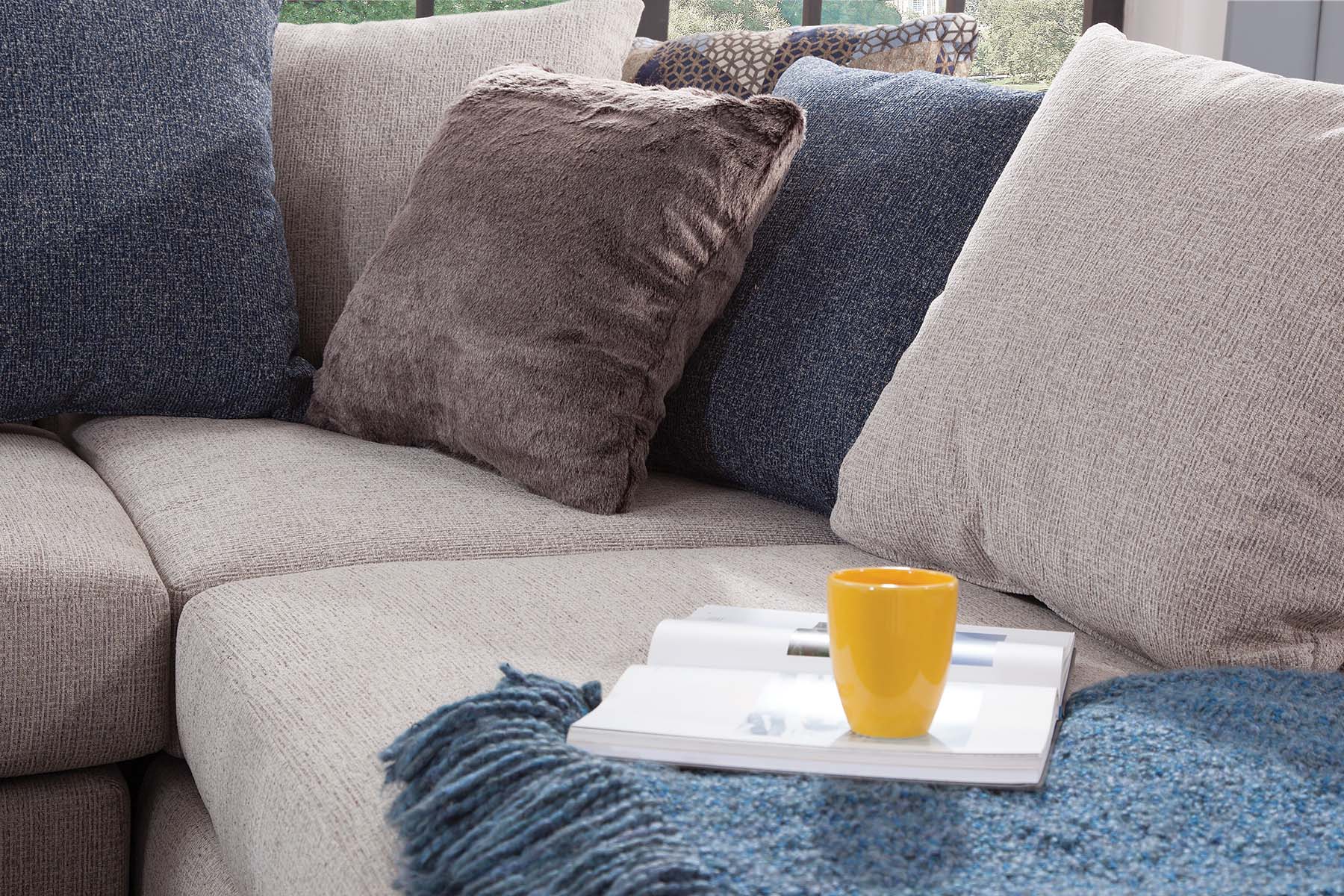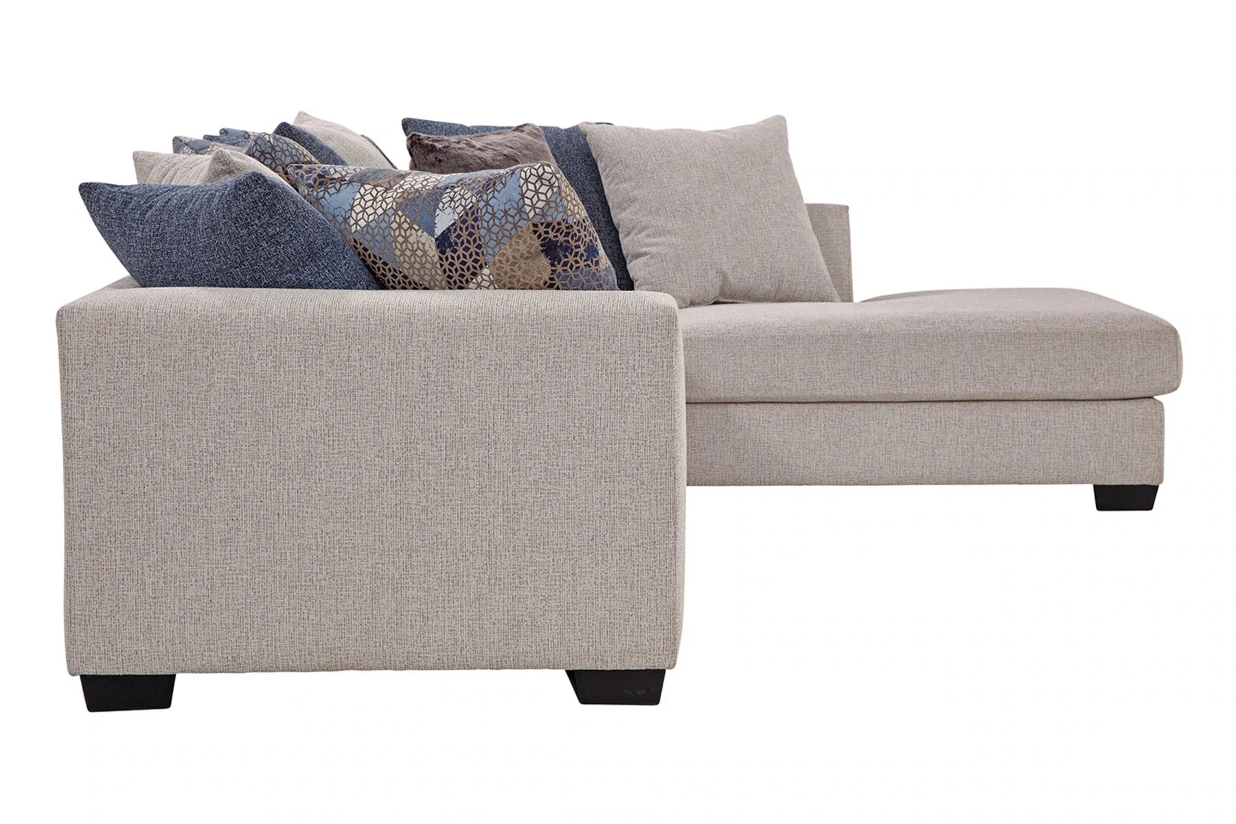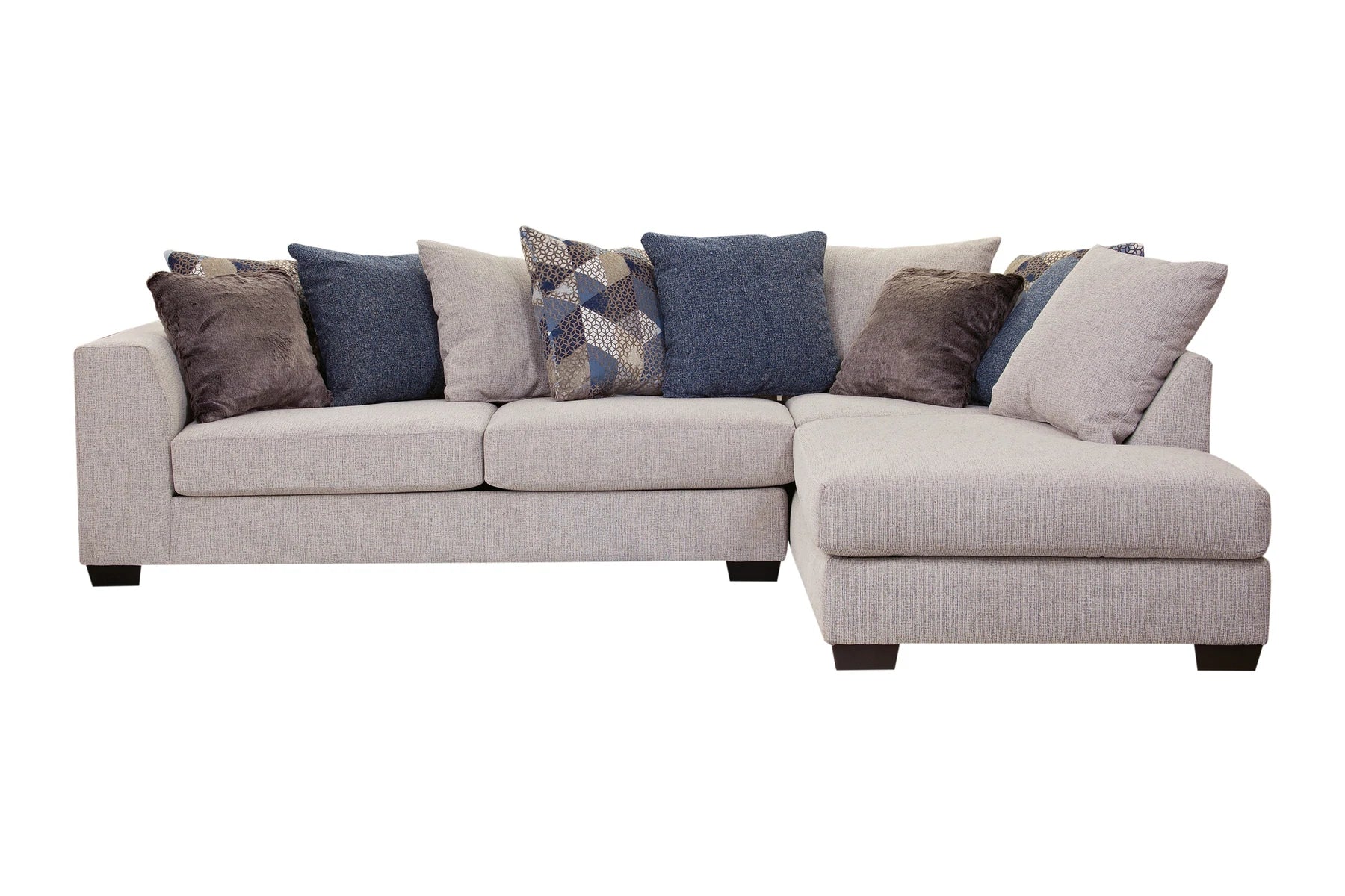 This sectional and chair set is a perfect neutral addition to your living room. The ivory couch and chair both feature ribbed chenille base fabric with various shades of blue and ivory pillows. The sectional with chaise lounge is casual and comfortable. It's a large piece with seating for up to five people. The back pillows are loose so you can arrange them however you'd like. Touches of metallic and fur give sparkle and texture to the accent pillows. This sectional has a large footprint and seats up to five people. The large barrel chair has three loose cushions and a soft accent pillow. It has a deep seat and is incredibly comfortable - you can even curl up in it!