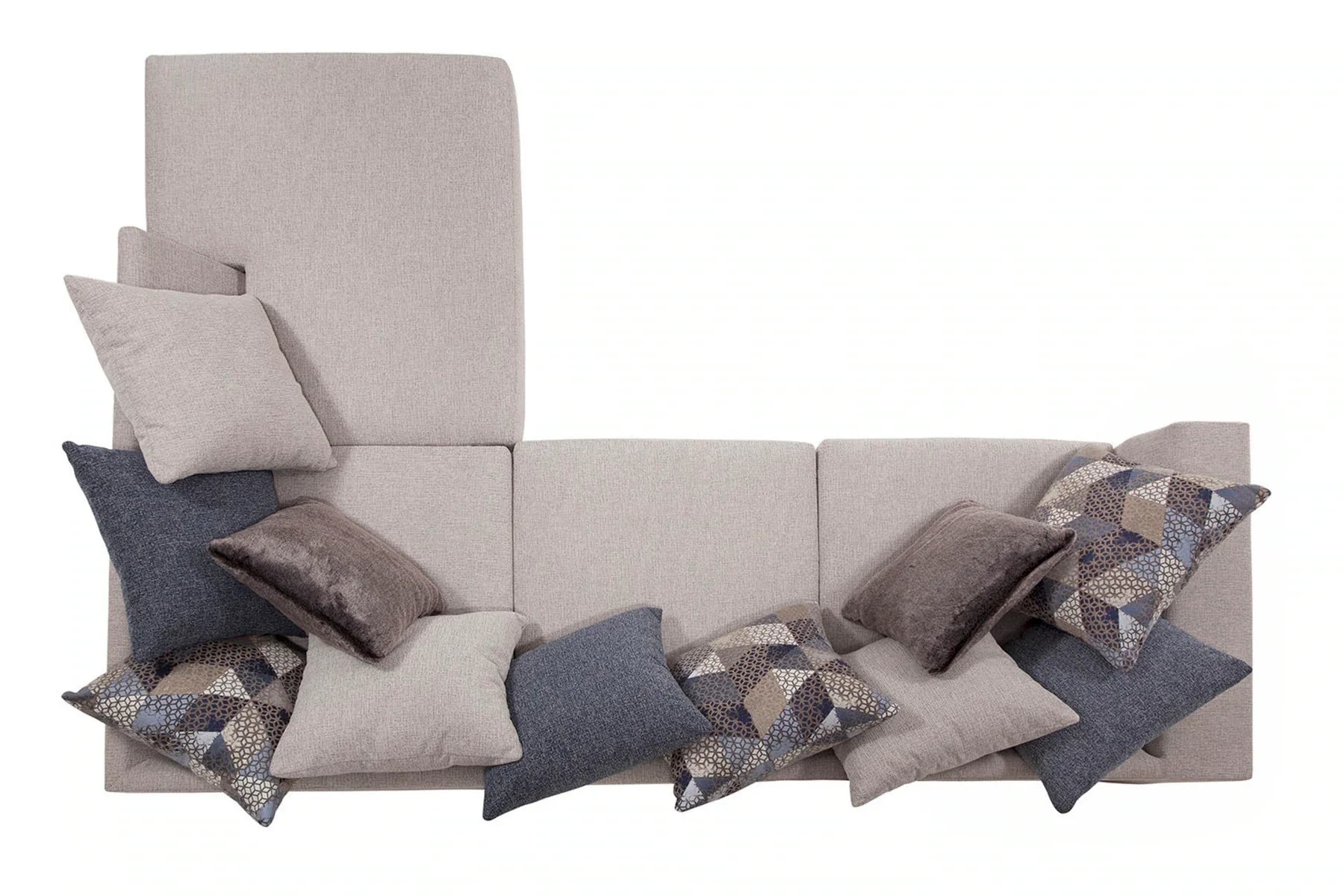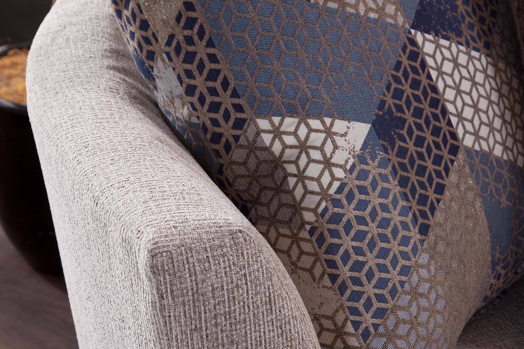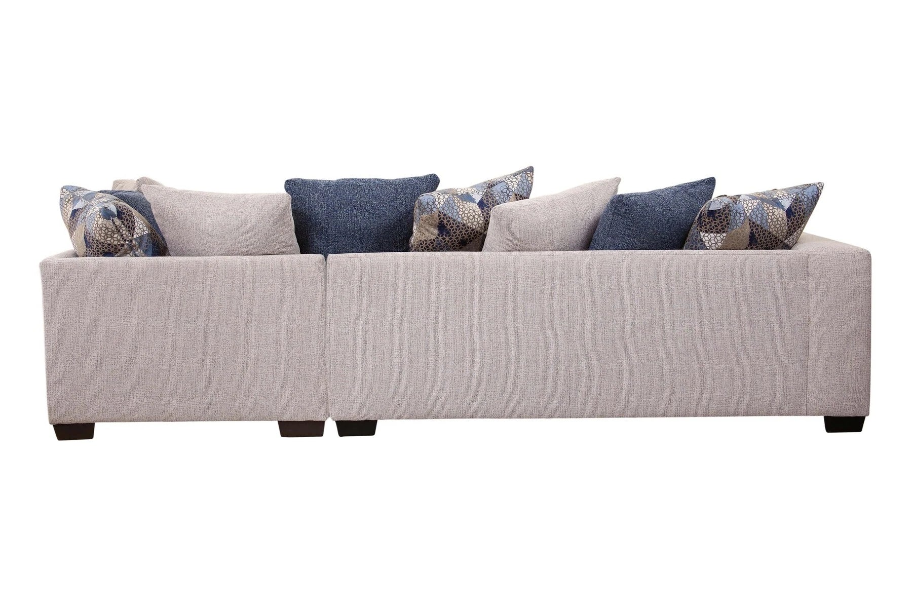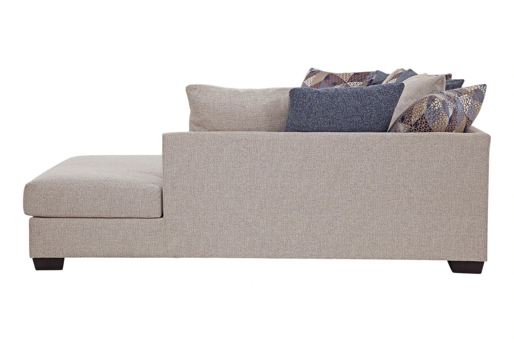 This sectional and chair set is a perfect neutral addition to your living room. The ivory couch and chair both feature ribbed chenille base fabric with various shades of blue and ivory pillows. The sectional with chaise lounge is casual and comfortable. It's a large piece with seating for up to five people. The back pillows are loose so you can arrange them however you'd like. Touches of metallic and fur give sparkle and texture to the accent pillows. This sectional has a large footprint and seats up to five people. The large barrel chair has three loose cushions and a soft accent pillow. It has a deep seat and is incredibly comfortable - you can even curl up in it!