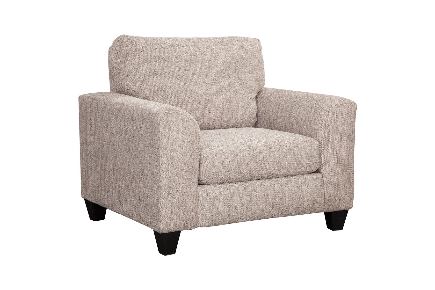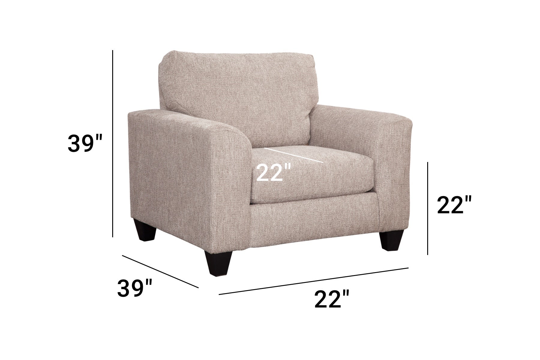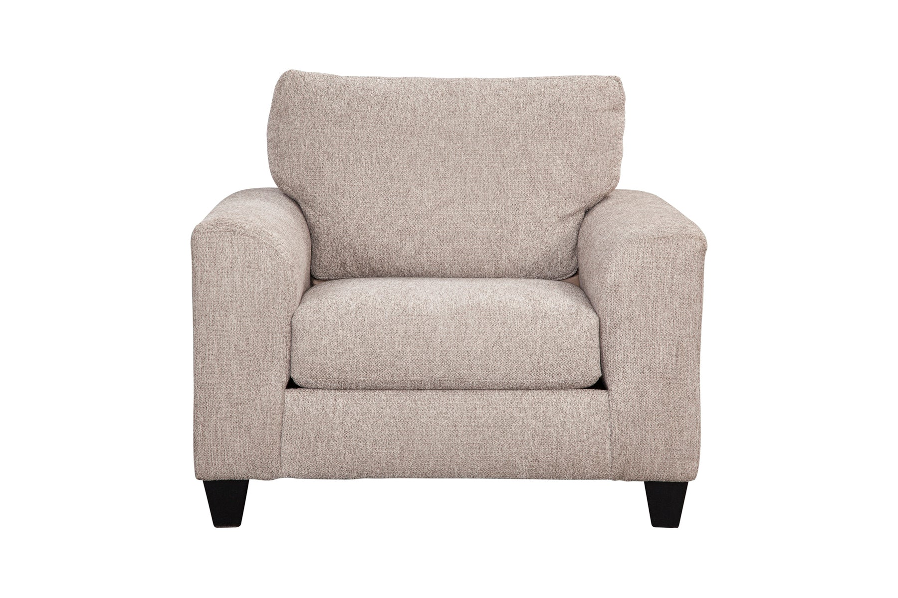 This chair is comfortable and stylish. The fabric is a soft chenille in shades of brown and ivory. Modern profile with flare arms.