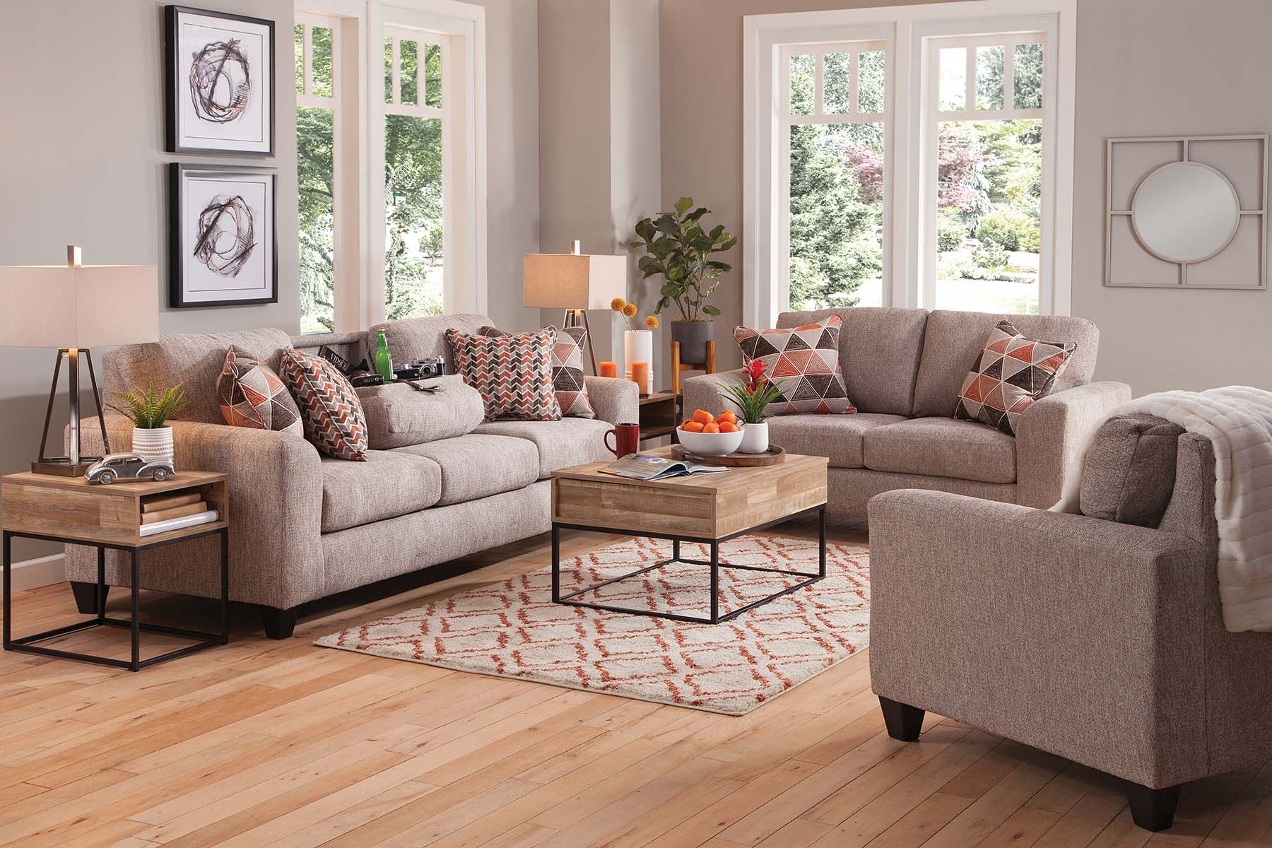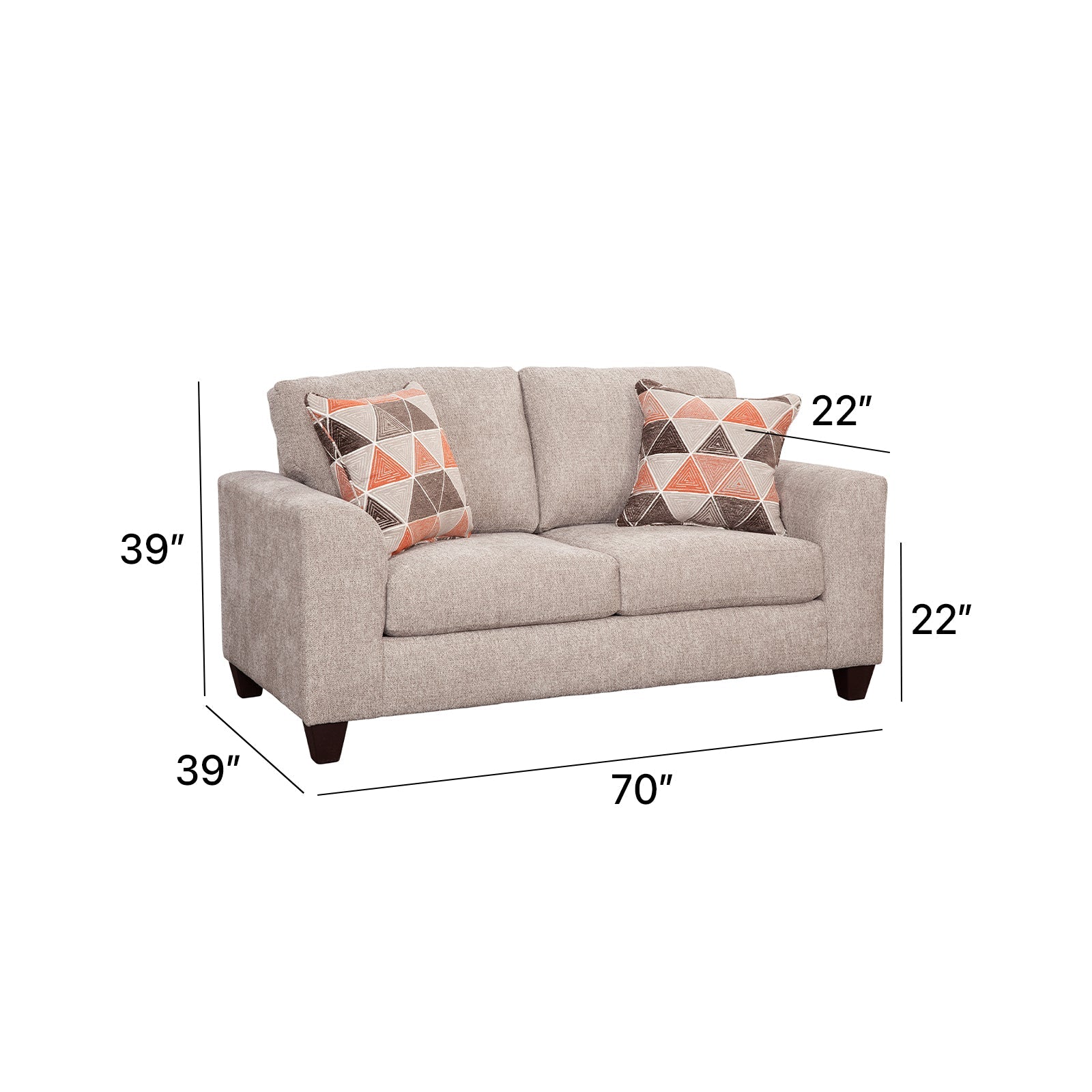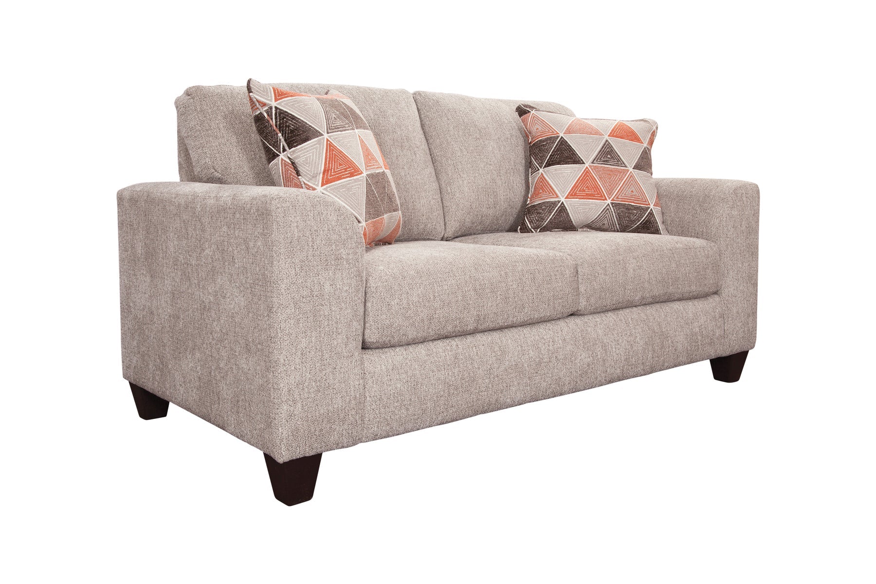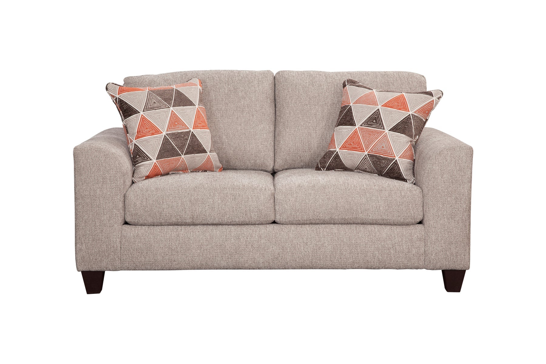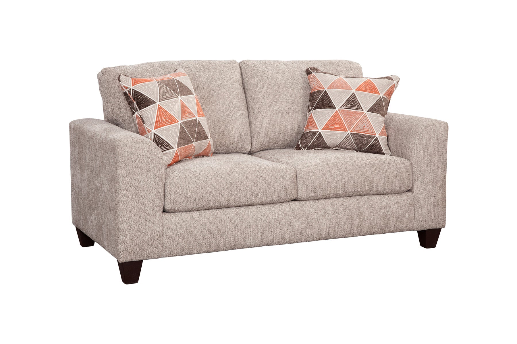This loveseat is both comfortable and stylish. Modern profile with flare arms. The all over fabric is a soft chenille in shades of brown and ivory. The accent pillows are geometric designs that have an ivory background with brown and orange patterns. The seat cushions are reversible for added wear and tear. Seats two people comfortably.