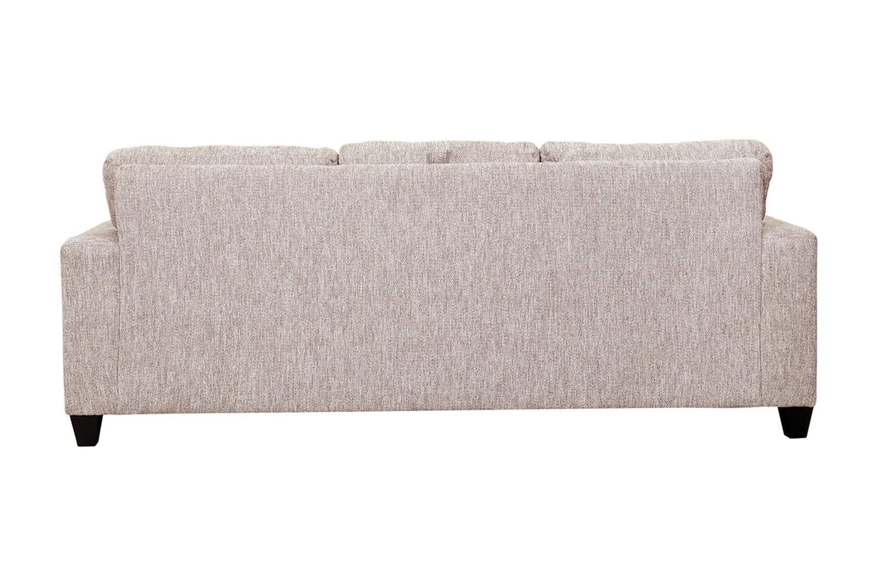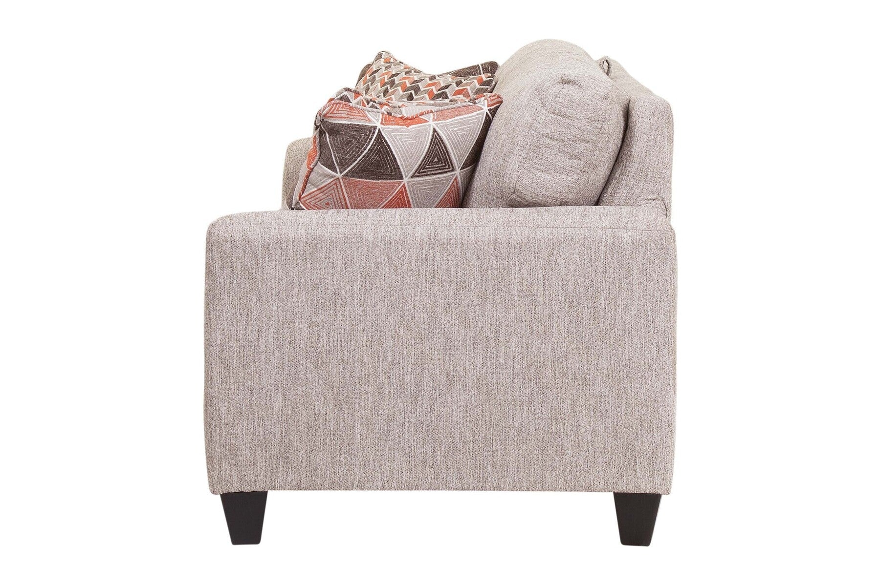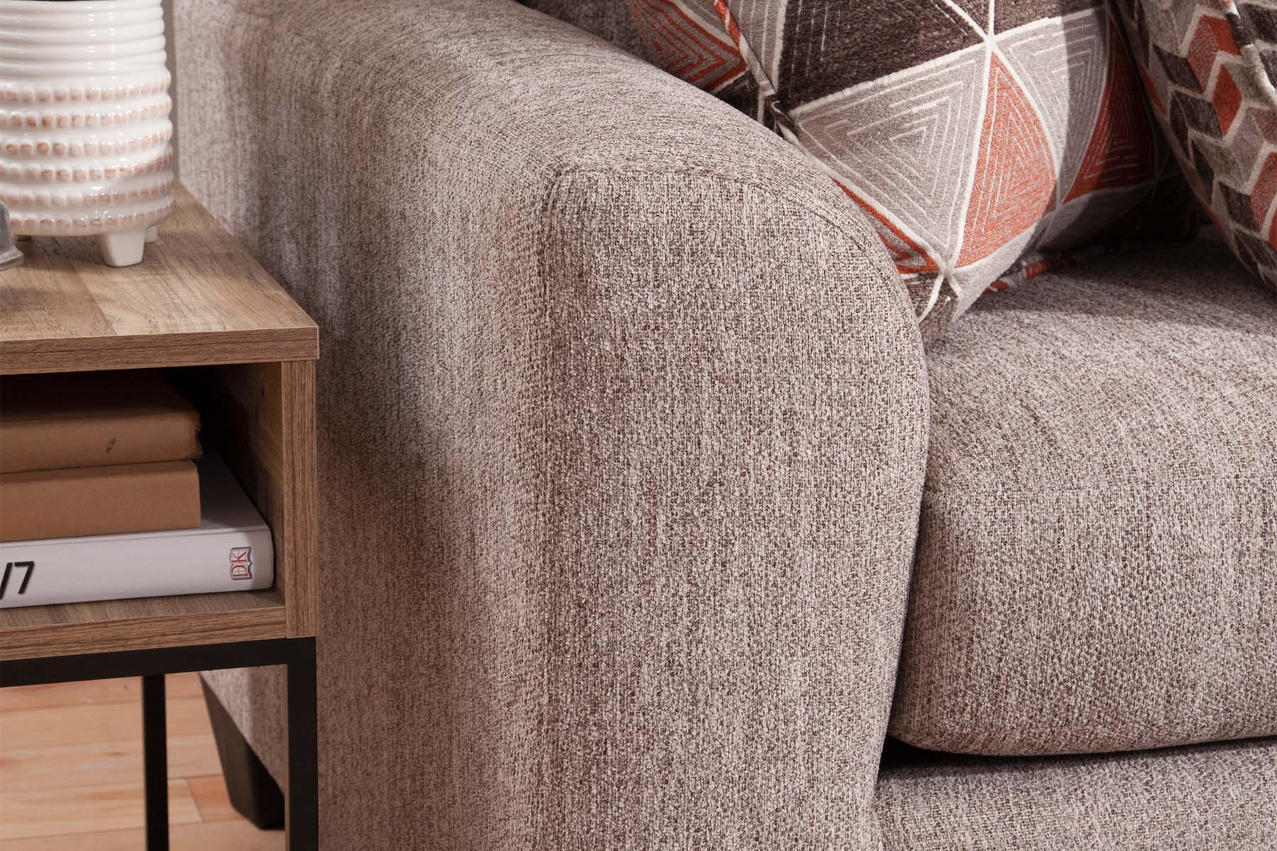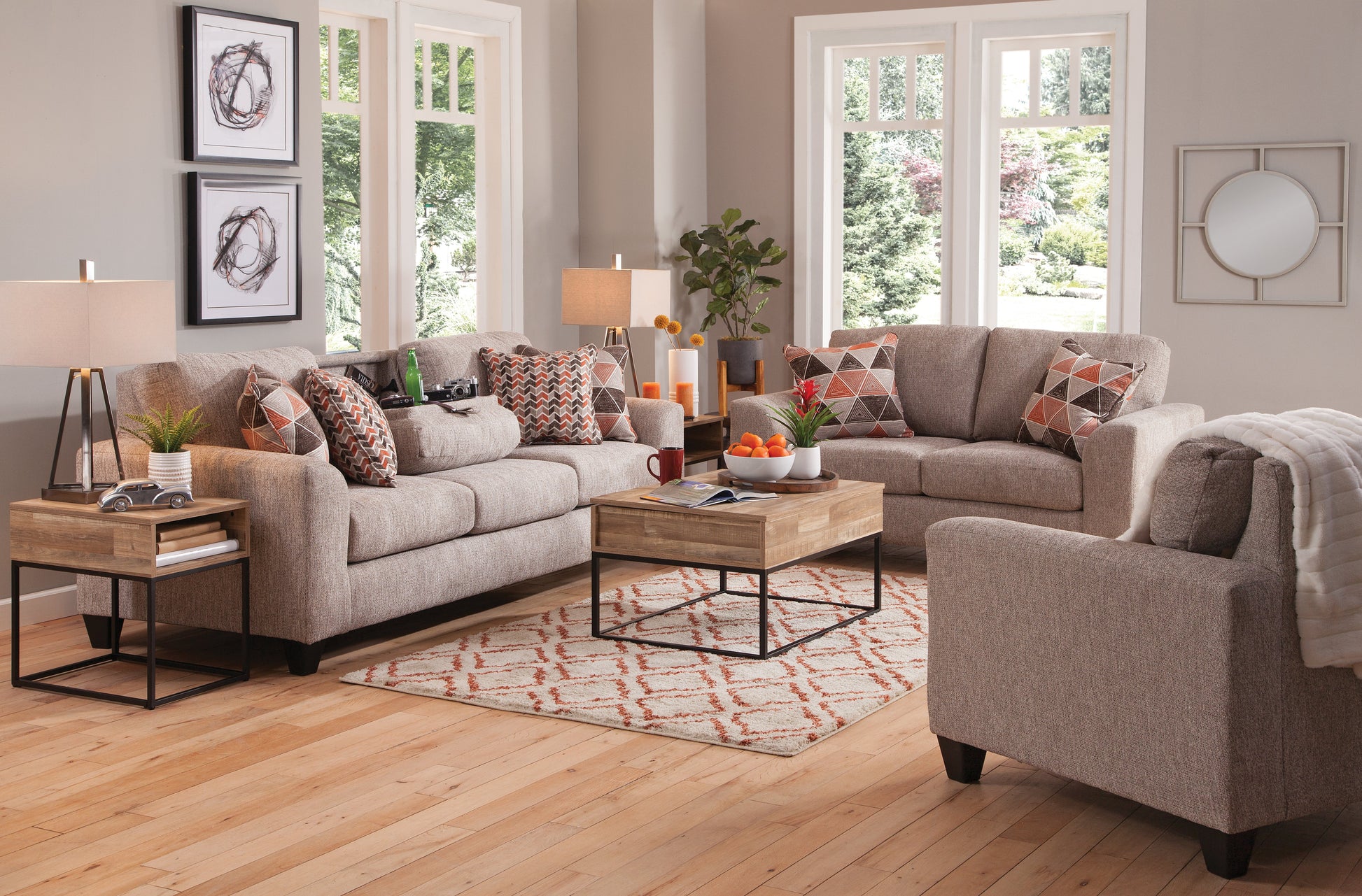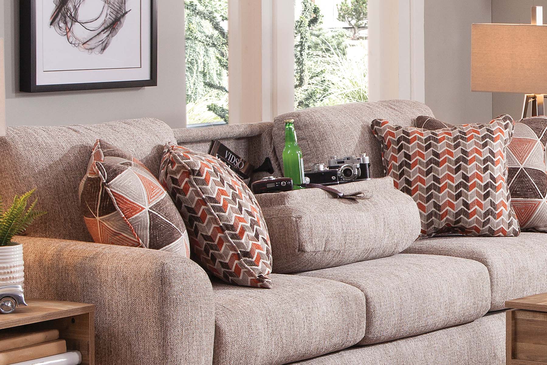 This is more than just a sofa. It is a sofa with a drop down console that includes cup holders and storage. All of that included in a modern three over three seat and back cushion profile. The console can be closed to look like a typical sofa. The all over fabric is a soft chenille in shades of brown and ivory. The accent pillows are geometric designs that have an ivory background with brown and orange patterns. The seat cushions are reversible for added wear and tear. Seats three people comfortably.