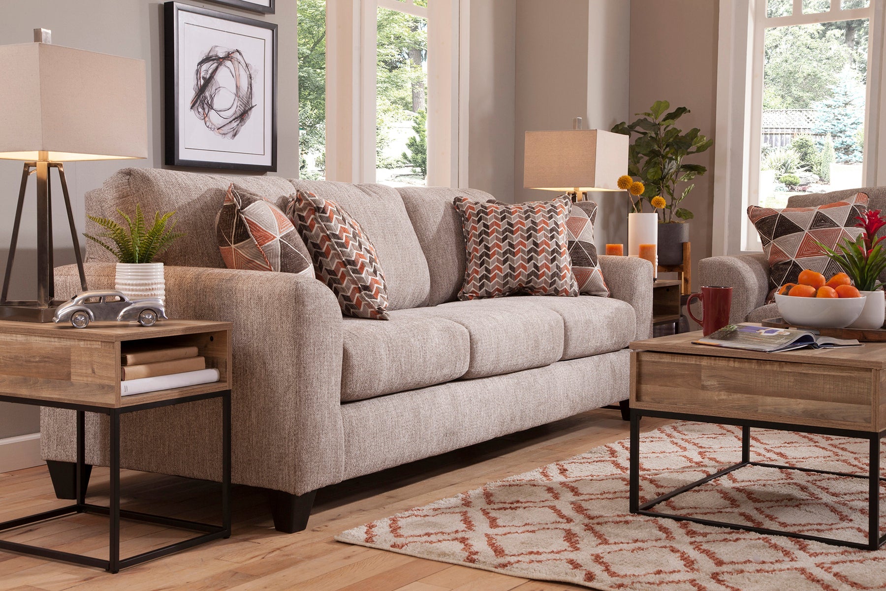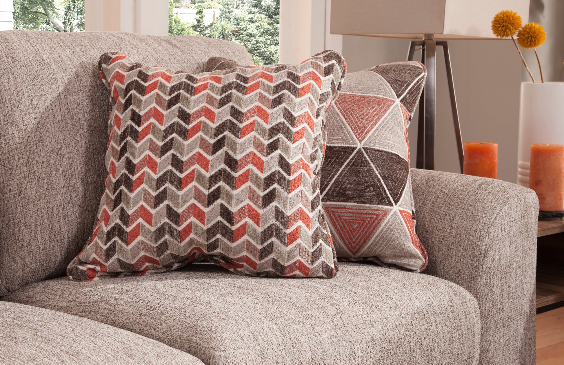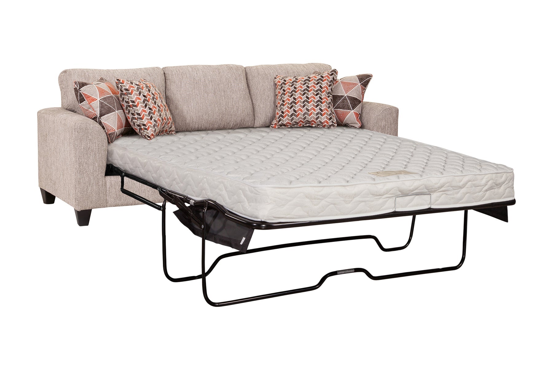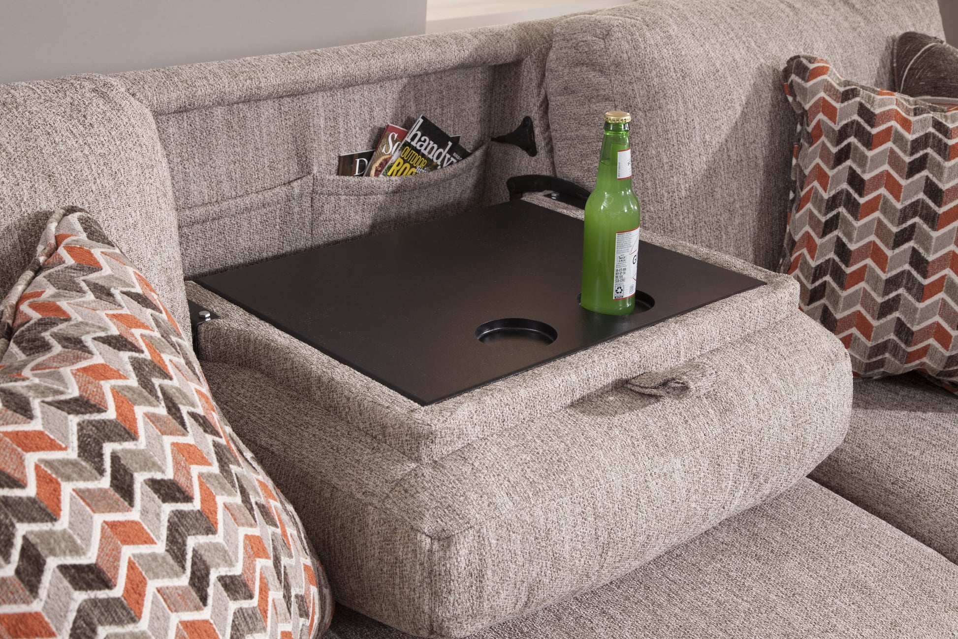 This sofa sleeper has a drop down console that includes cup holders and some storage. All of that included in a modern three over three seat and back cushion profile that is also a pull out sofa. The console can be closed to look like a typical sofa. The all over fabric is a soft chenille in shades of brown and ivory. The accent pillows are geometric designs that have an ivory background with brown and orange patterns. The seat cushions are reversible for added wear and tear. Sit or sleep.