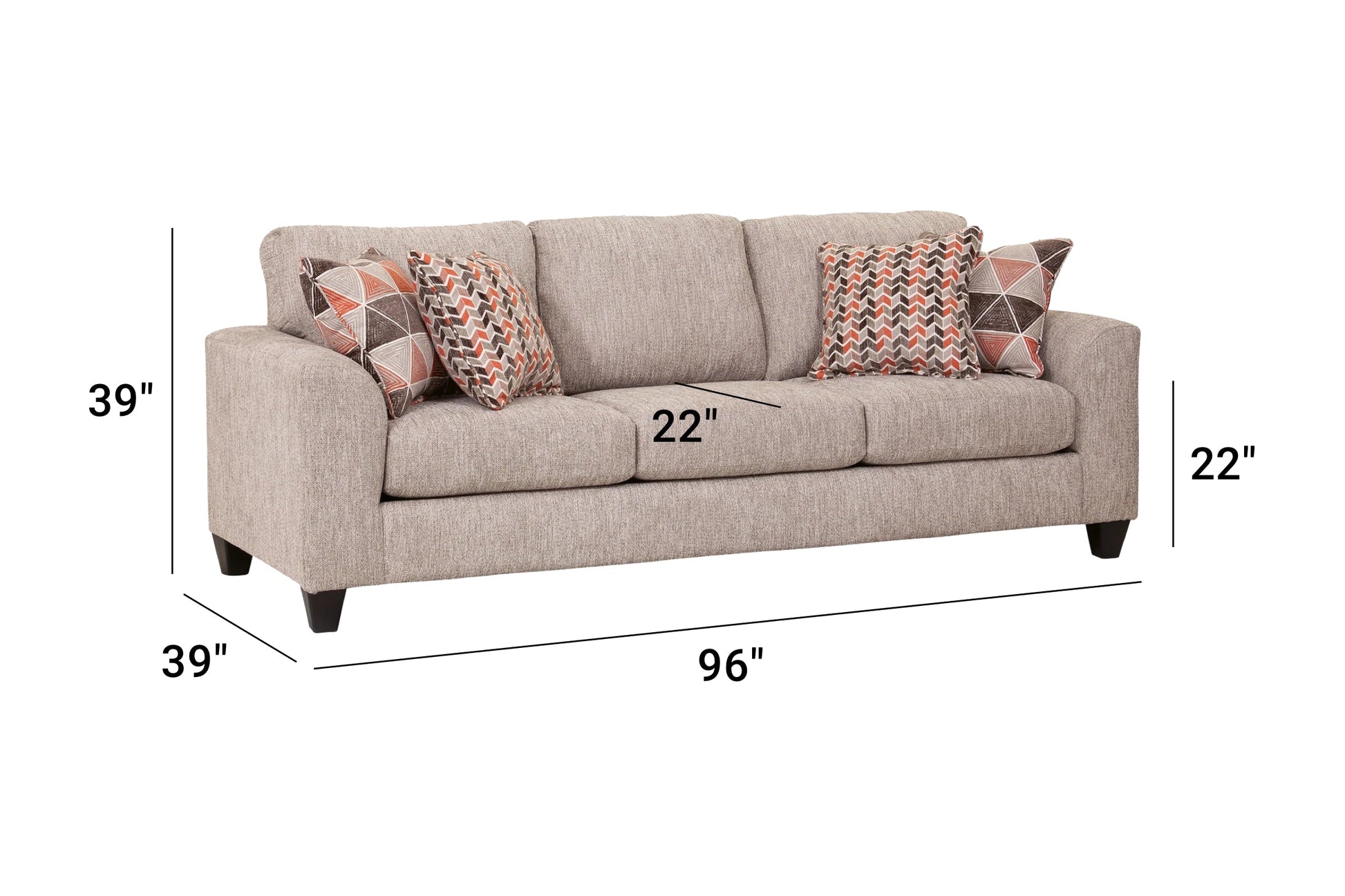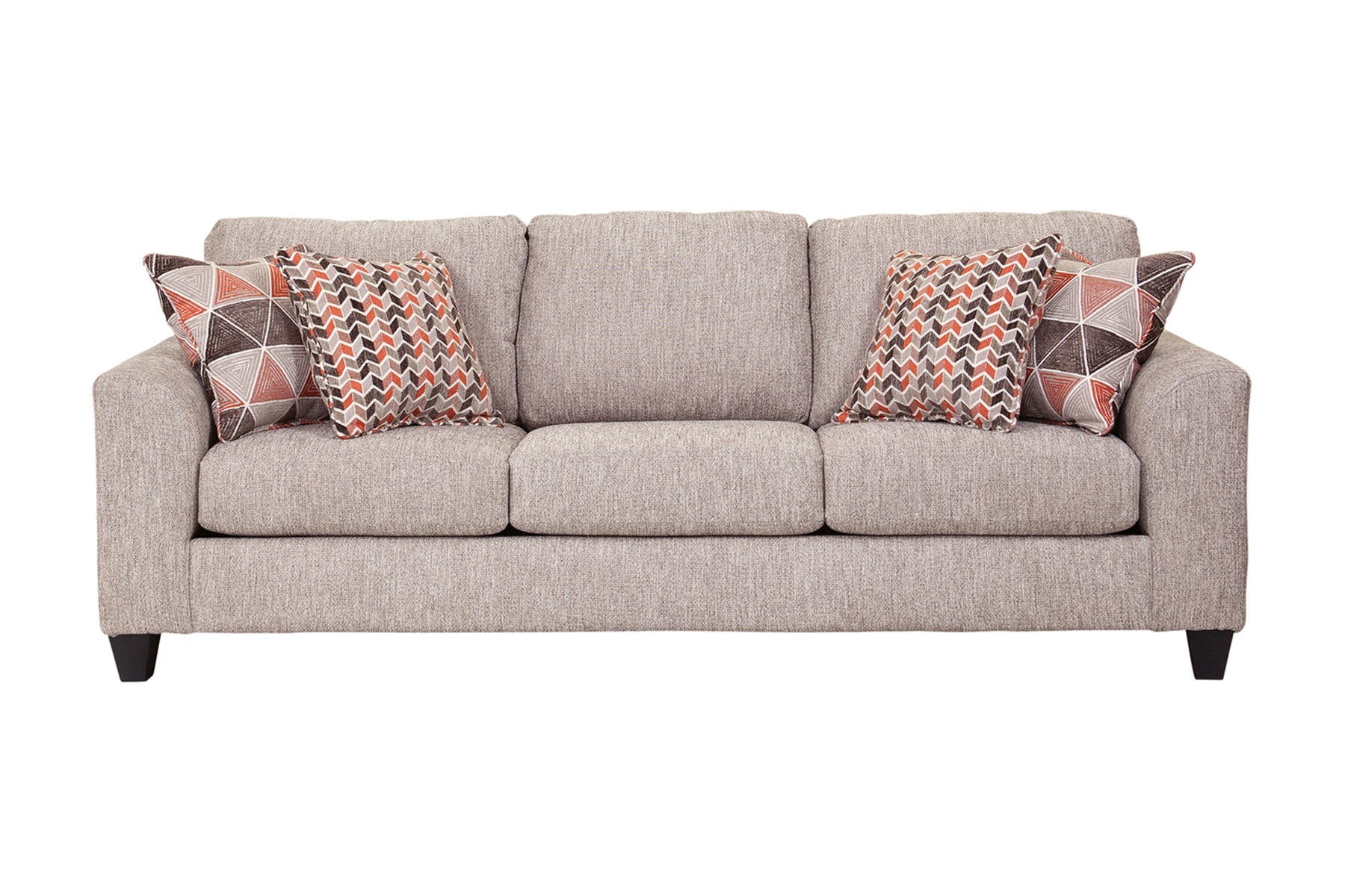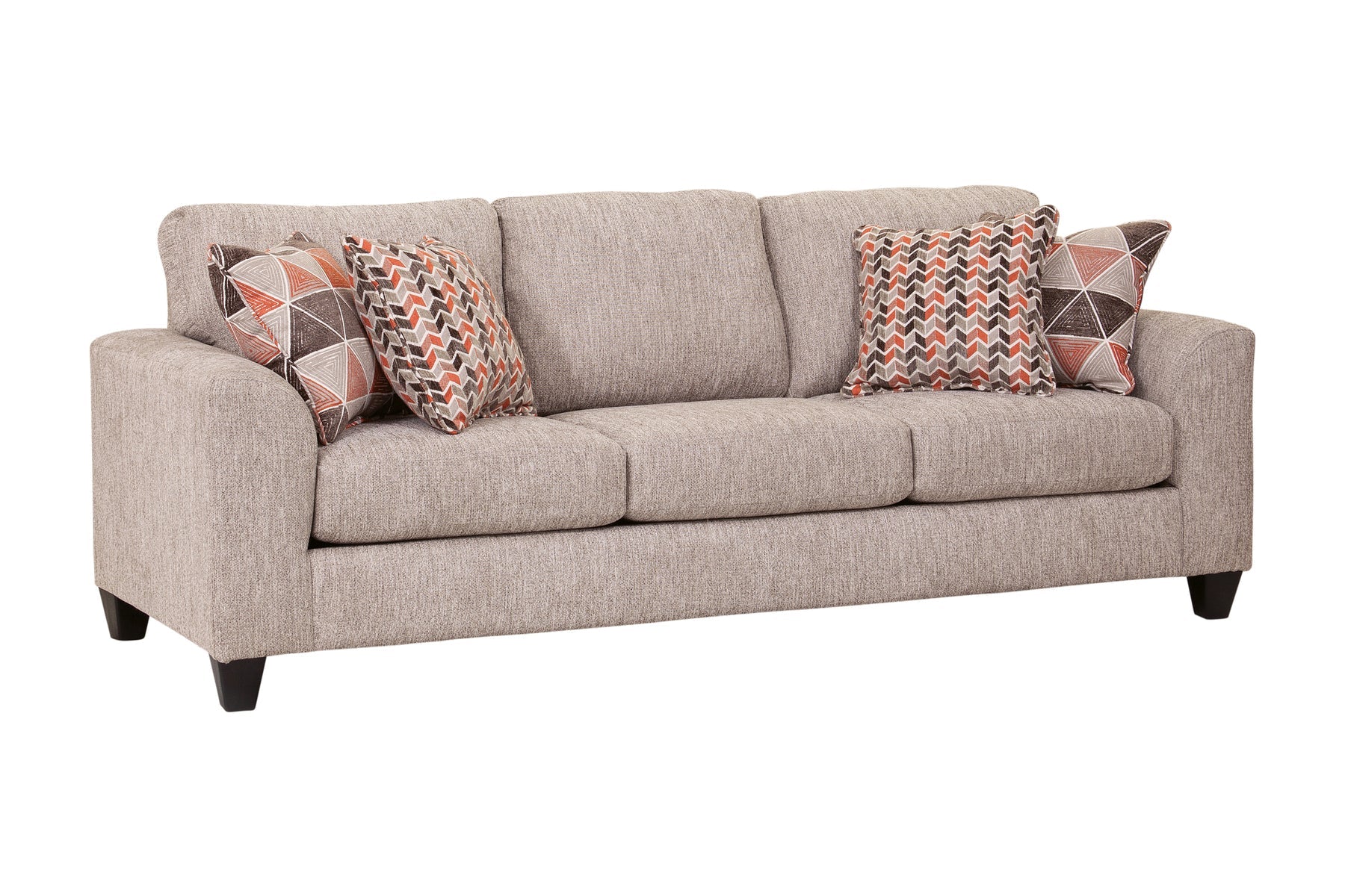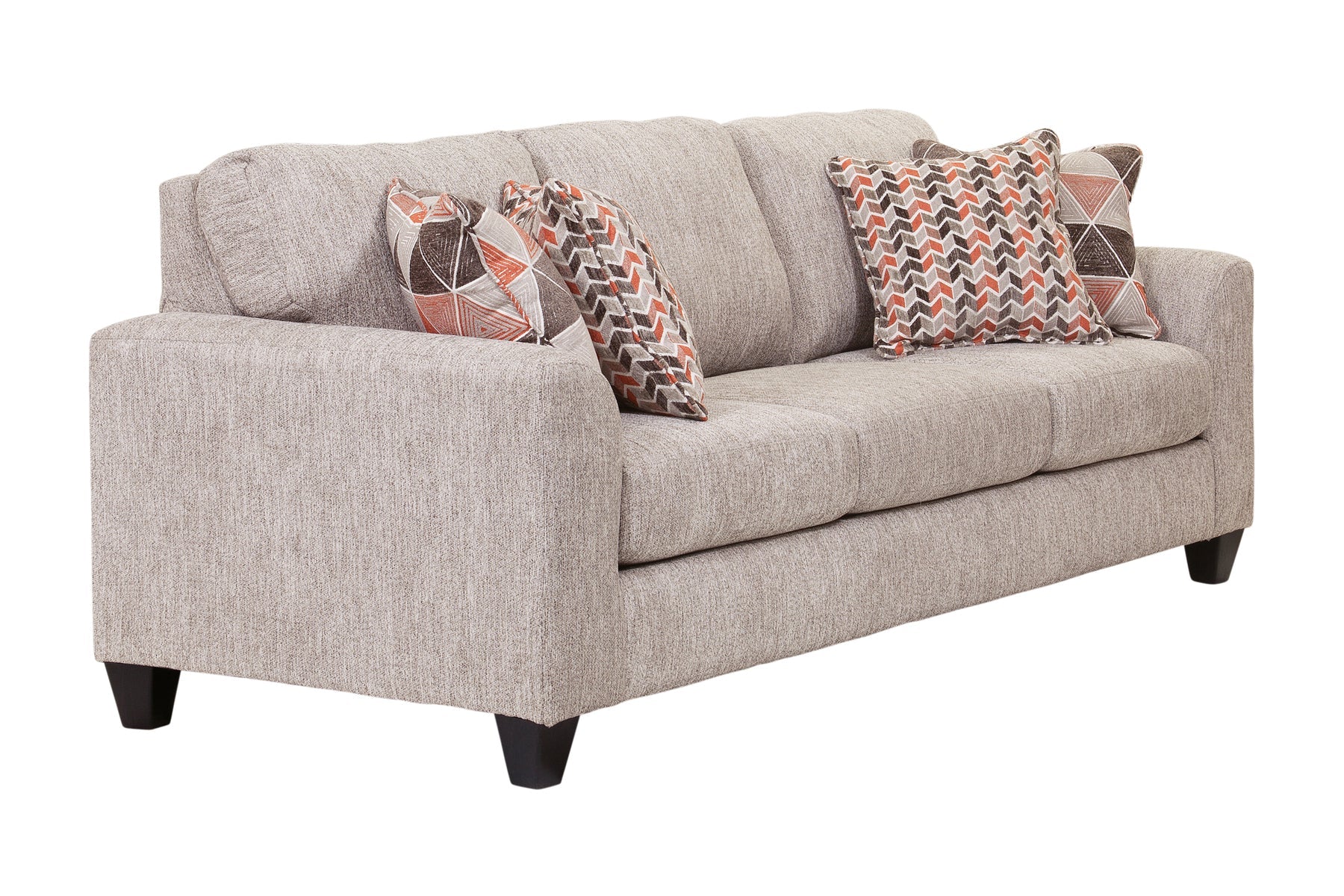 This sofa sleeper has a drop down console that includes cup holders and some storage. All of that included in a modern three over three seat and back cushion profile that is also a pull out sofa. The console can be closed to look like a typical sofa. The all over fabric is a soft chenille in shades of brown and ivory. The accent pillows are geometric designs that have an ivory background with brown and orange patterns. The seat cushions are reversible for added wear and tear. Sit or sleep.