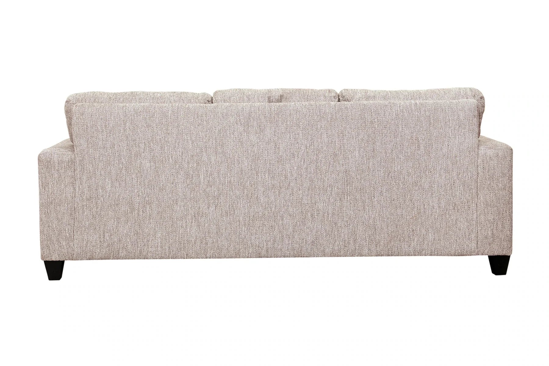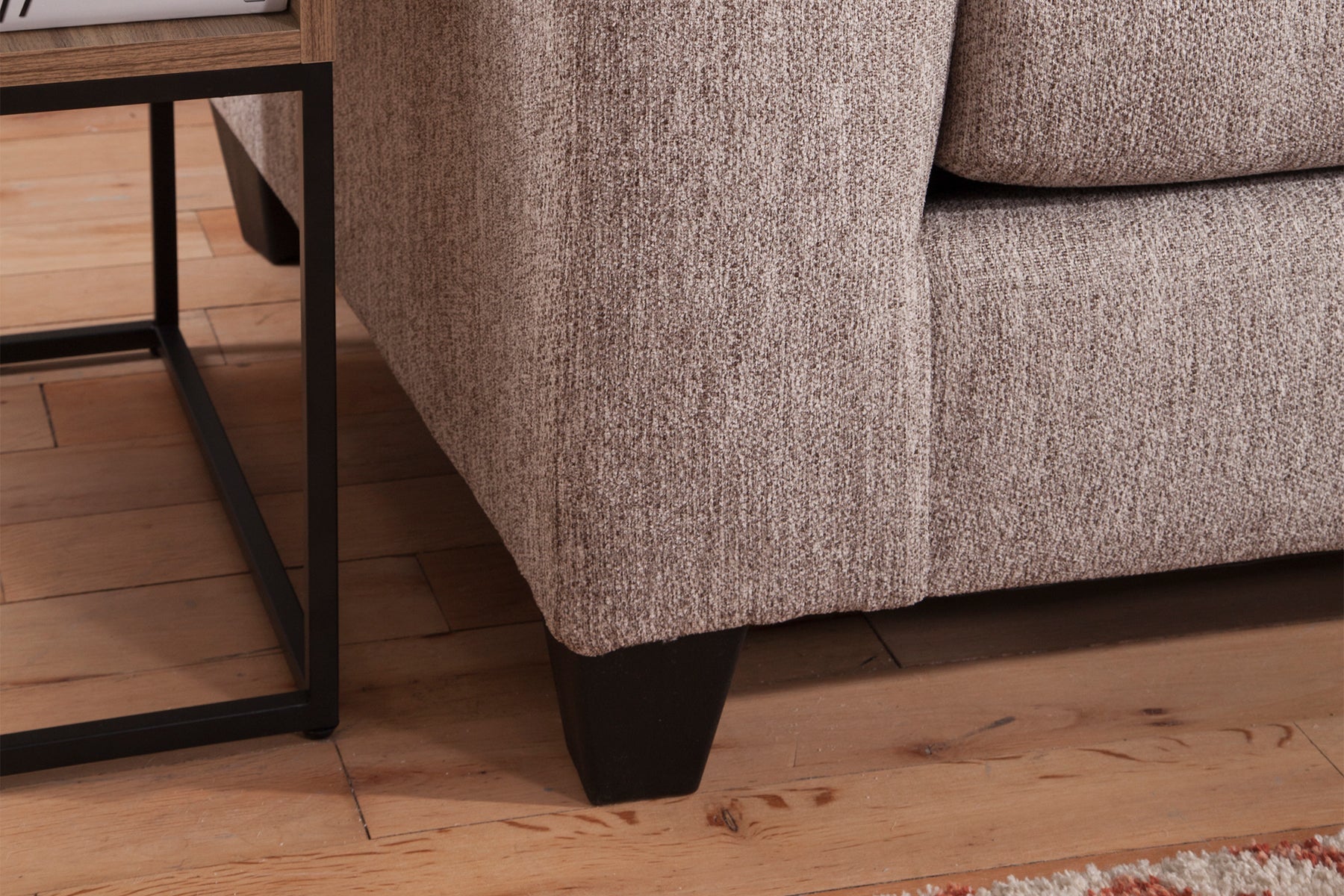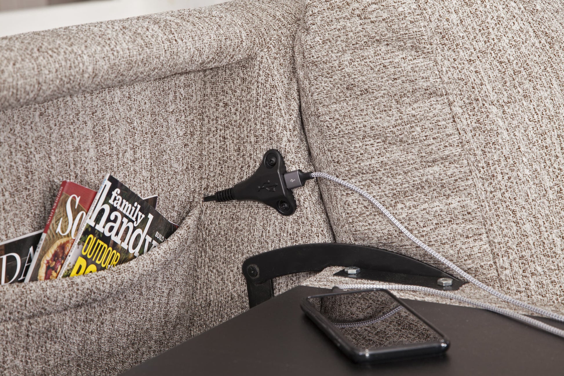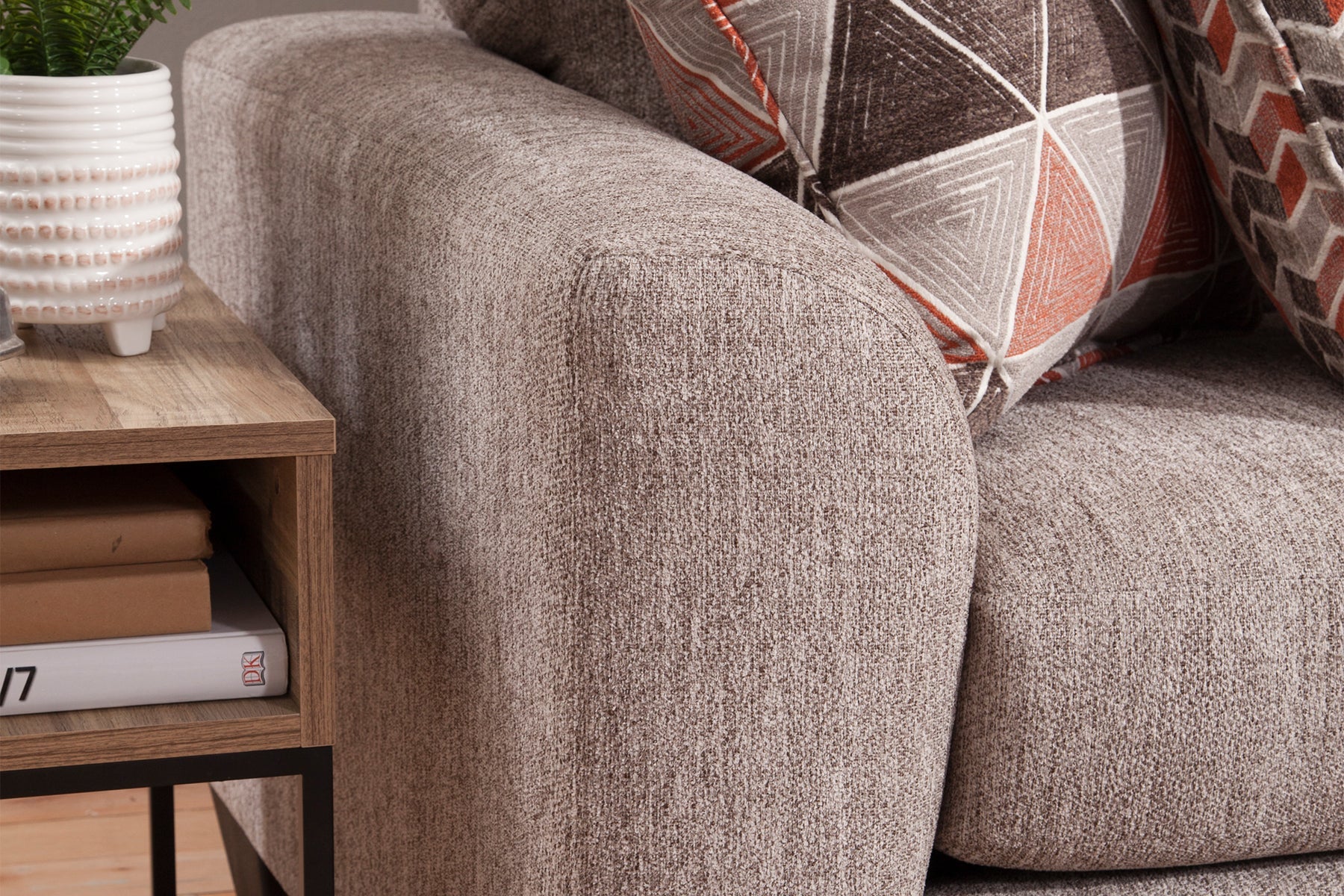 This sofa sleeper has a drop down console that includes cup holders and some storage. All of that included in a modern three over three seat and back cushion profile that is also a pull out sofa. The console can be closed to look like a typical sofa. The all over fabric is a soft chenille in shades of brown and ivory. The accent pillows are geometric designs that have an ivory background with brown and orange patterns. The seat cushions are reversible for added wear and tear. Sit or sleep.