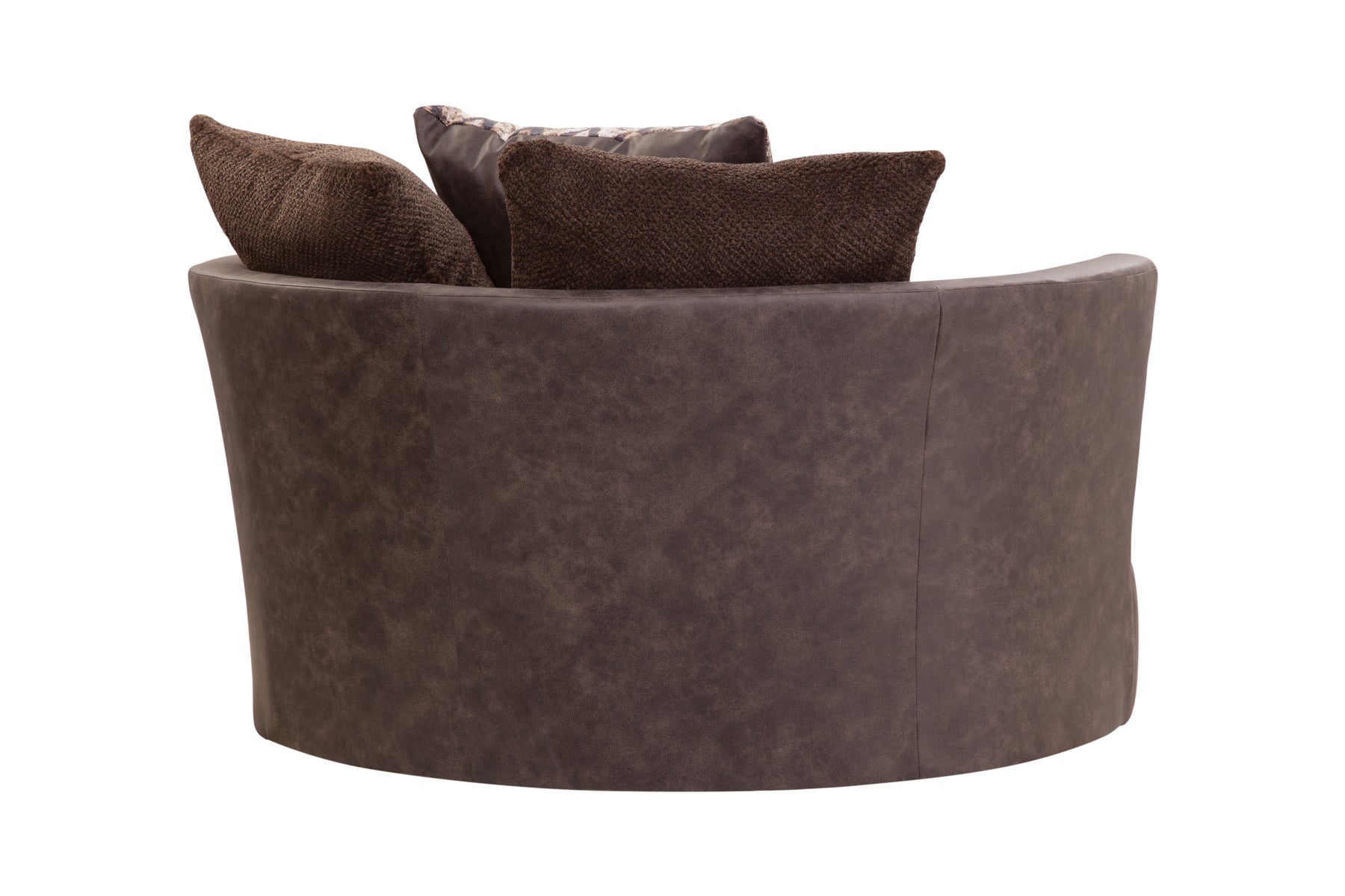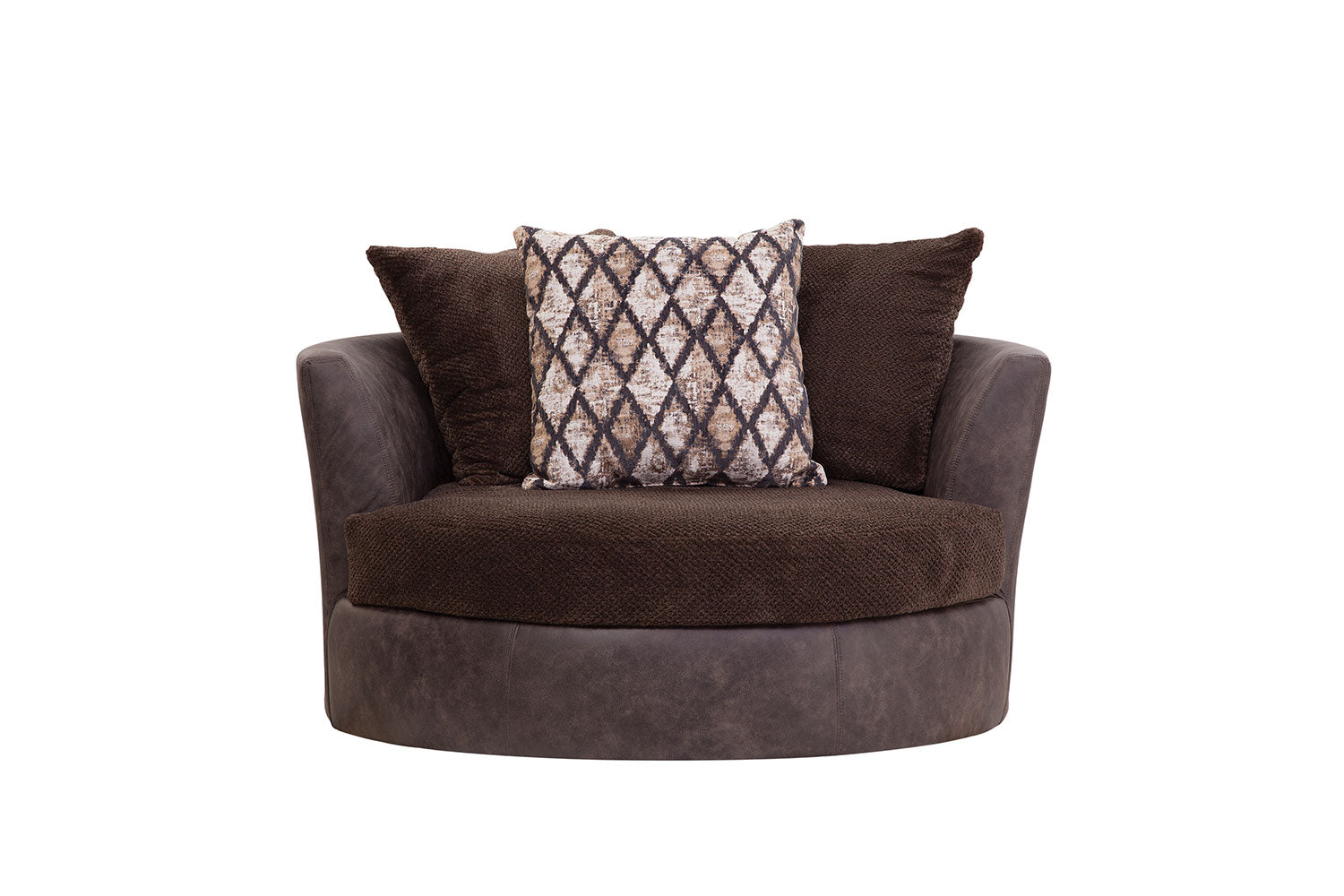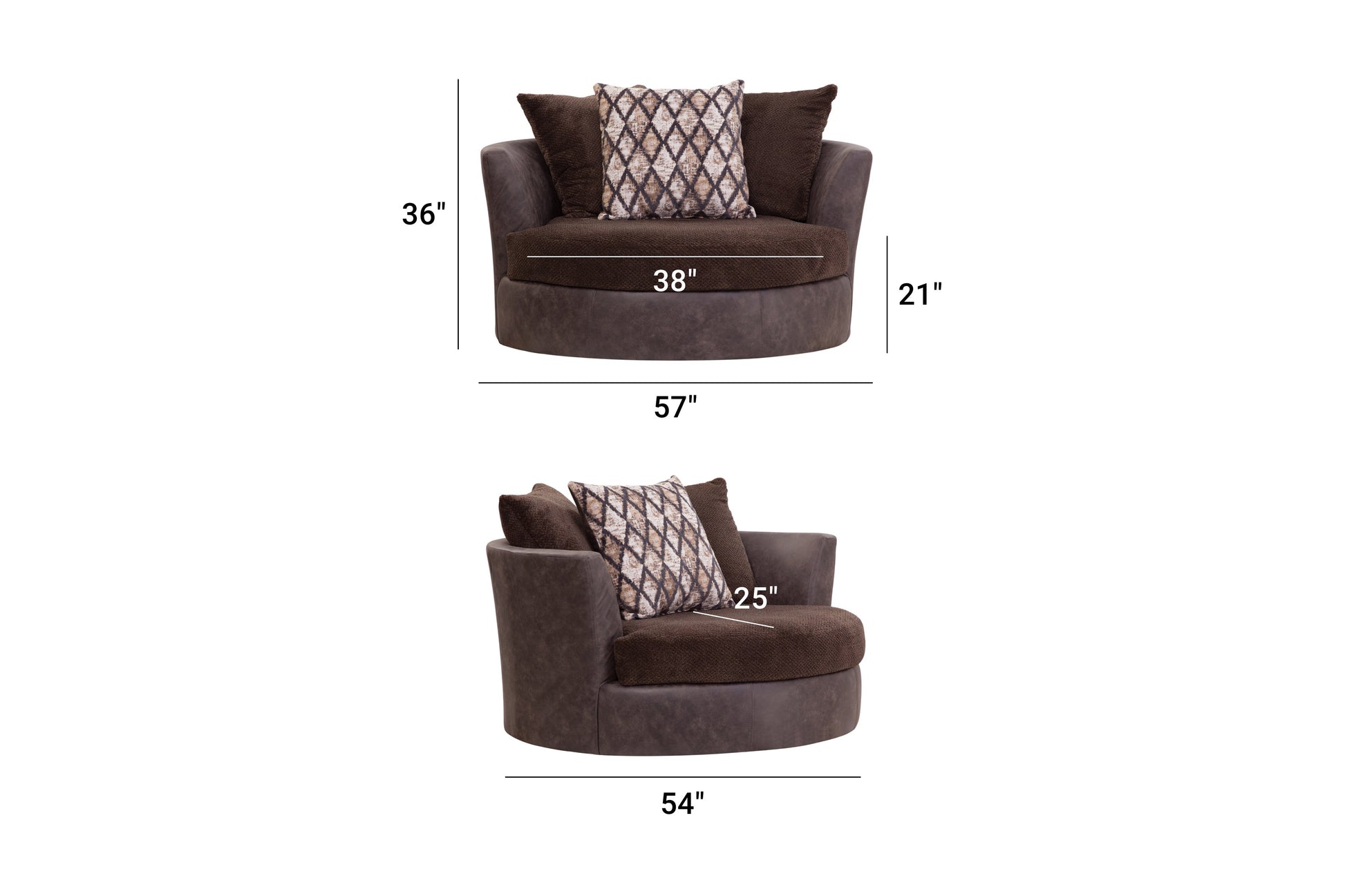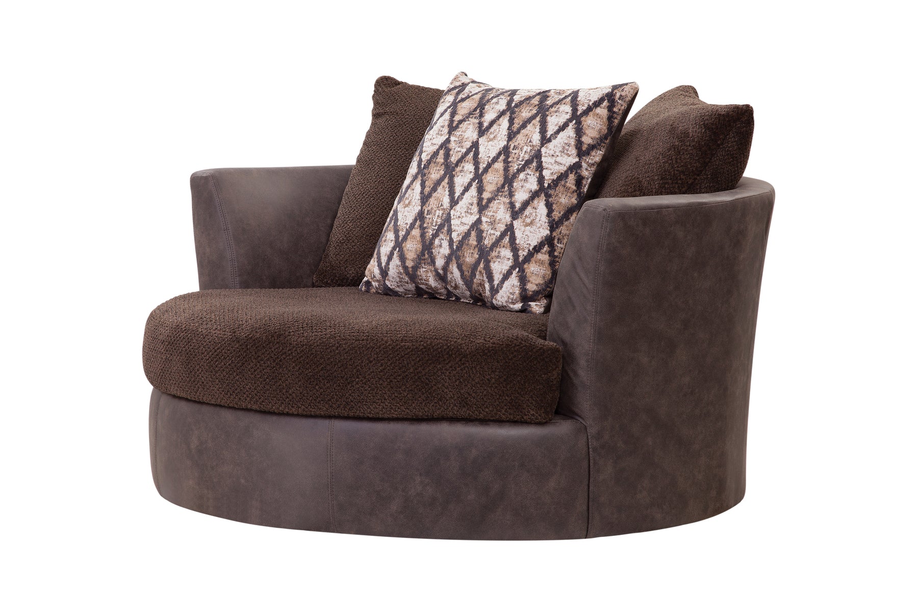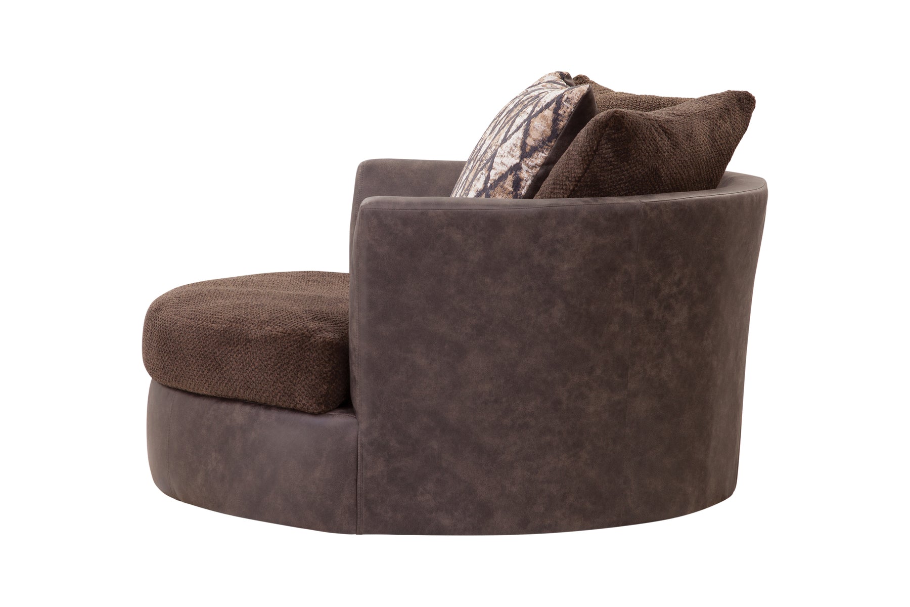 This swivel barrel chair's main characteristic is comfort! This two-tone chair combines soft plush fabric seating with durable vegan leather for both comfort and durability. The color scheme is a rich chocolate brown with touches of black and fur accents. The seat and back cushions are reversible for wear and tear. This is an oversized chair and will fit into a medium to large floor plan.